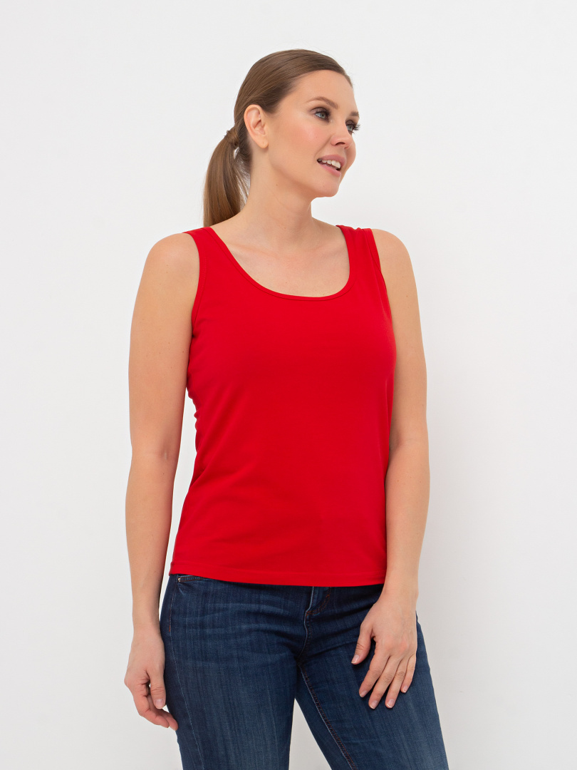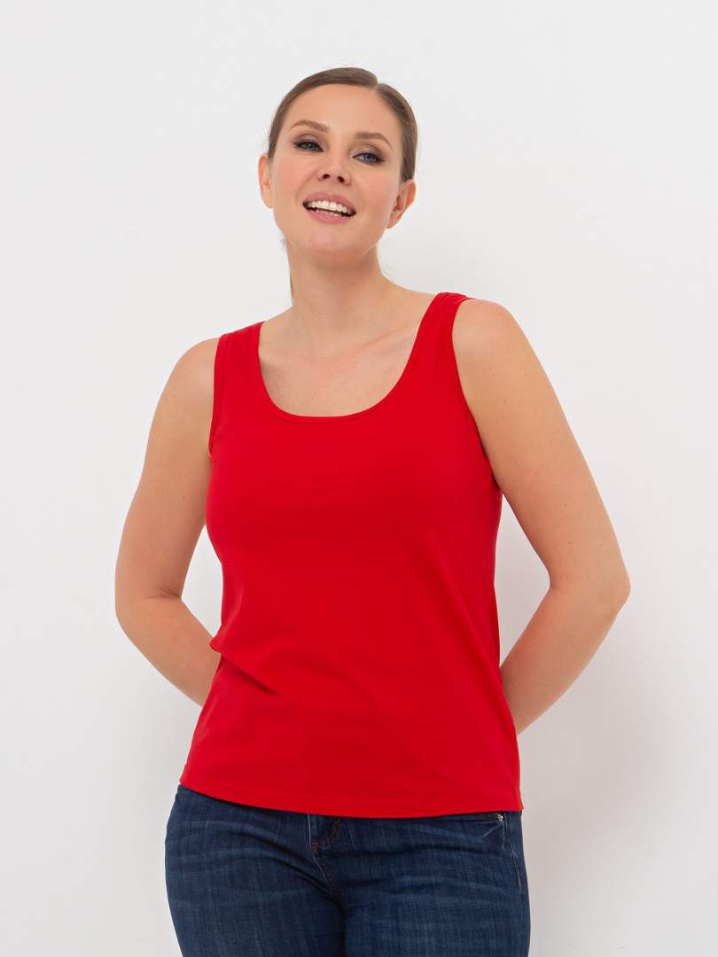 Майка из тонкого хлопка с лайкрой. Модель приталенного покроя. По пройме и горловине окантовка из того же материала. В левый боковой шов вшит «флажок» из отделочной ткани.