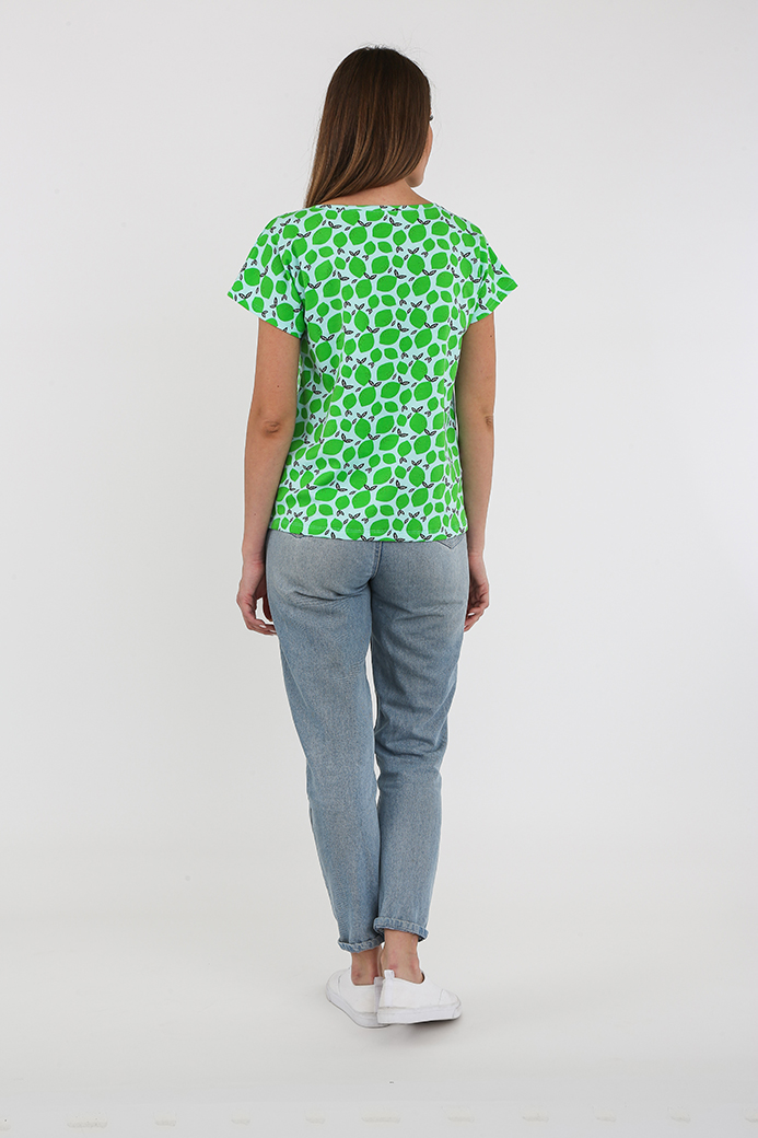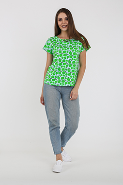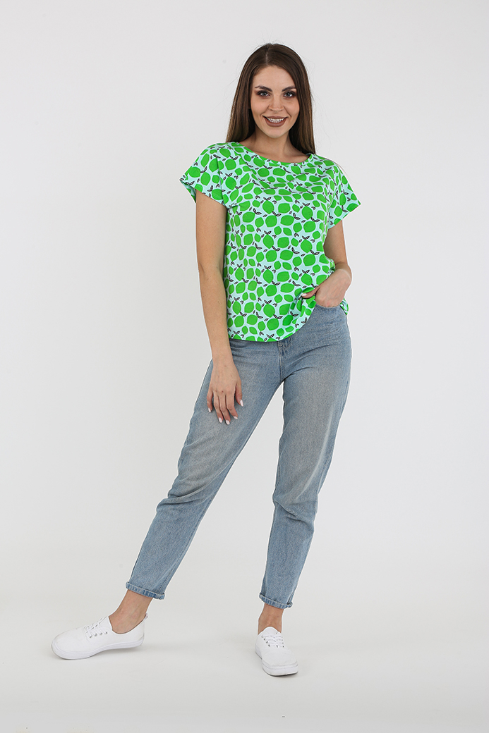 Футболка средней длины из трикотажа. Покрой свободный. Рукав кимоно. Вырез горловины круглый.
