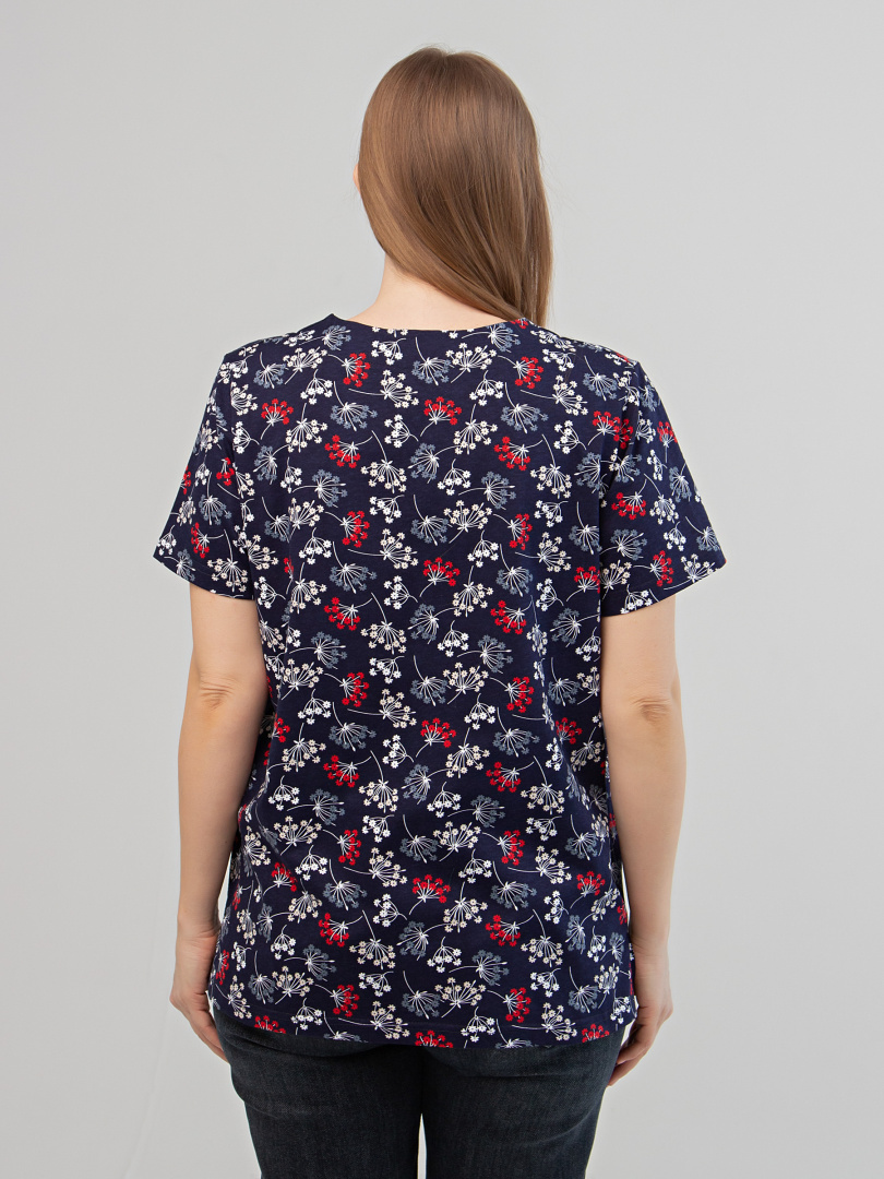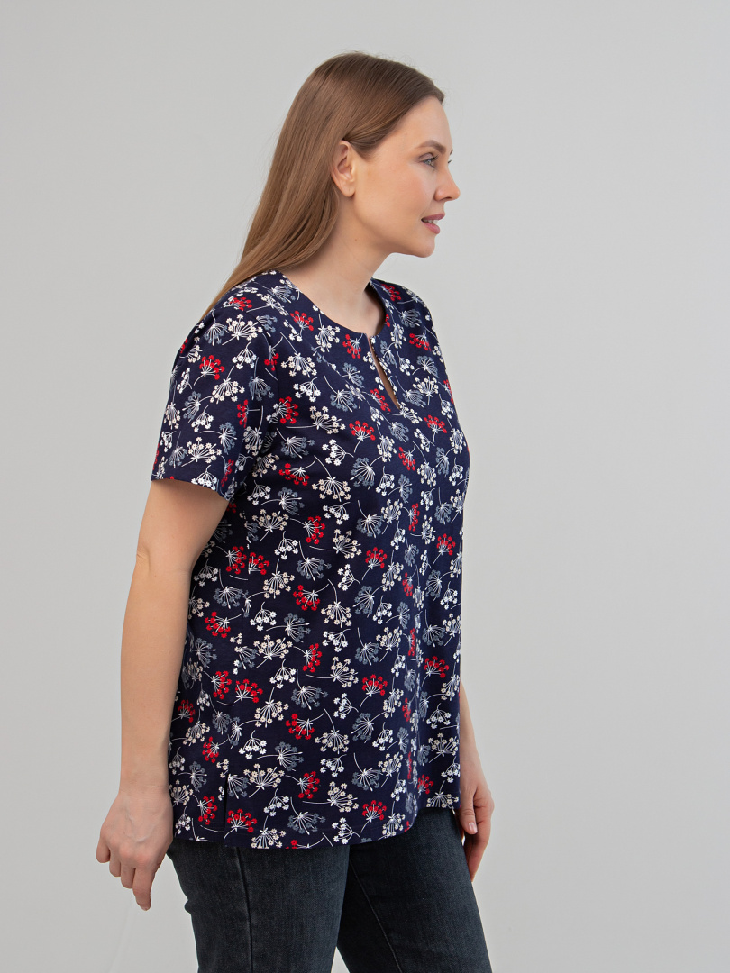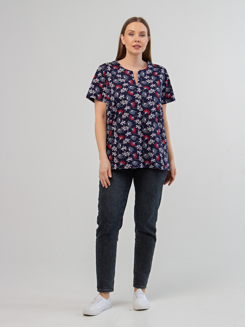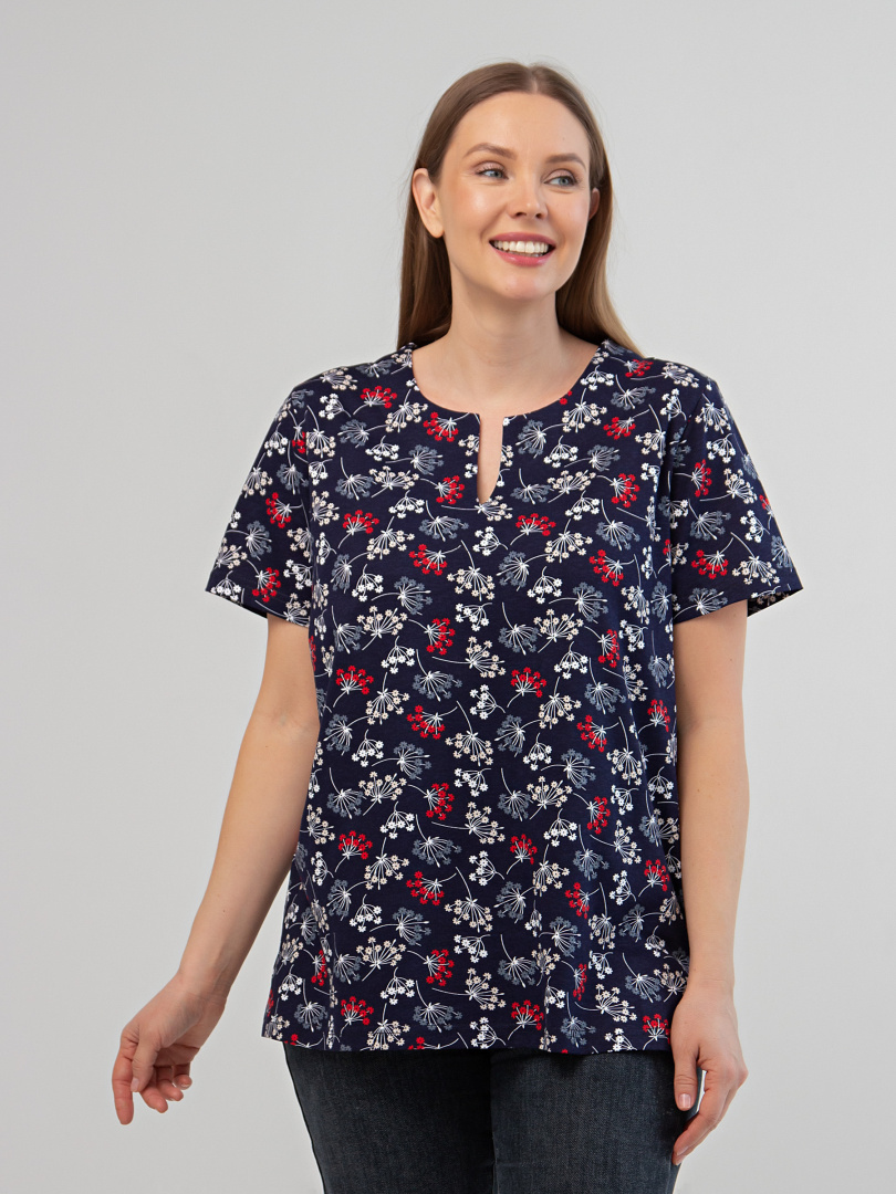 Трикотажная блуза средней длины прямого силуэта. Низ боковых швов оформлен разрезами. Модель имеет короткий втачной рукав и фигурный вырез горловины.