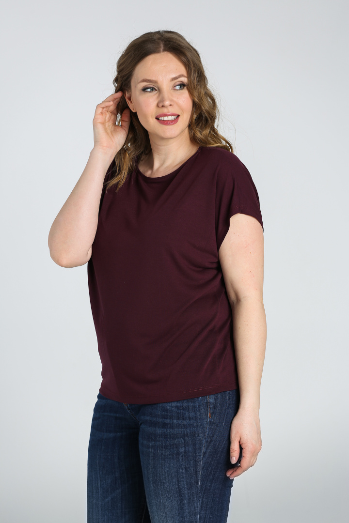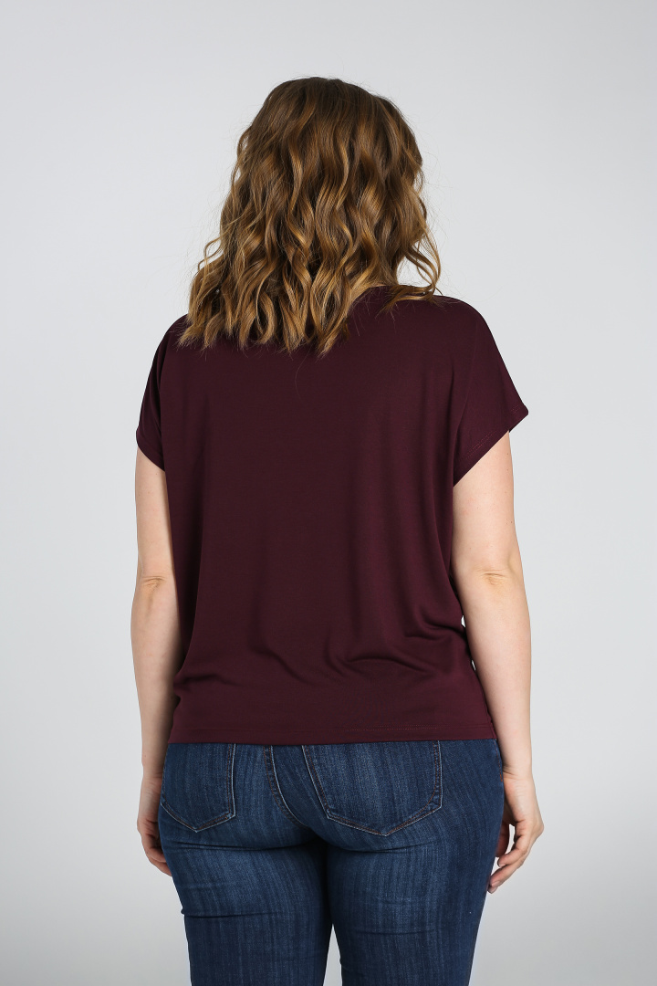 Блуза средней длины, выполнена из вискозы. Покрой свободный, со спущенным цельнокроеным рукавом. Вырез круглый.