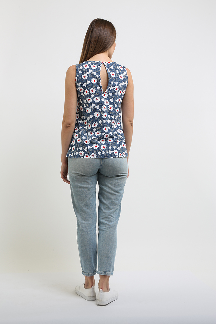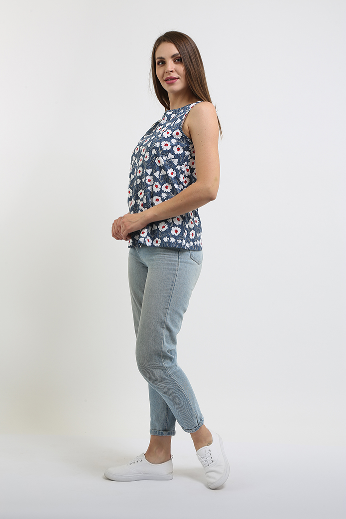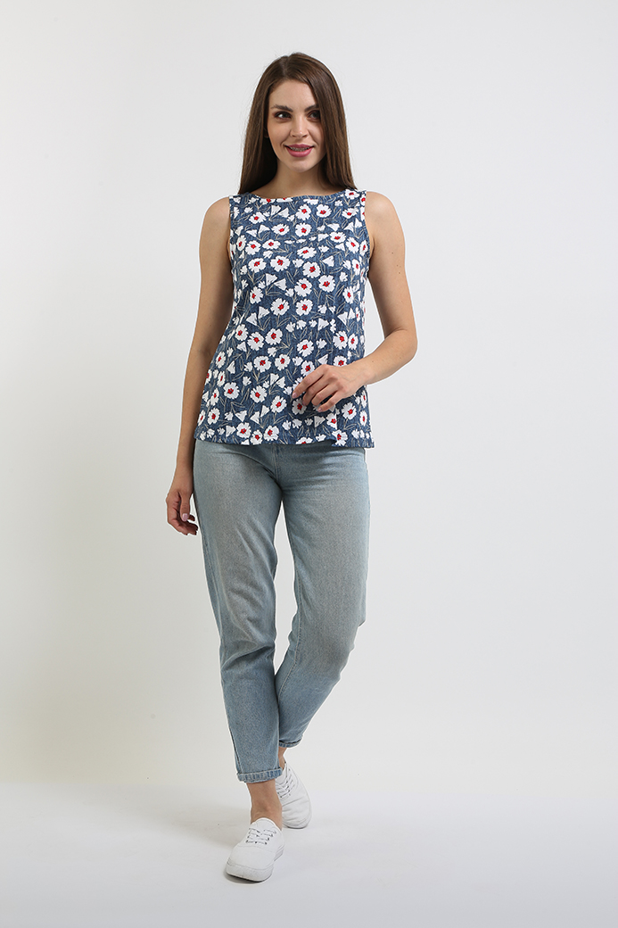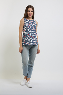 Блуза средней длины, выполнена из хлопкового трикотажа. Модель прилегающего силуэта. Изделие без рукава. Горловина круглая, на спинке щель с застежкой на одну пуговицу.