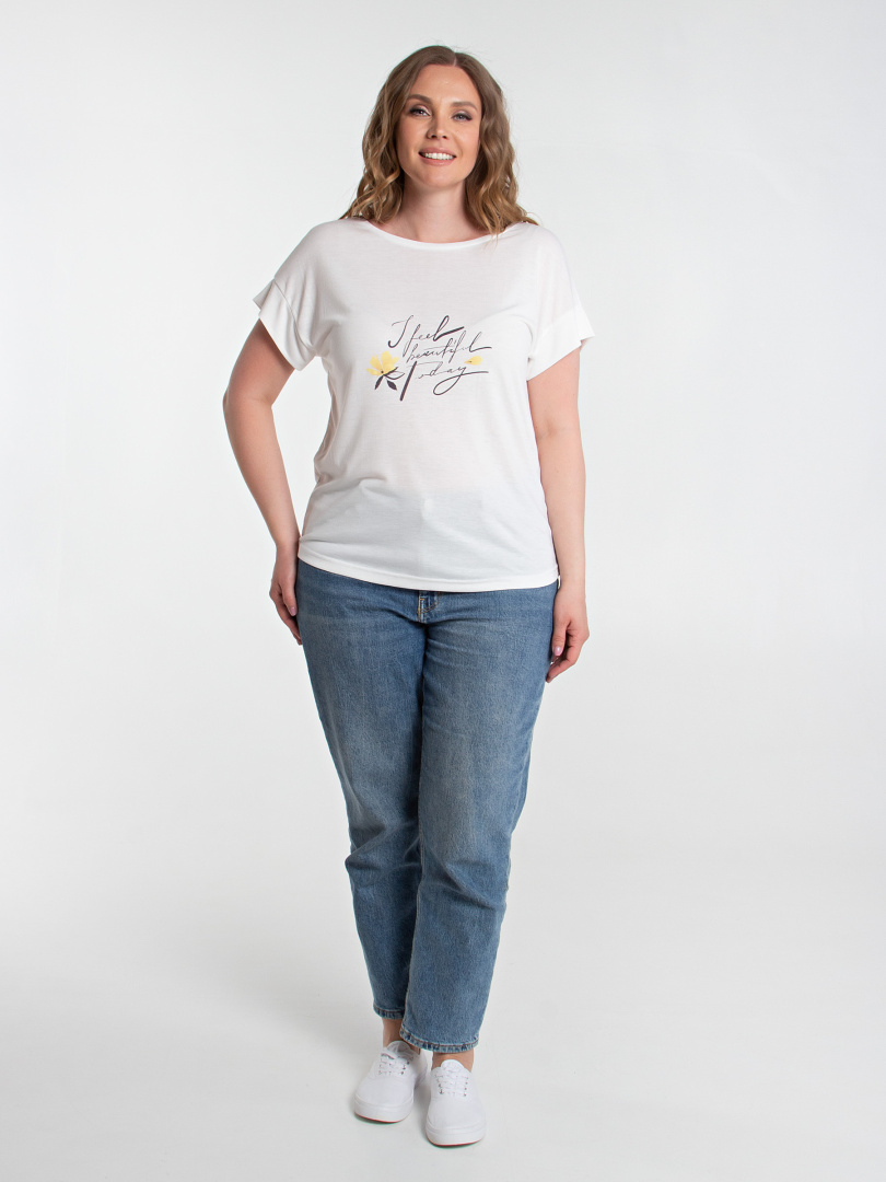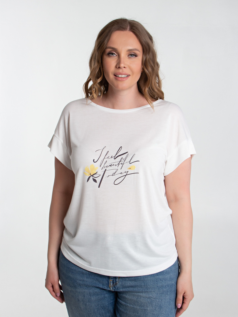 Блуза средней длины из трикотажа. Перед декорирован контрастным принтом. Покрой свободный, со спущенным рукавом. Вырез круглый.