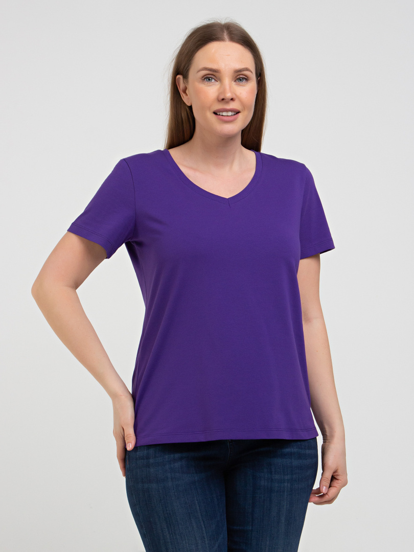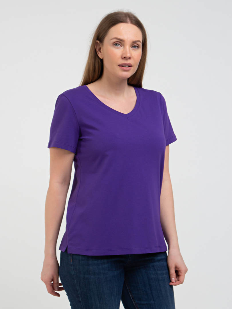 Футболка средней длины прилегающего силуэта из тонкого хлопка с лайкрой. Модель имеет короткий втачной рукав и V-образный вырез горловины.