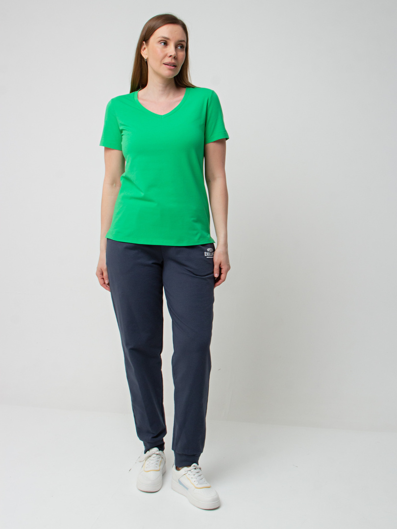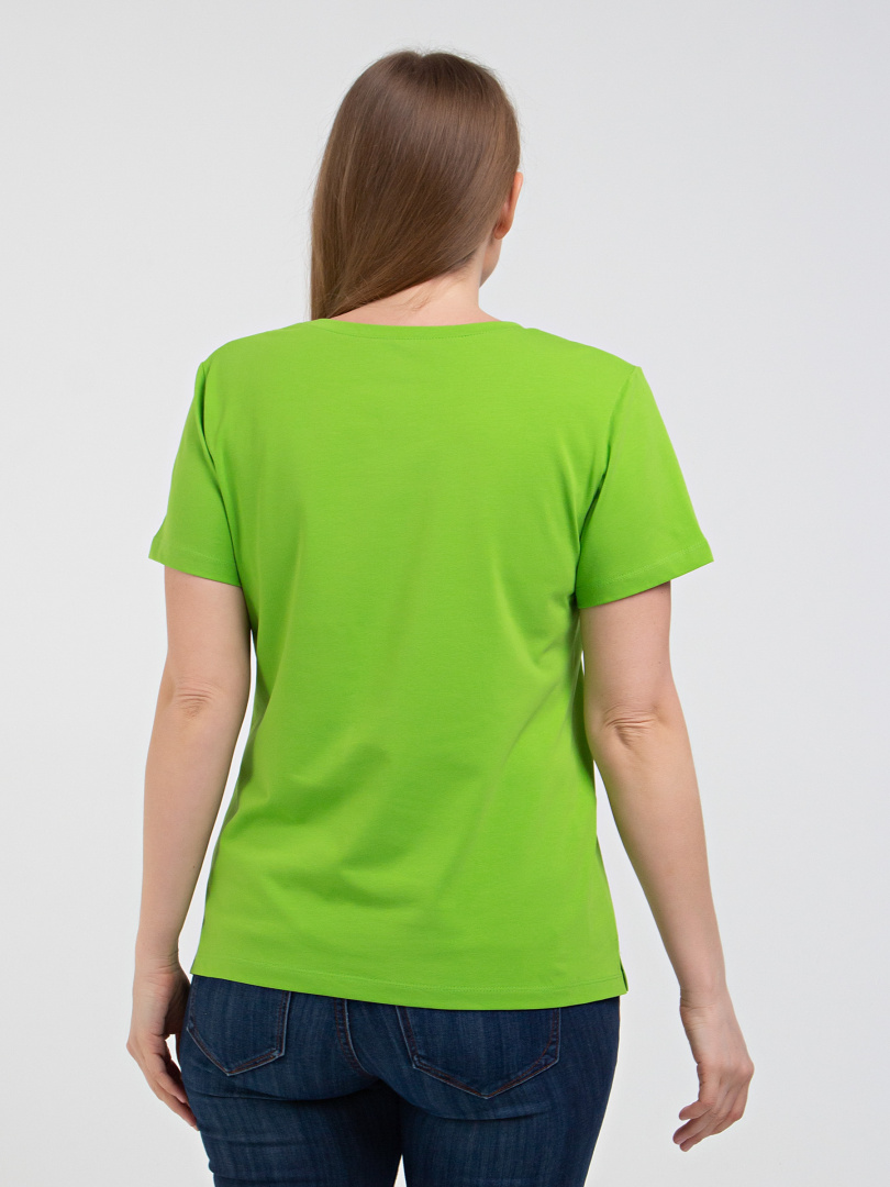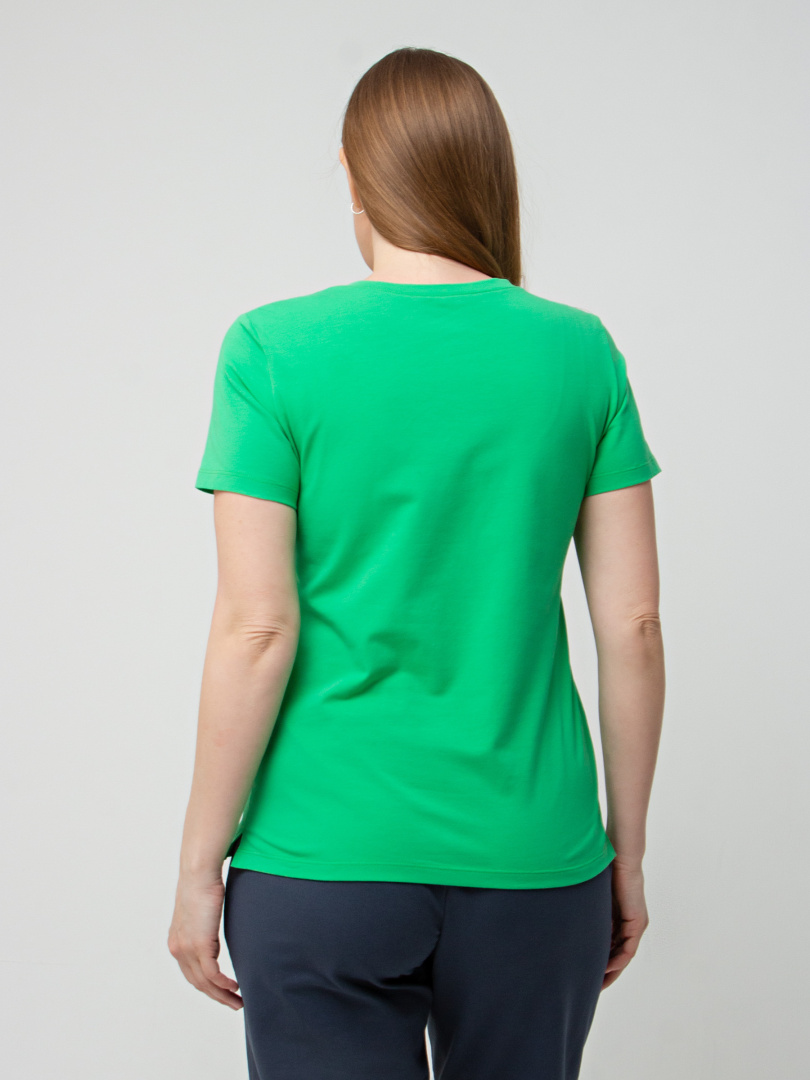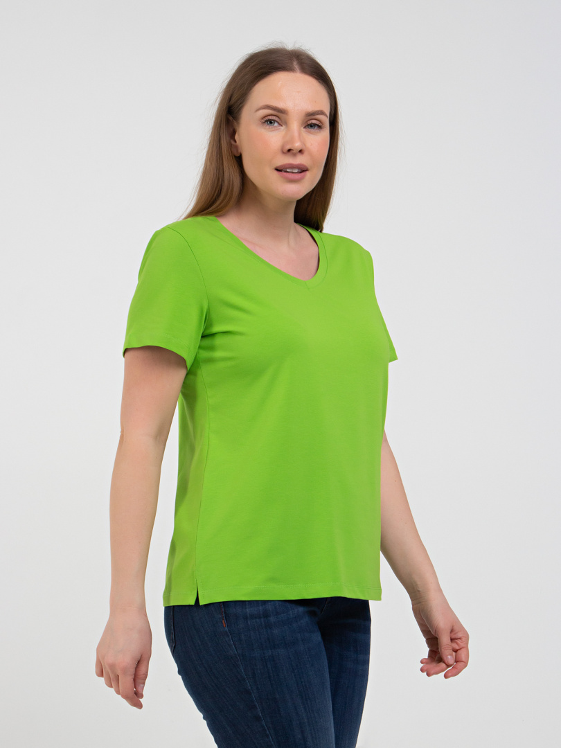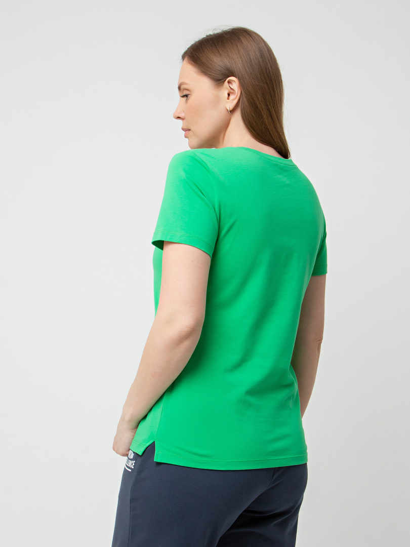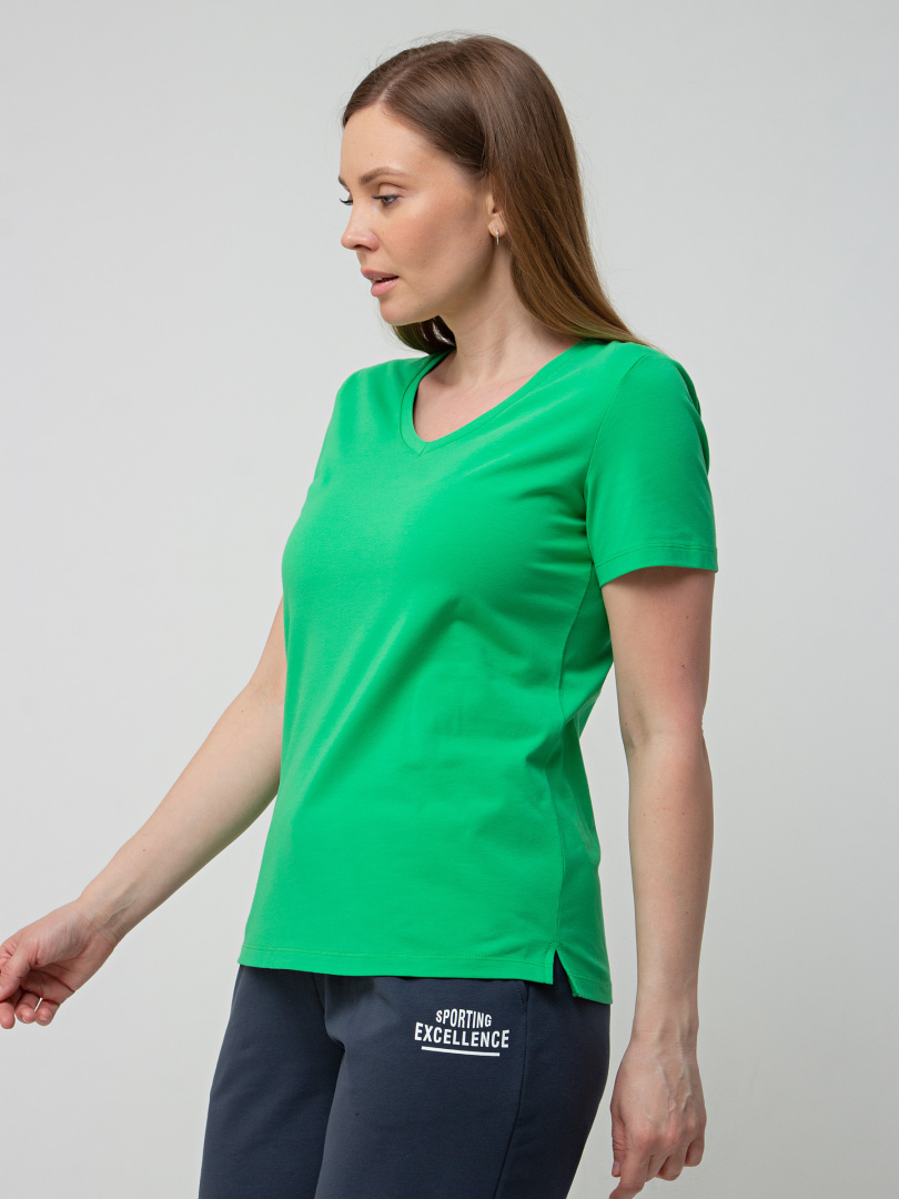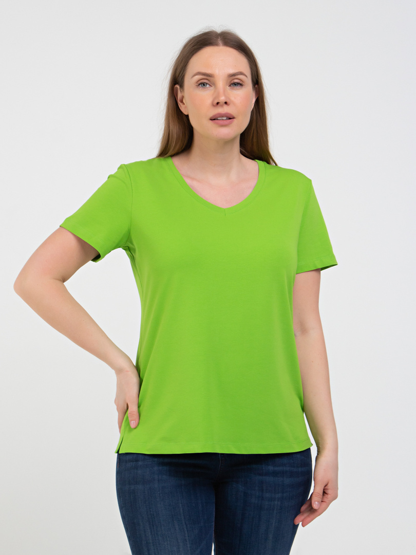 Футболка средней длины прилегающего силуэта из тонкого хлопка с лайкрой. Модель имеет короткий втачной рукав и V-образный вырез горловины.