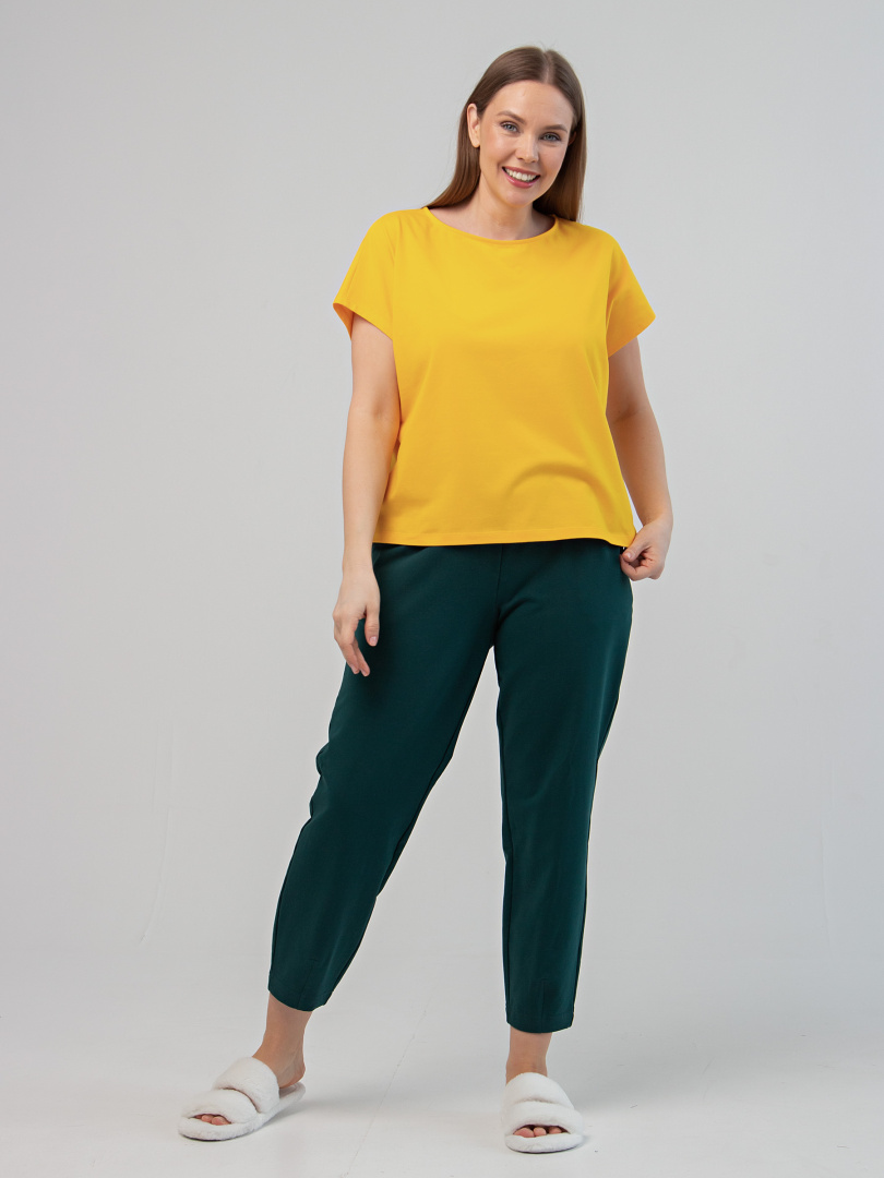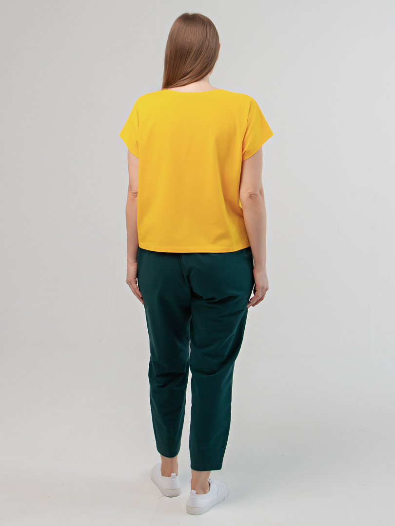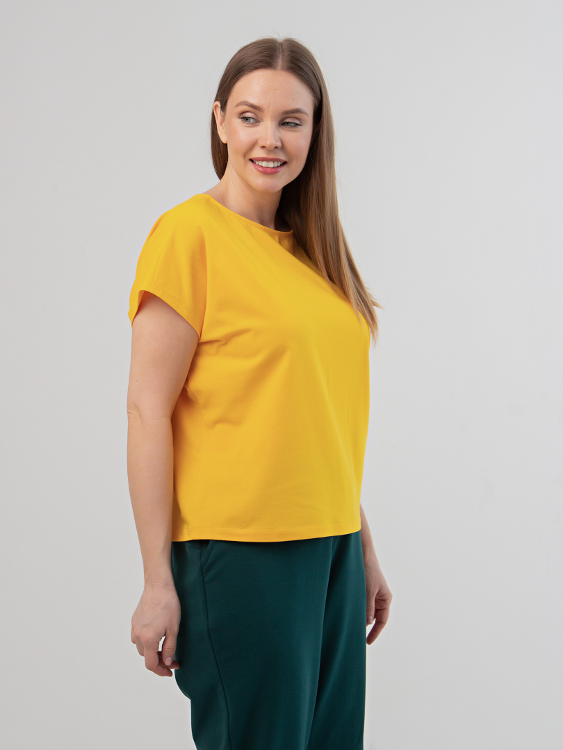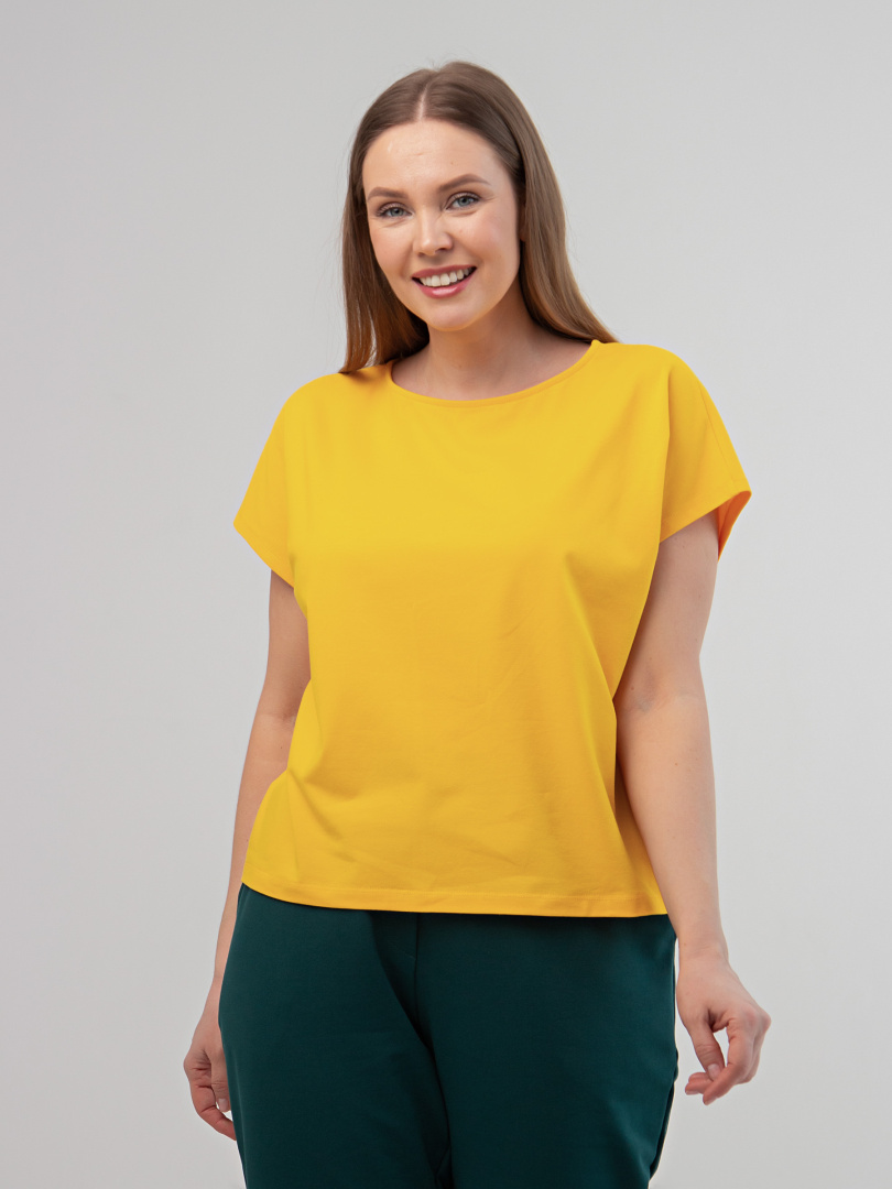 Блуза средней длины, выполнена из трикотажа. Покрой свободный, со спущенным цельнокроеным рукавом. Вырез круглый.
