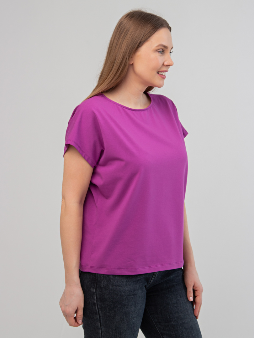 Блуза средней длины, выполнена из трикотажа. Покрой свободный, со спущенным цельнокроеным рукавом. Вырез круглый.