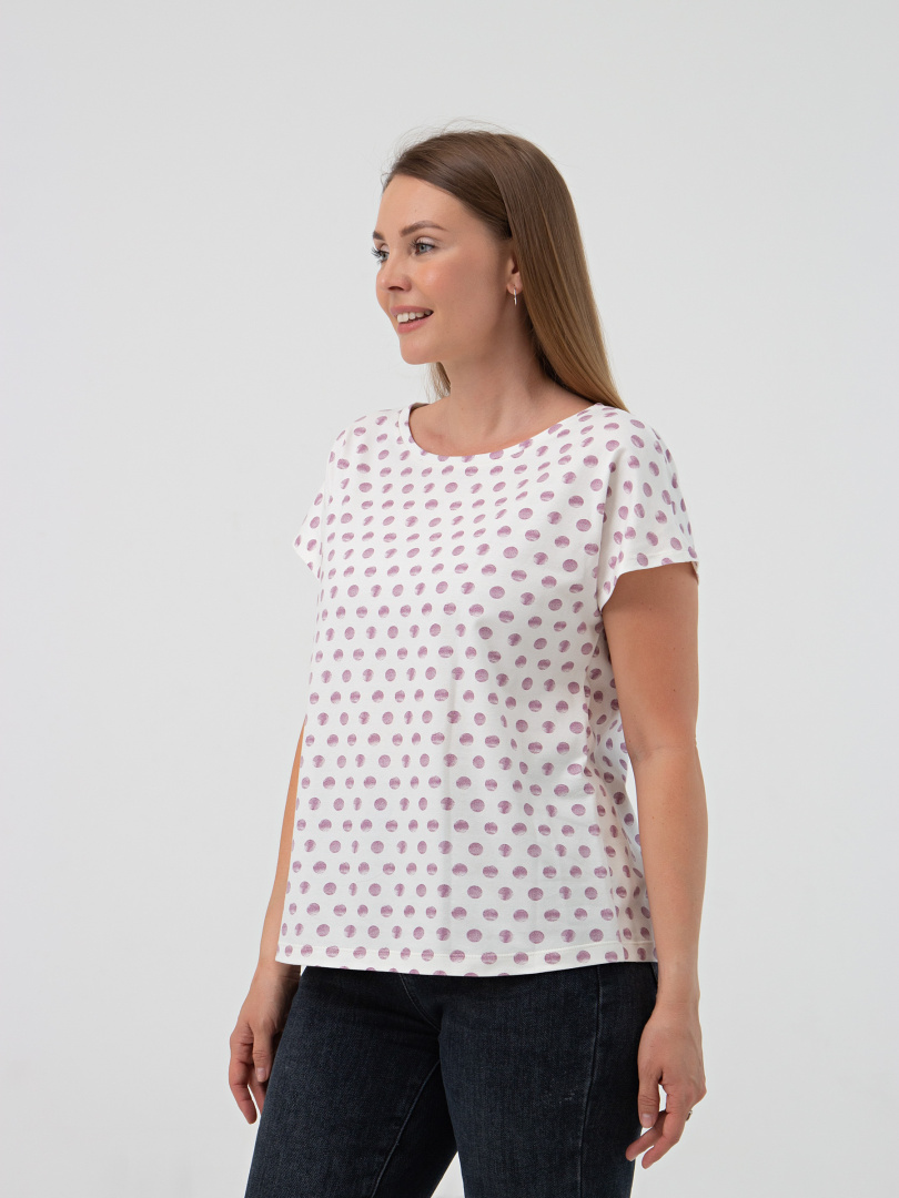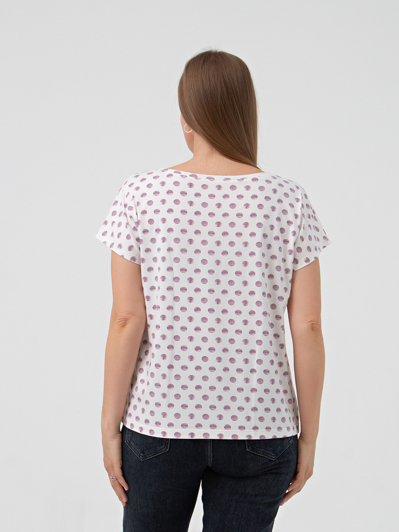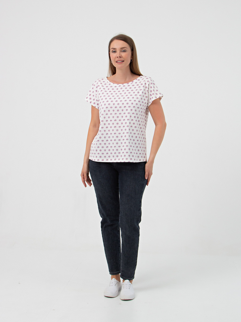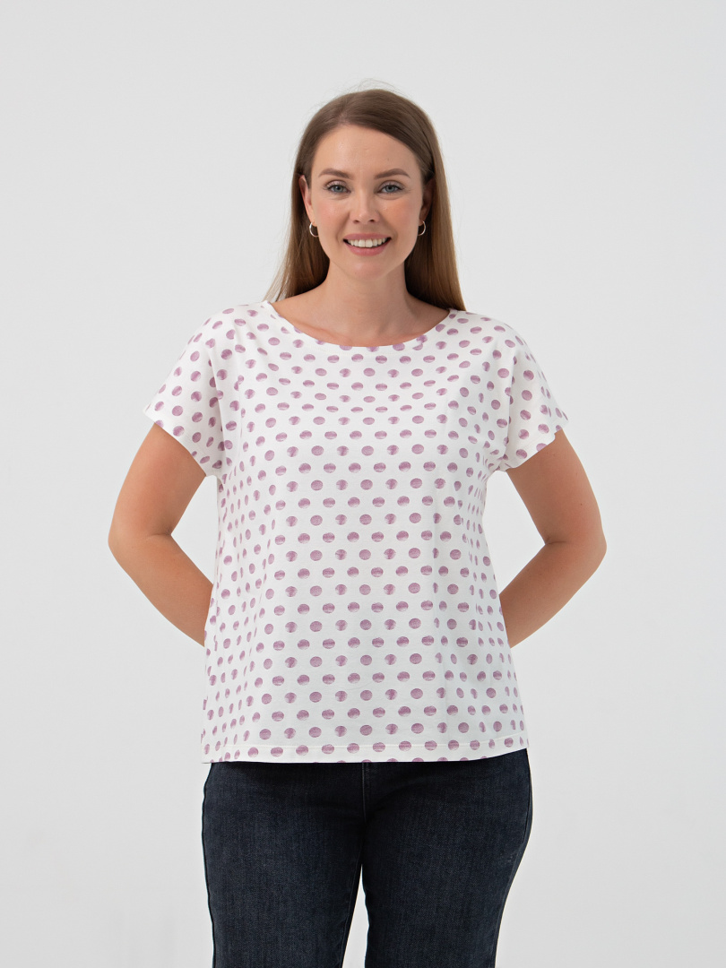 Футболка средней длины из трикотажа. Покрой свободный. Рукав кимоно. Вырез горловины круглый.