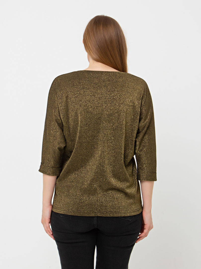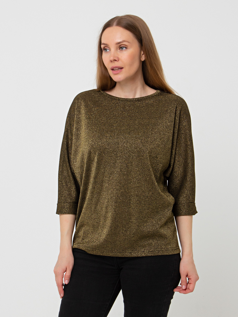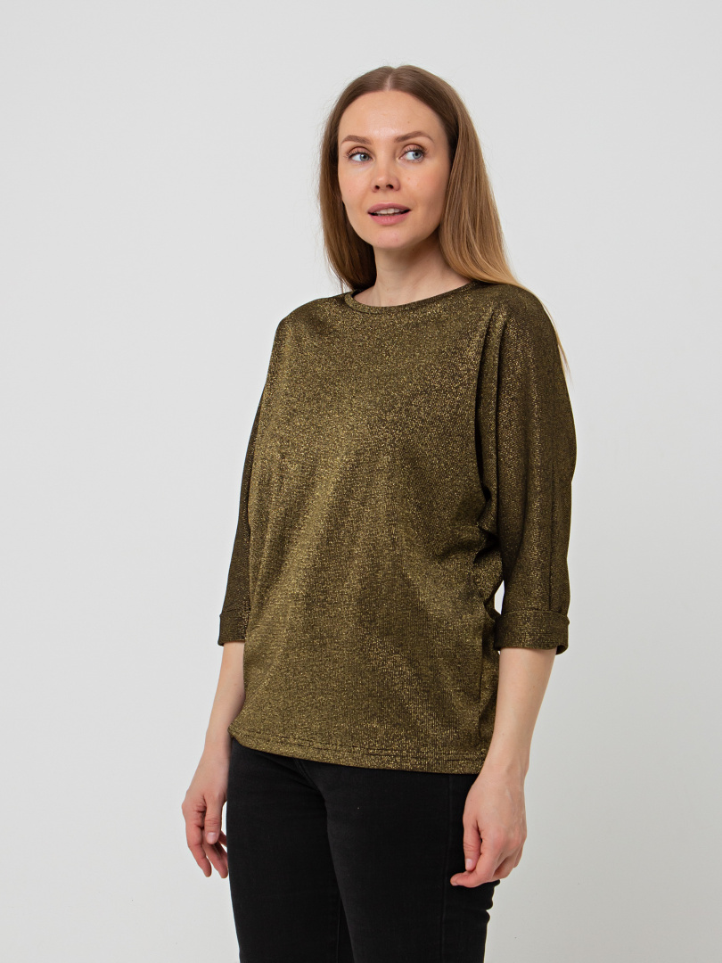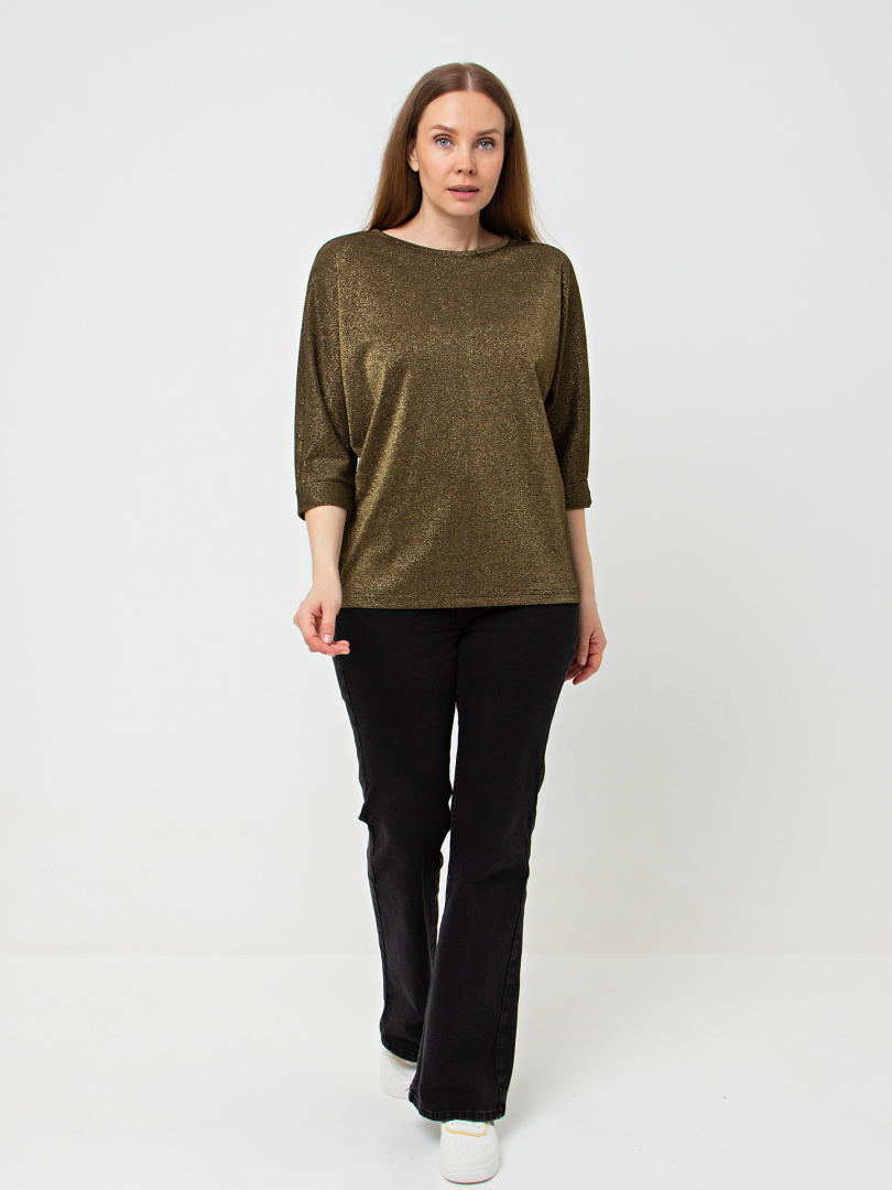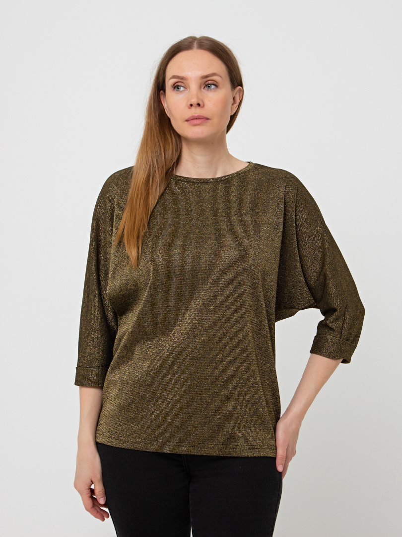 Фуфайка прямого силуэта из трикотажа с люрексом с рукавом «летучая мышь». Модель средней длины. Горловина - лодочка. По низу рукава – отложные манжеты.
