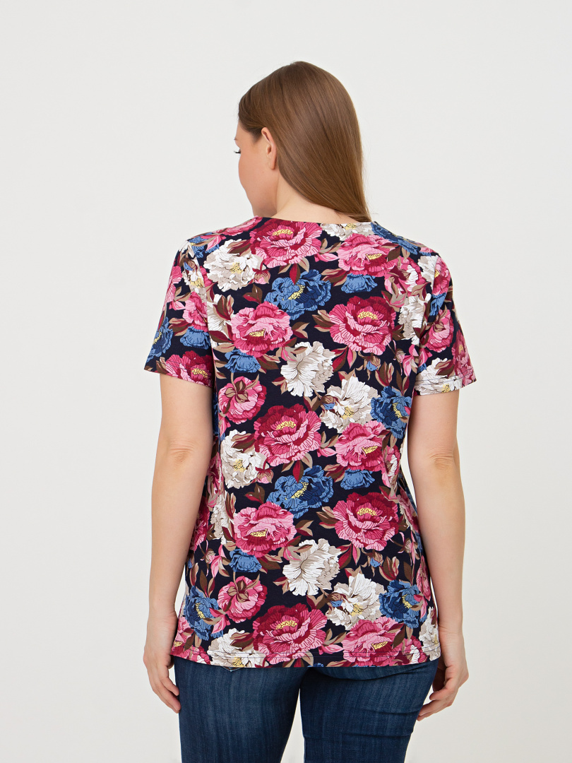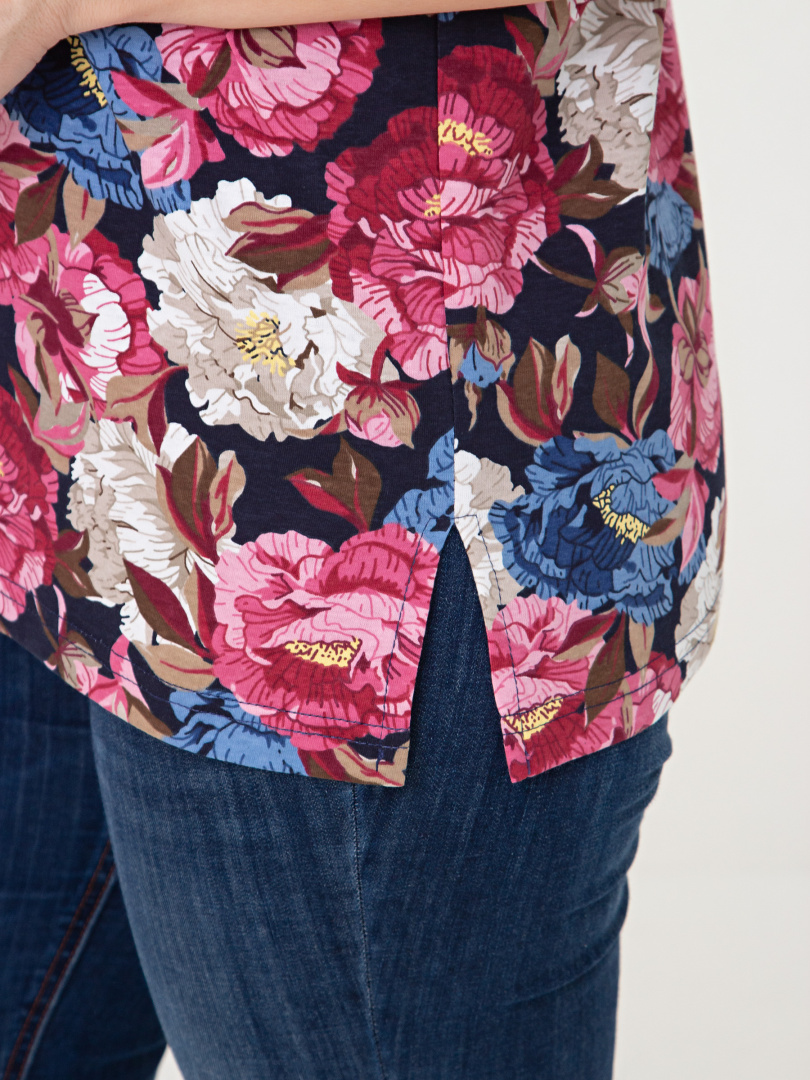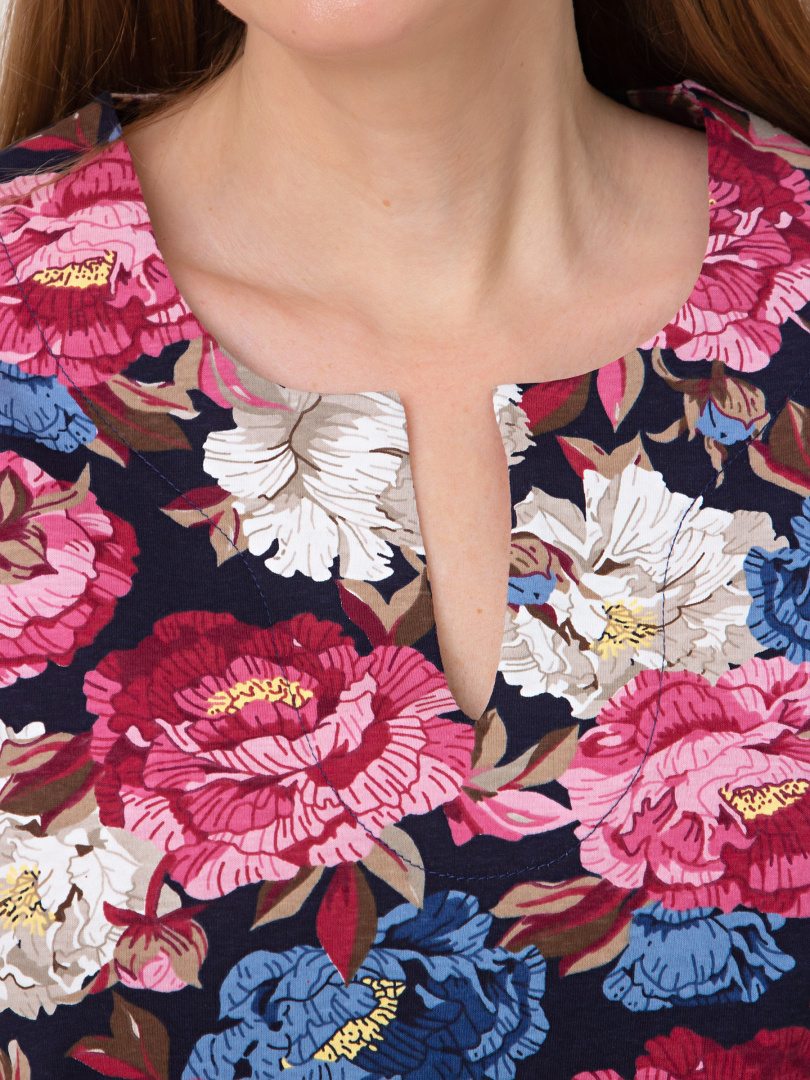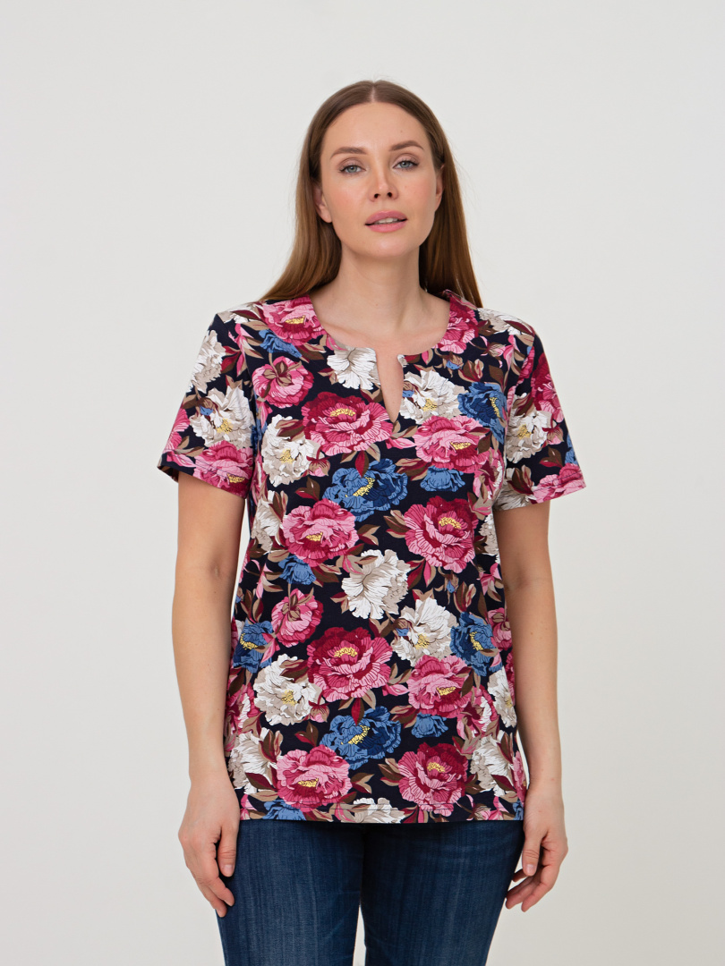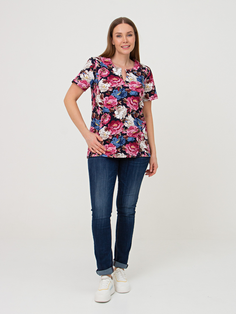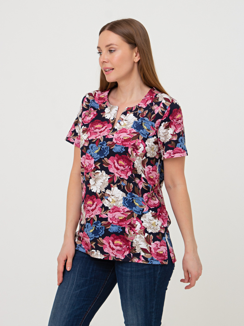Трикотажная блуза средней длины прямого силуэта. Низ боковых швов оформлен разрезами. Модель имеет короткий втачной рукав и фигурный вырез горловины.