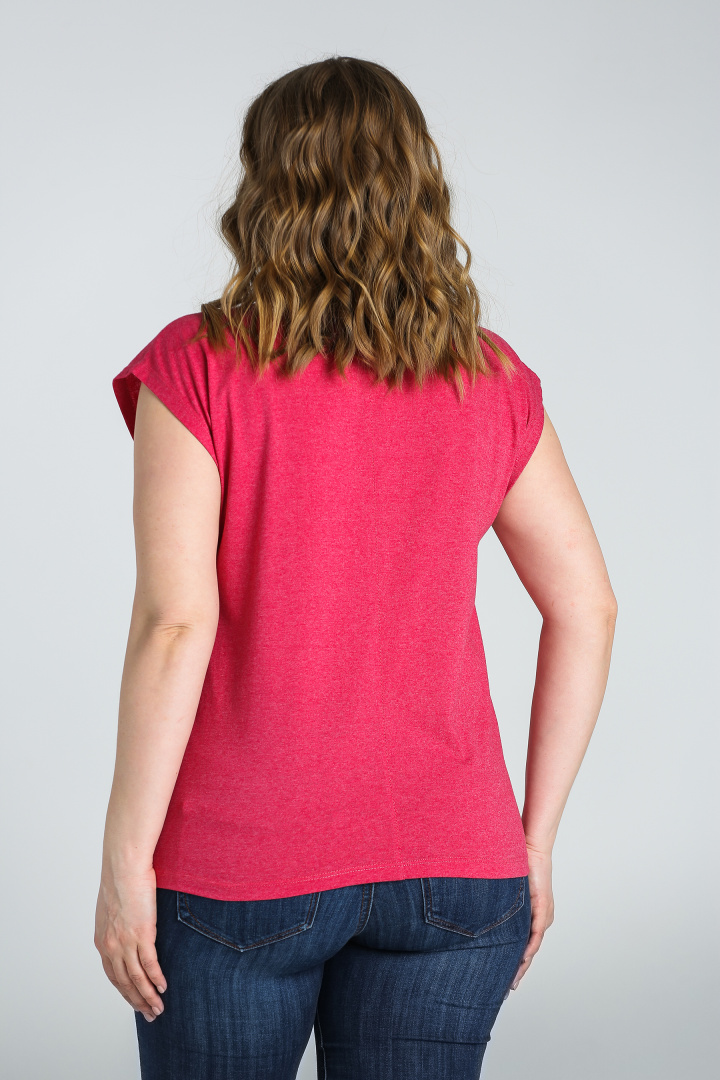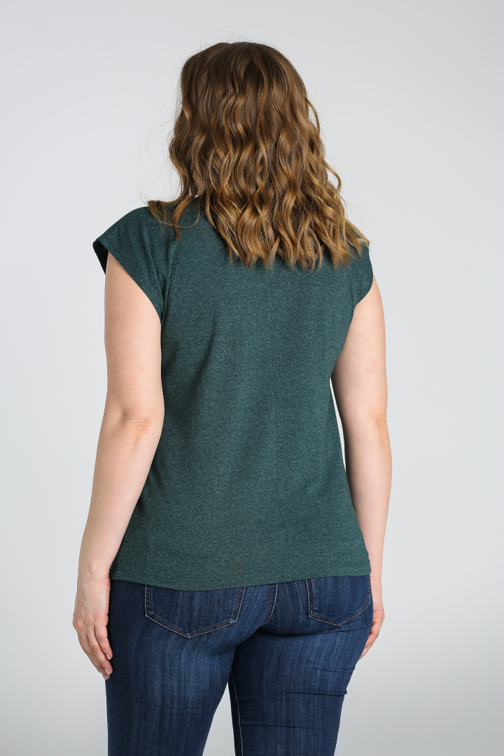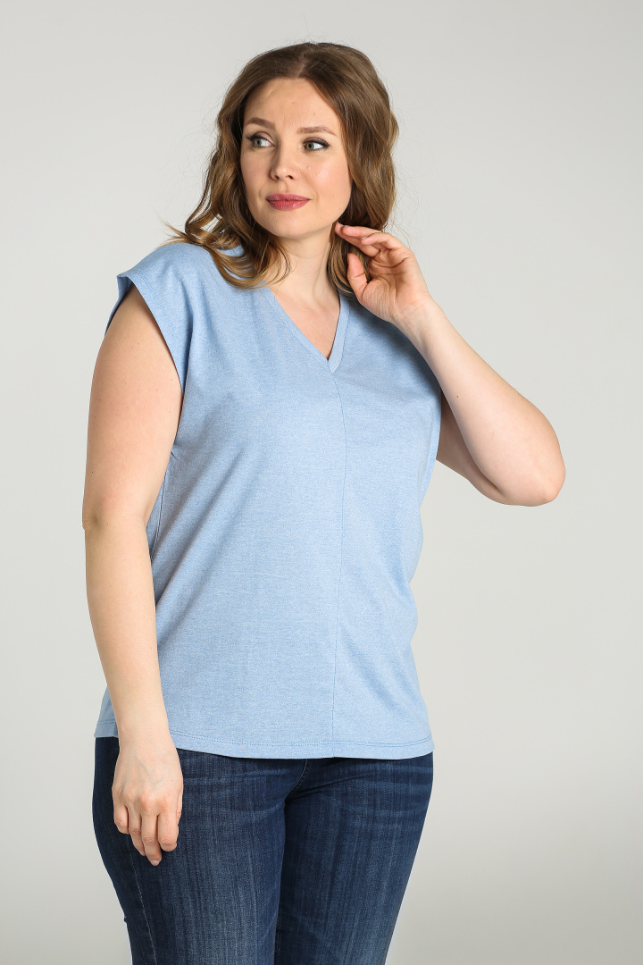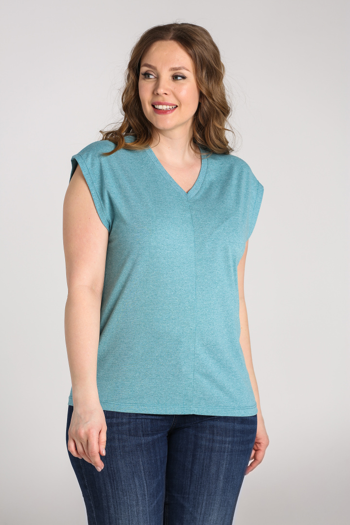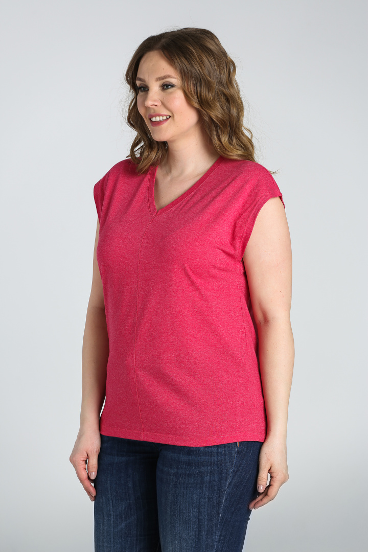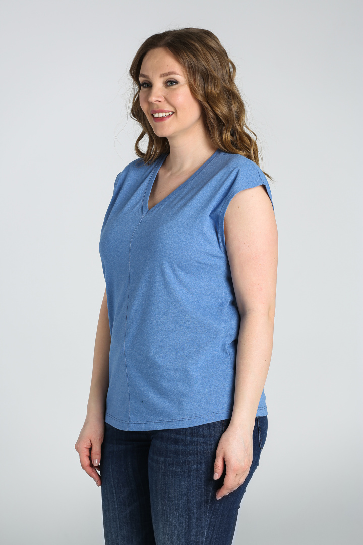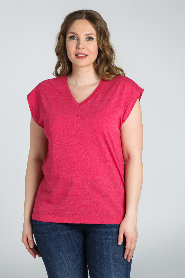 Футболка средней длины, выполнена из трикотажа. Покрой свободный со спущенным цельнокроеным рукавом. Футболка имеет V-образный вырез горловины. Перед и спинка со средним швом с декоративной строчкой.