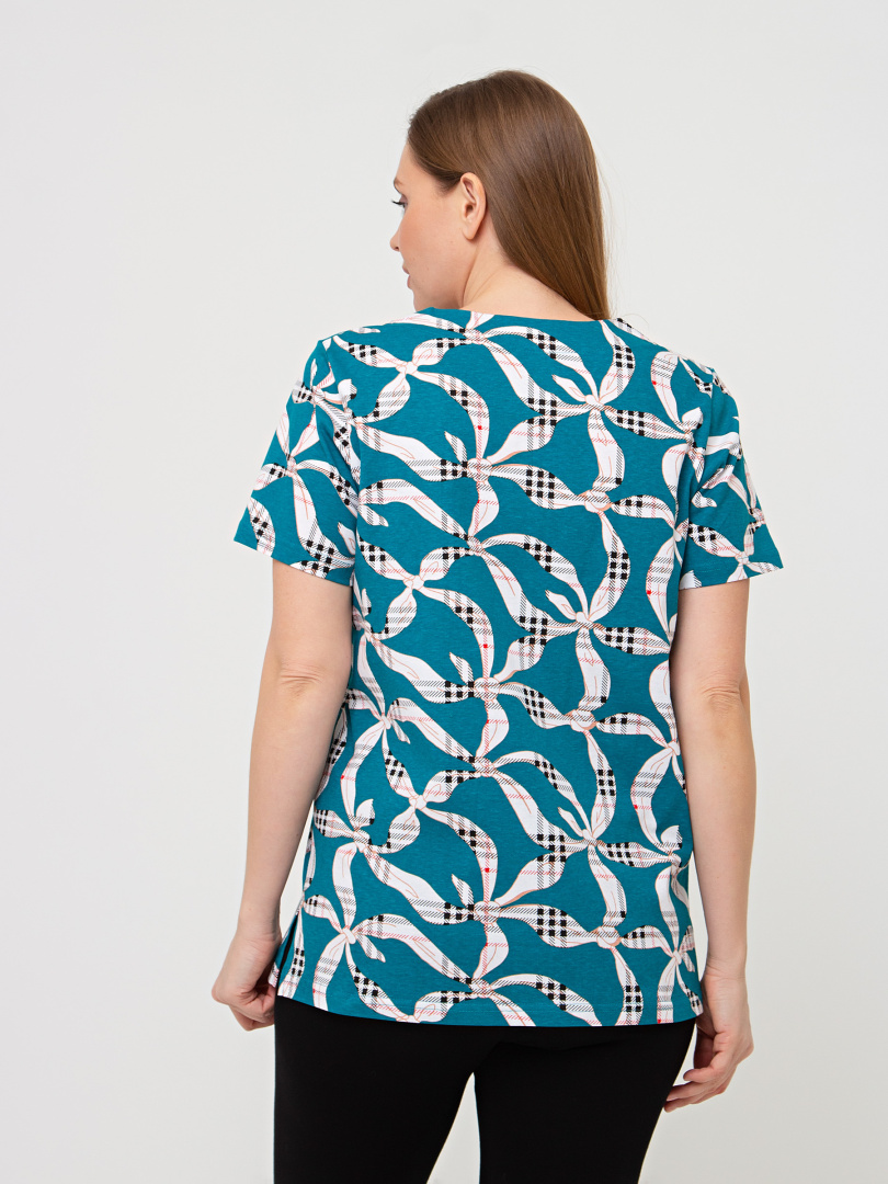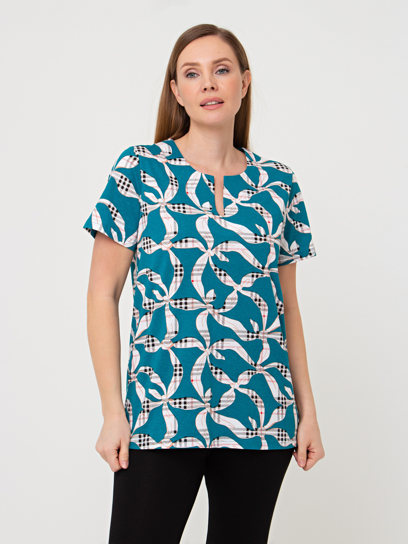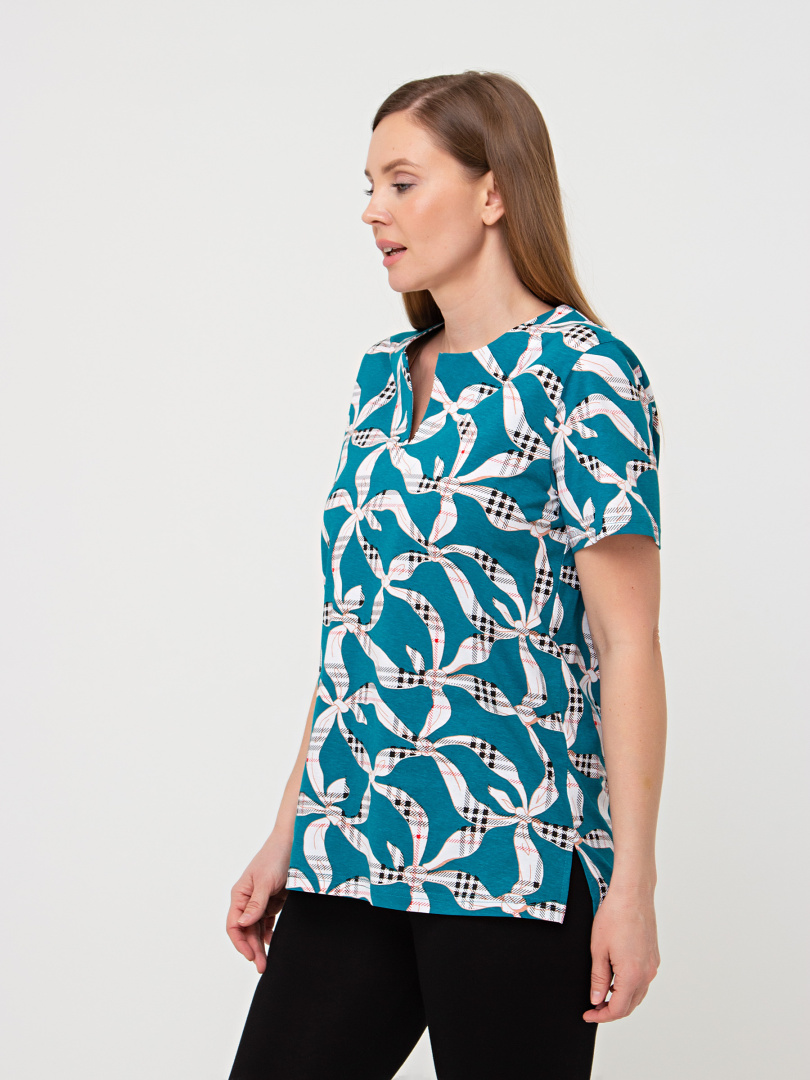 Трикотажная блуза средней длины прямого силуэта. Низ боковых швов оформлен разрезами. Модель имеет короткий втачной рукав и фигурный вырез горловины.