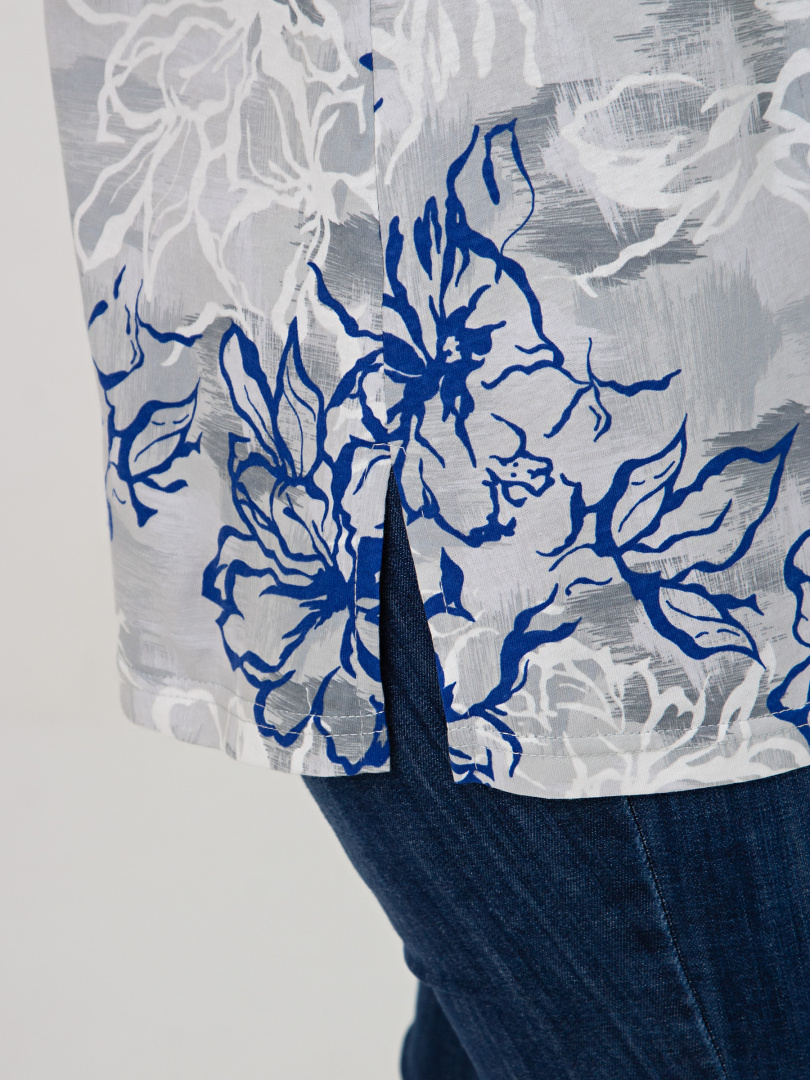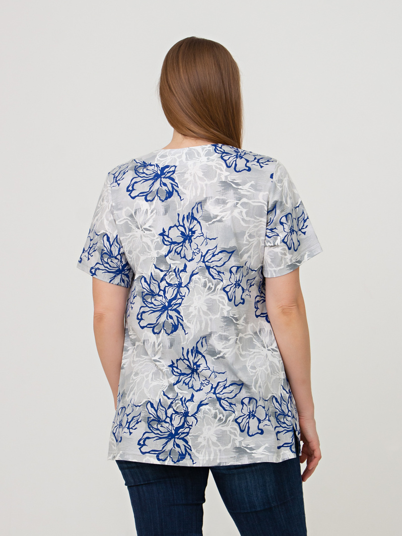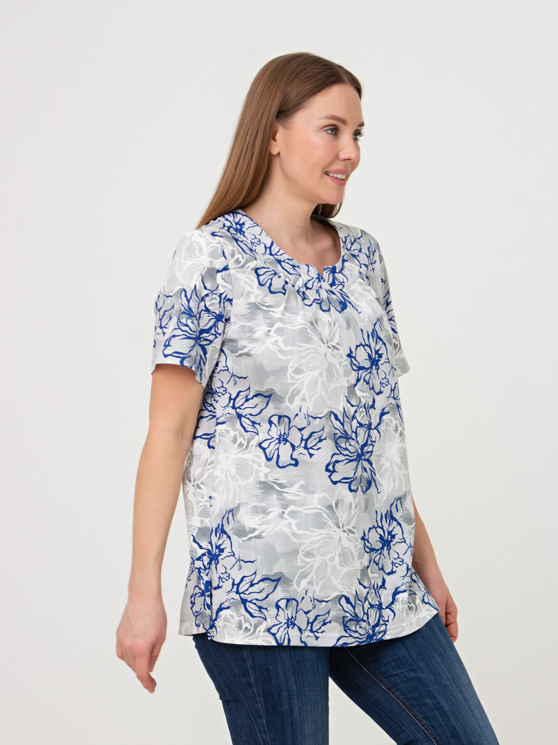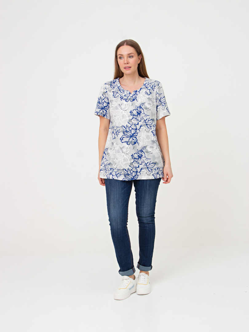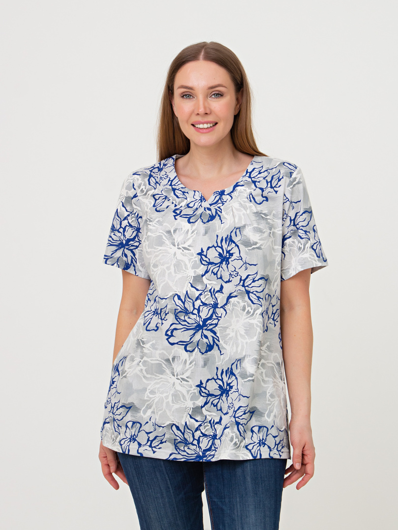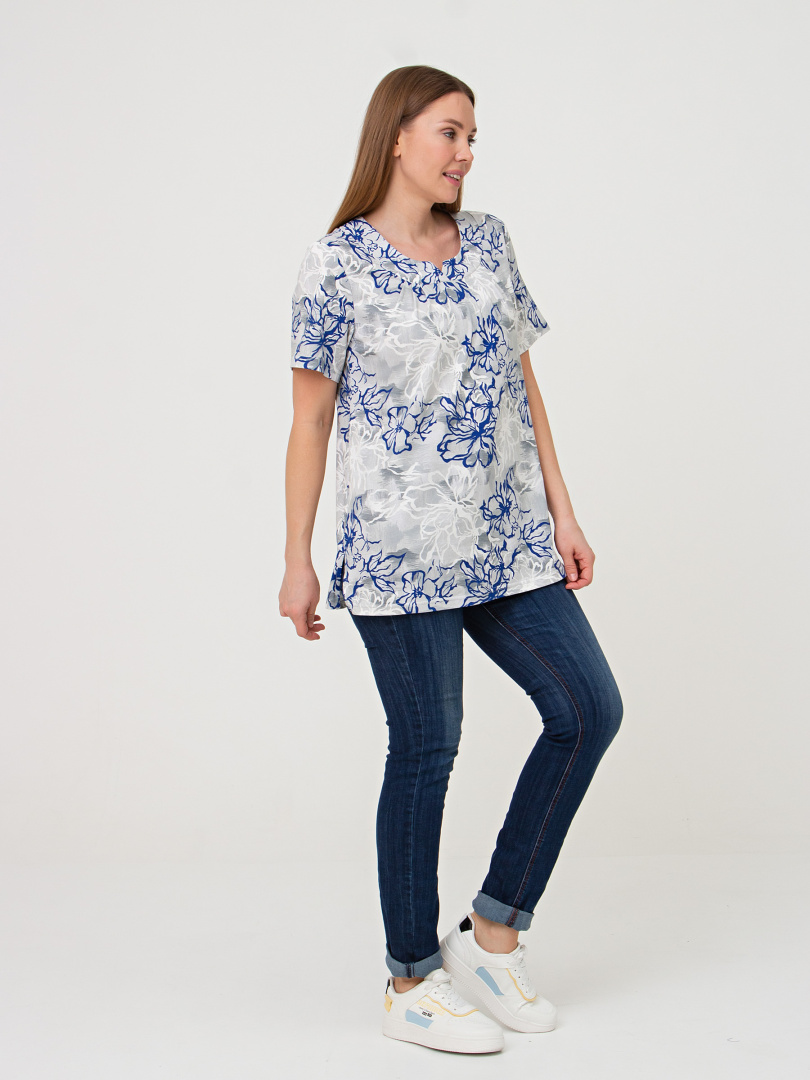 Блуза средней длины, выполнена из трикотажа. Модель полуприлегающего силуэта с разрезами по низу боковых швов. Изделие с коротким втачным рукавом. Горловина декорирована фигурной кокеткой. По низу кокетки переда заложены мягкие защипы.