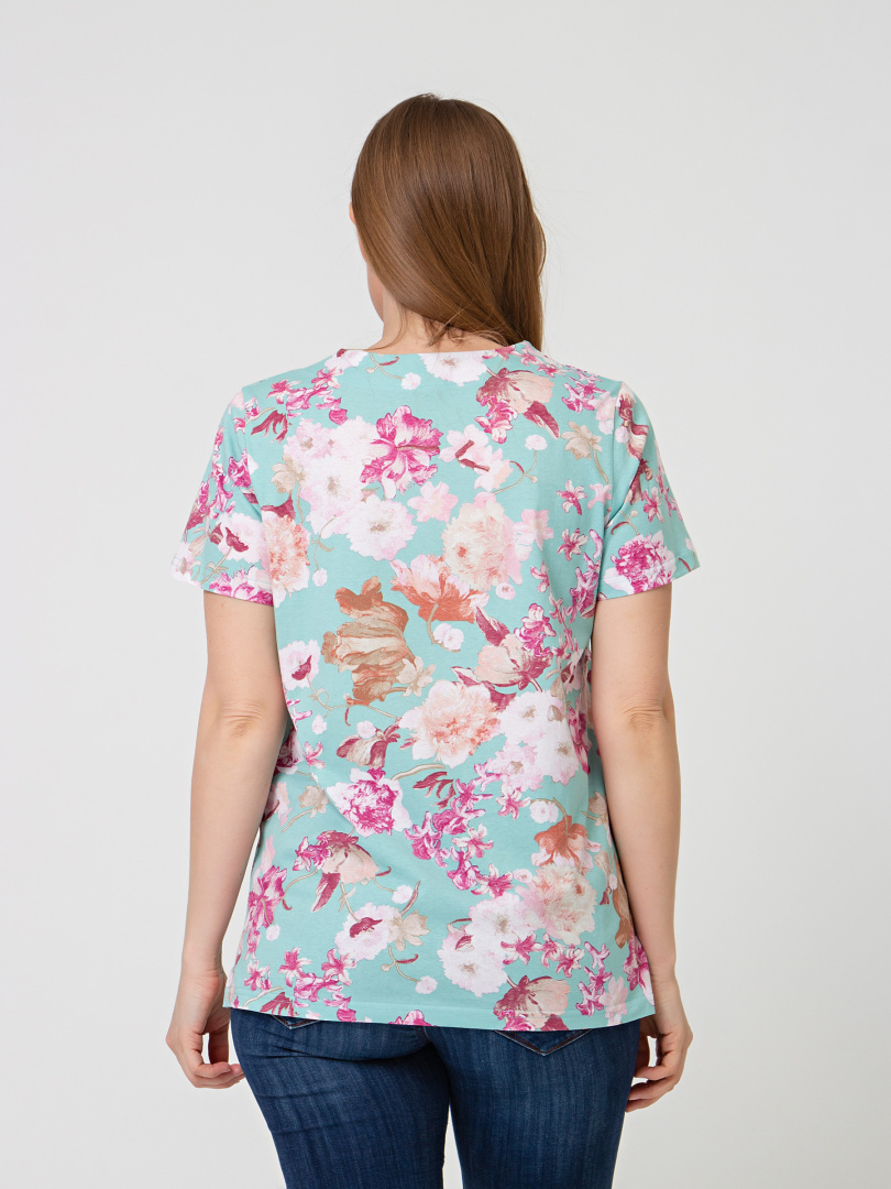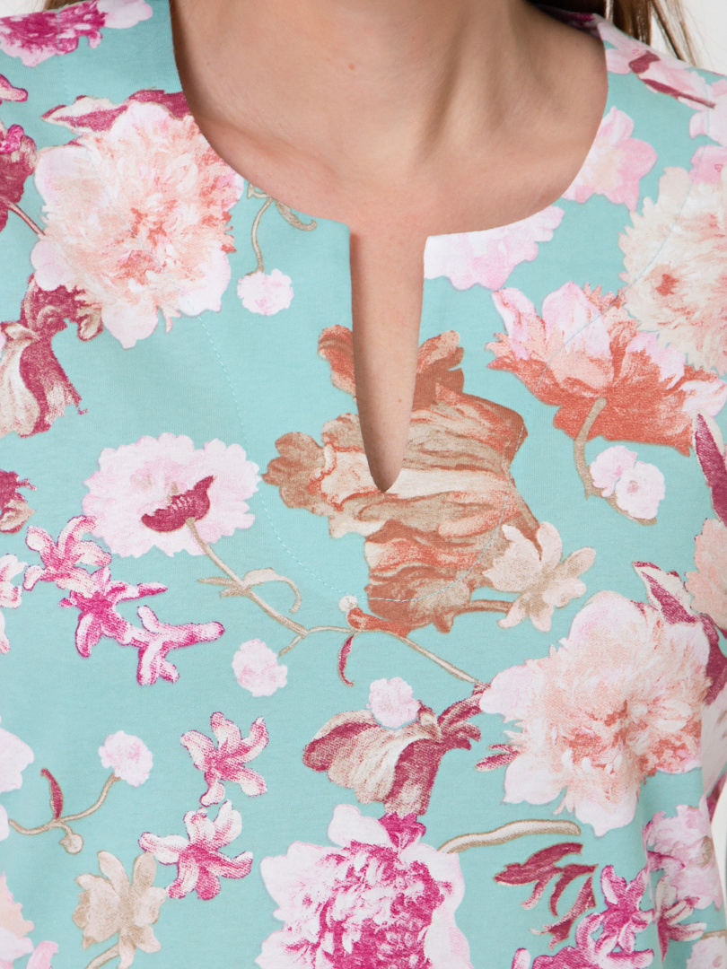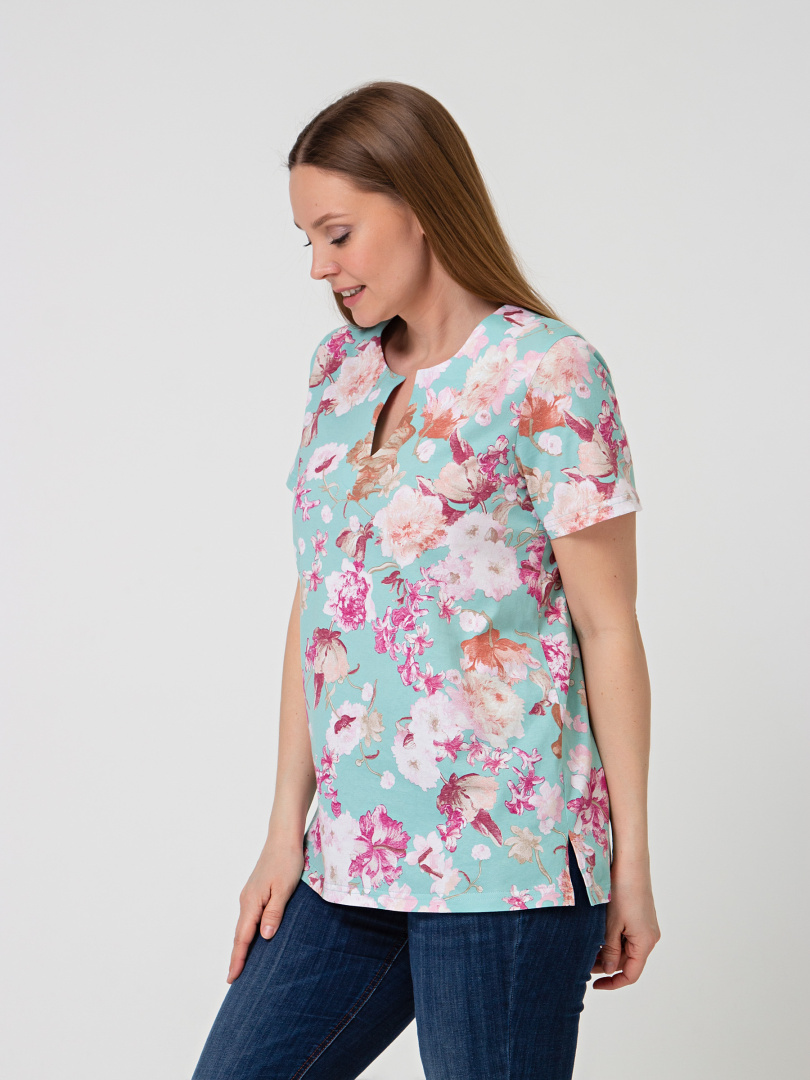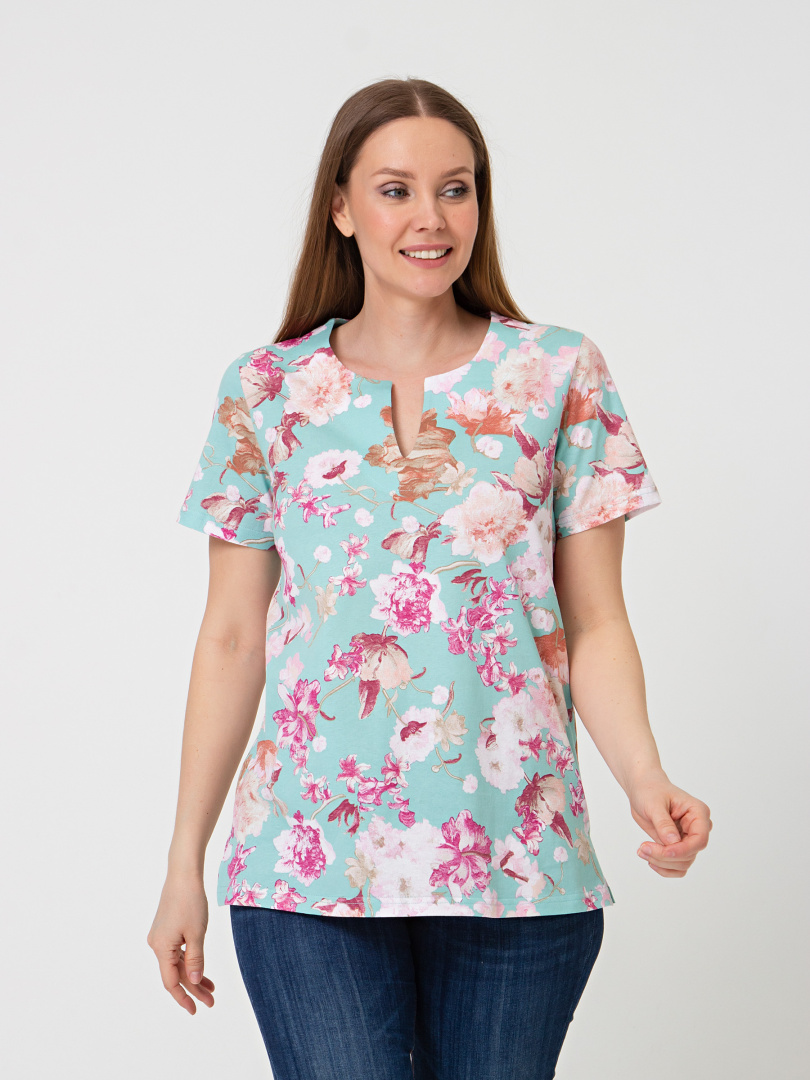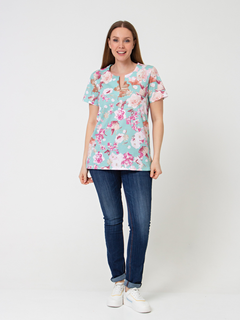 Трикотажная блуза средней длины прямого силуэта. Низ боковых швов оформлен разрезами. Модель имеет короткий втачной рукав и фигурный вырез горловины.