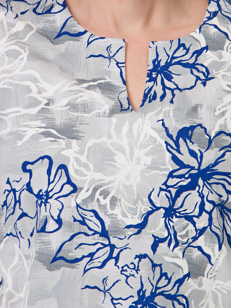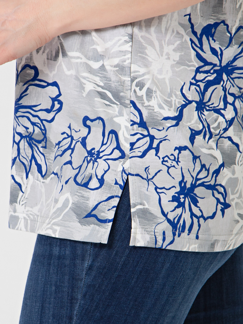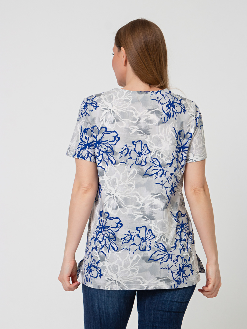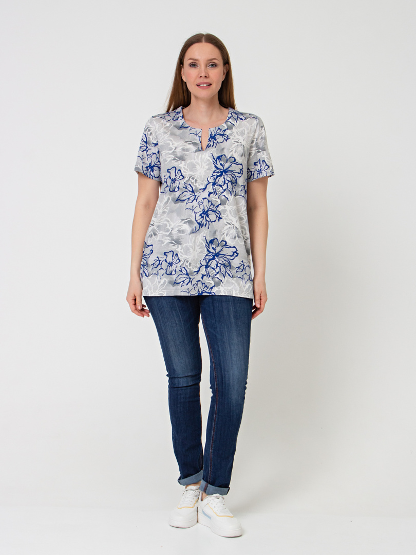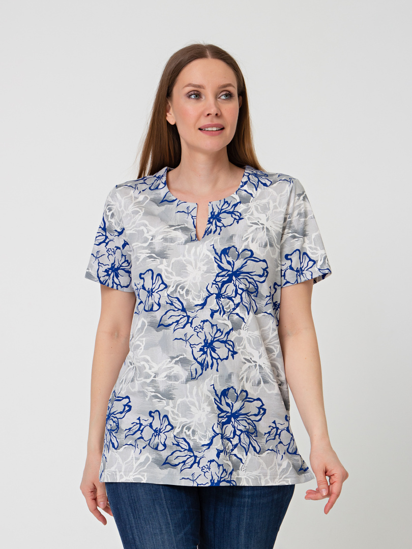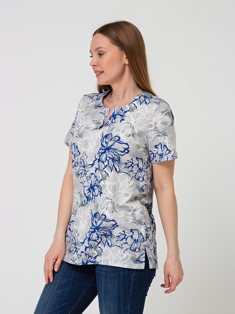 Трикотажная блуза средней длины прямого силуэта. Низ боковых швов оформлен разрезами. Модель имеет короткий втачной рукав и фигурный вырез горловины.