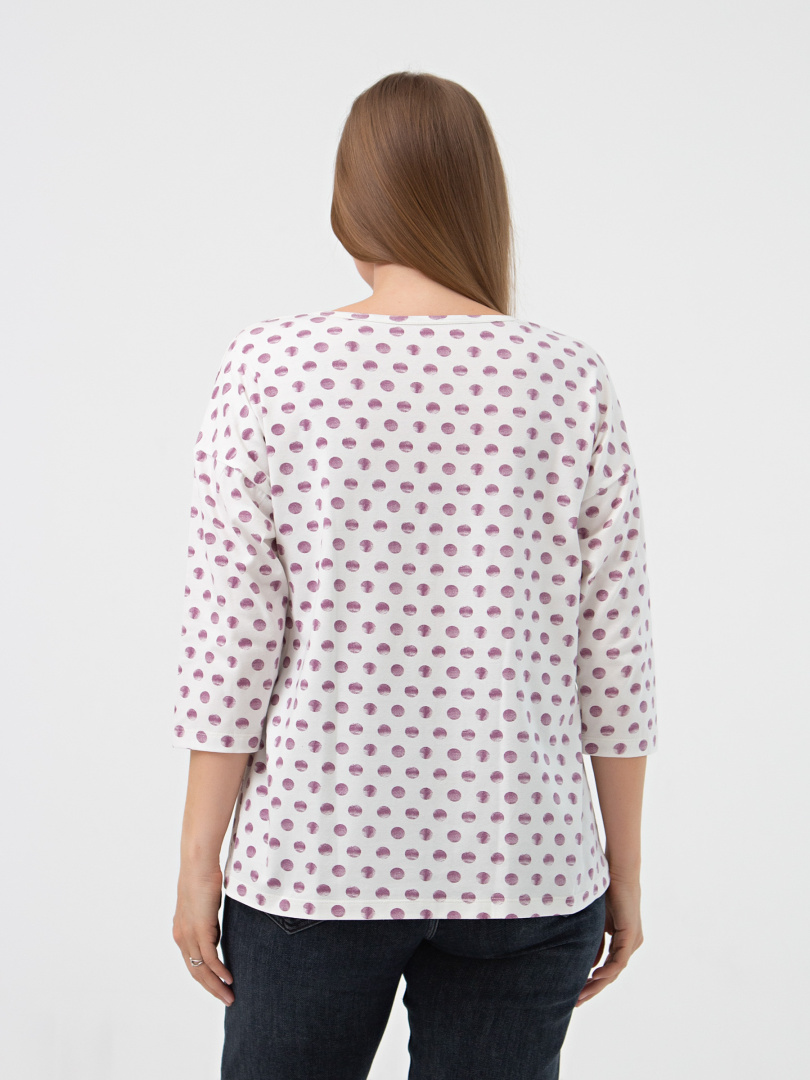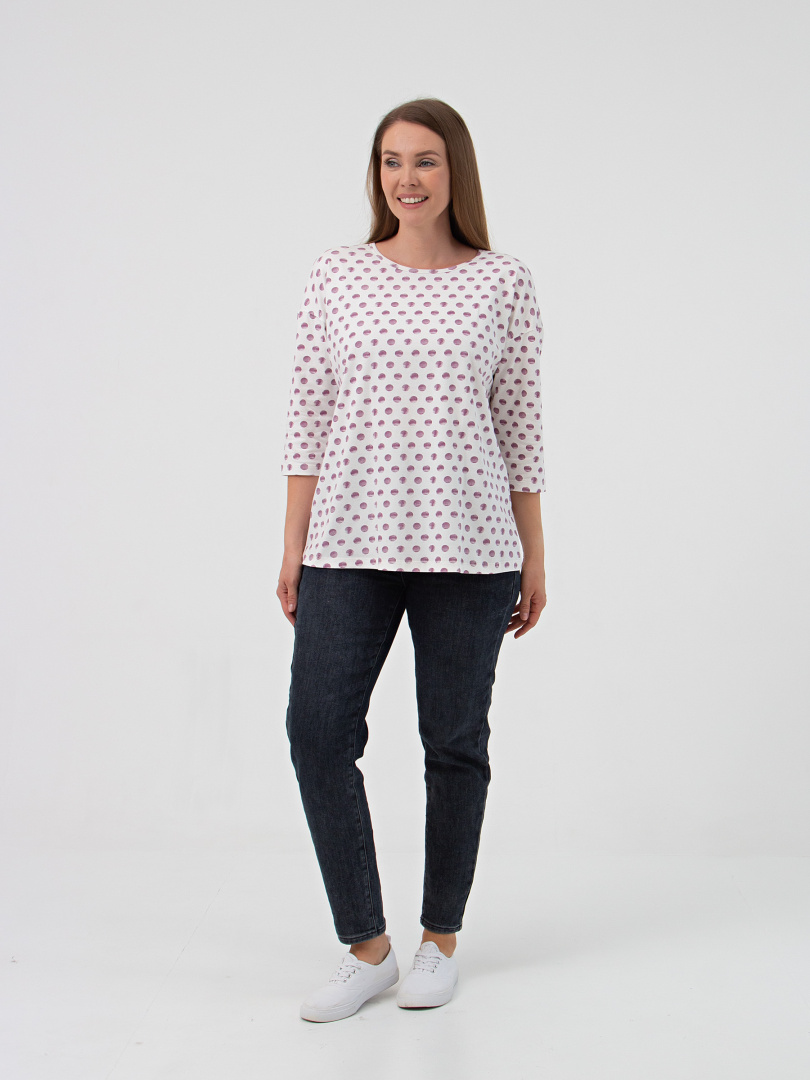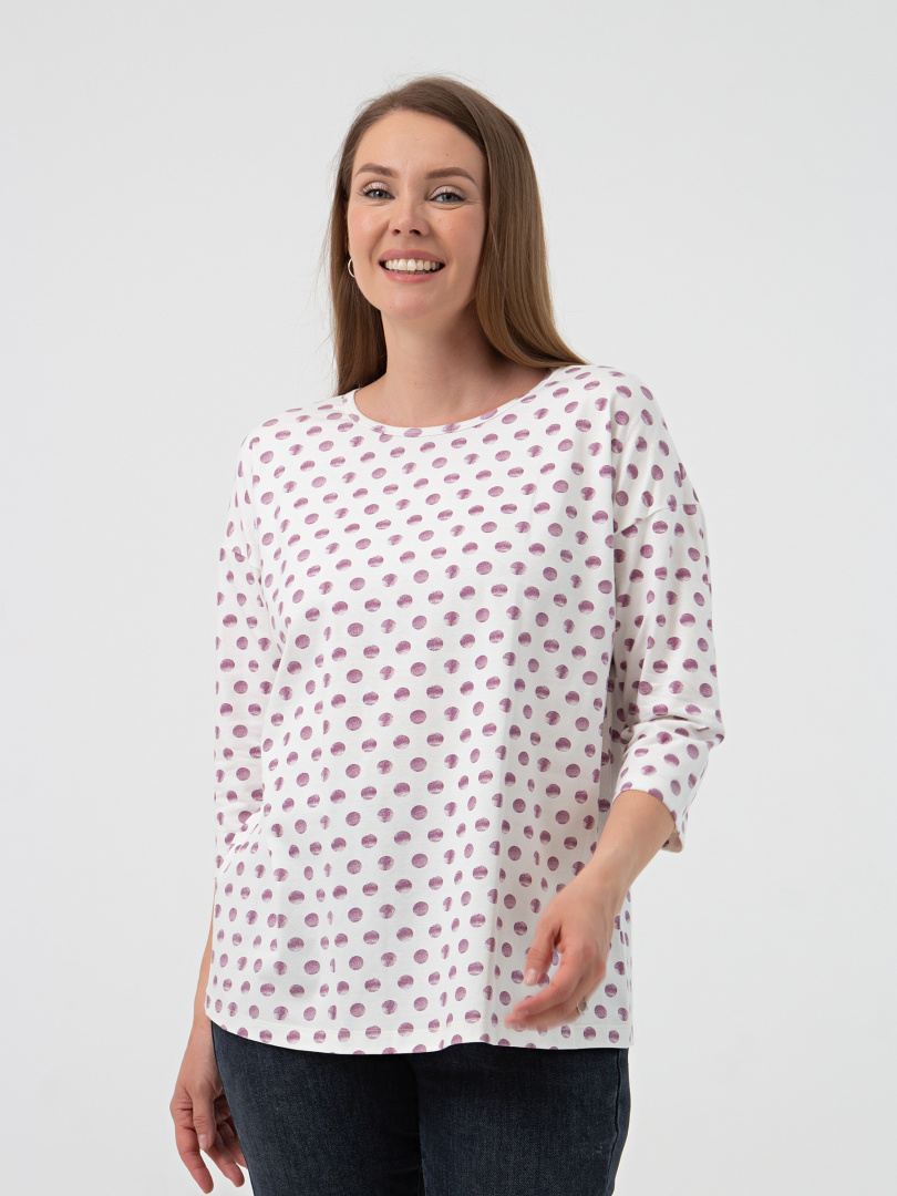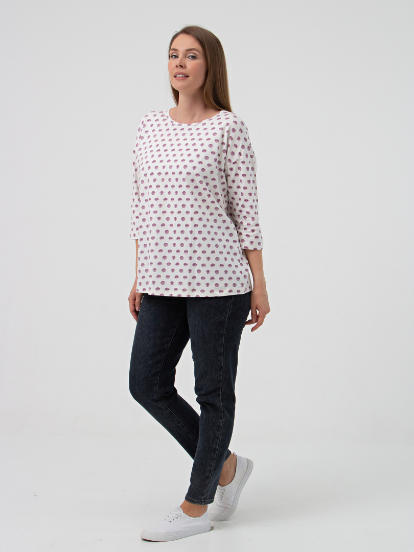 Блуза средней длины, выполнена из мягкого эластичного трикотажа. Покрой свободный со спущенным рукавом 3/4. Вырез круглый.