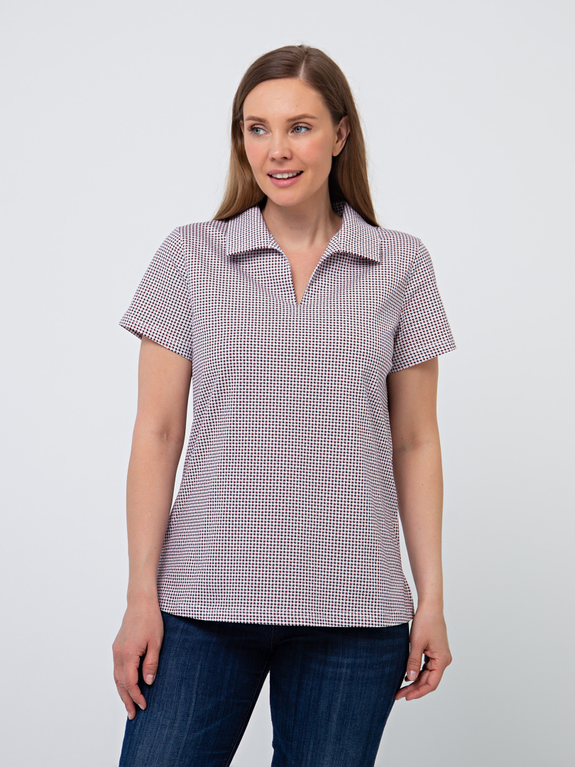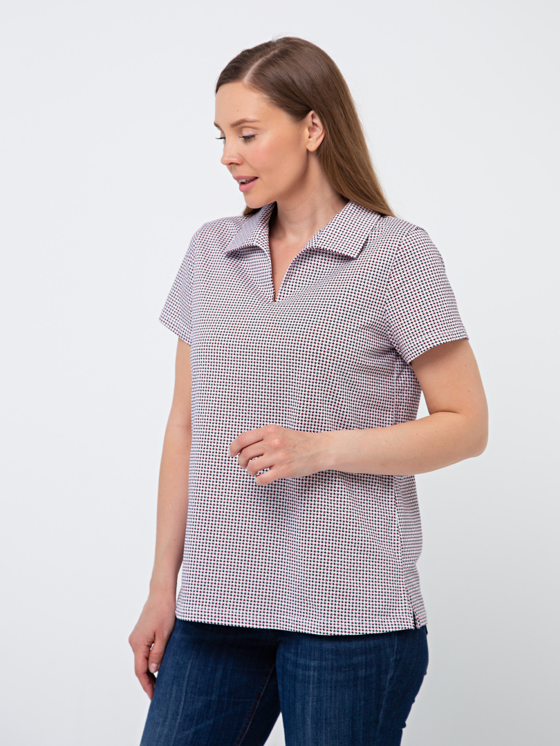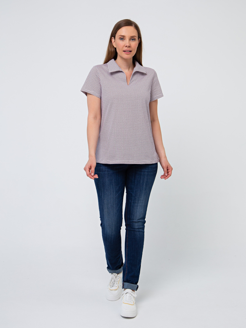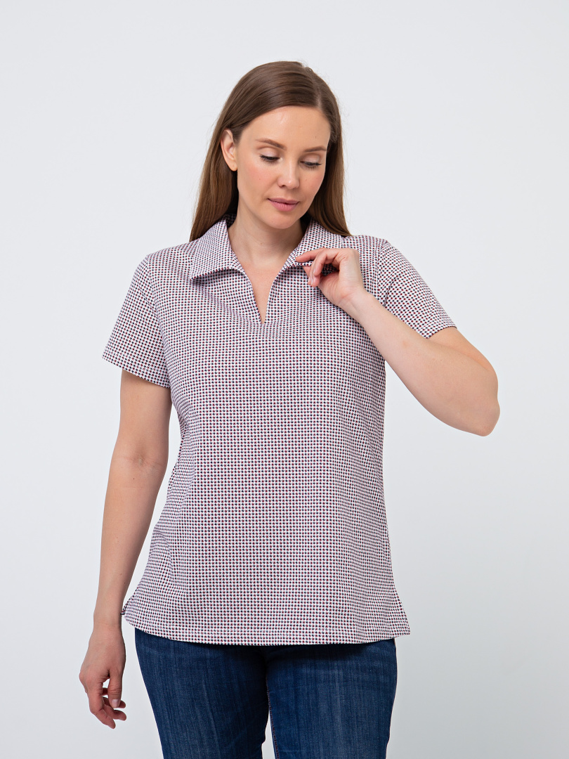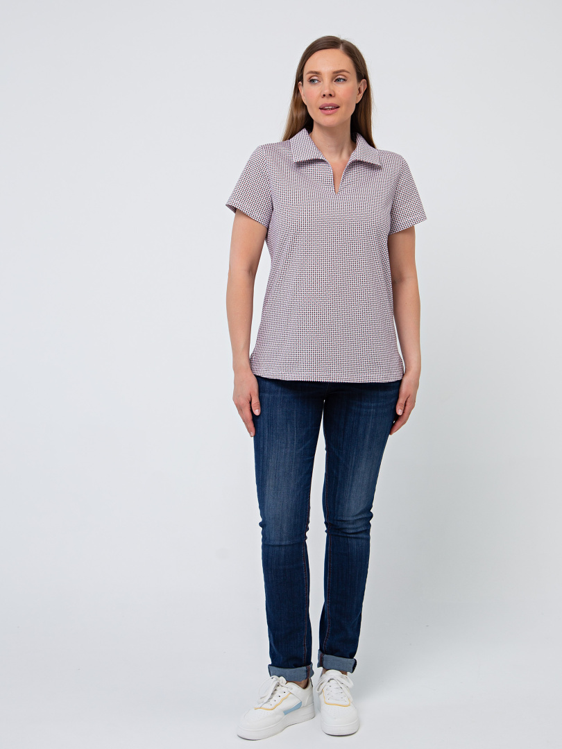 Женская трикотажная блузка полуприлегающего покроя. Воротник стояче-отложной и щель по переду. Рукав втачной короткий. По боковым швам небольшие разрезы.
