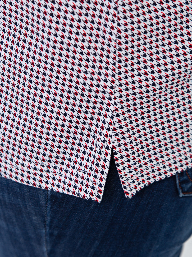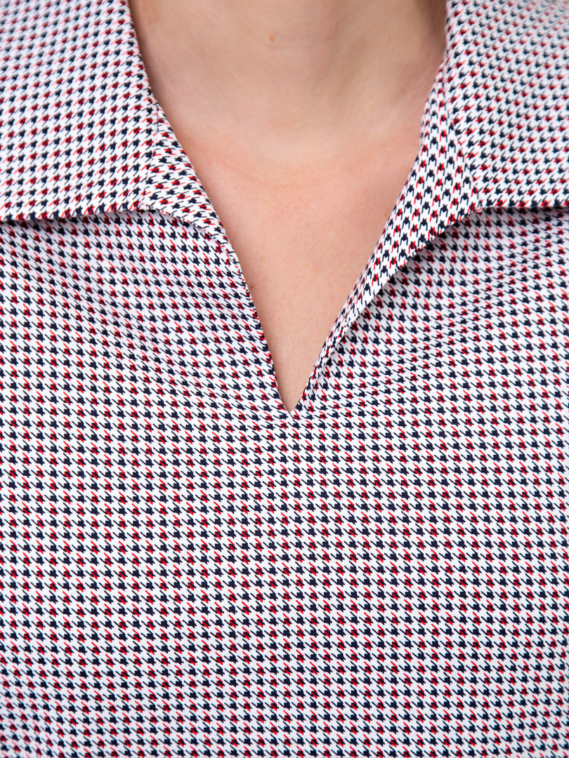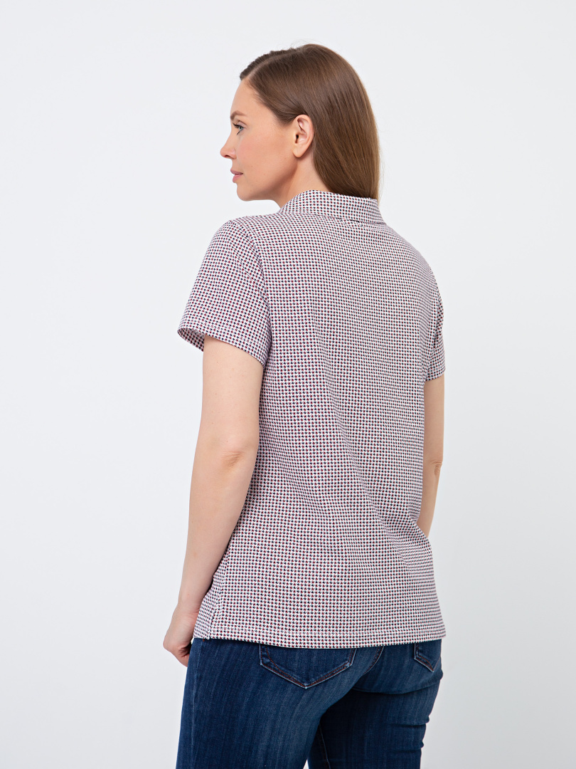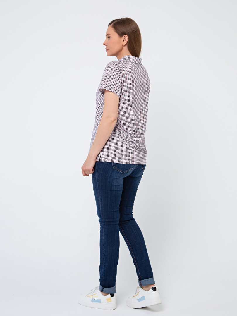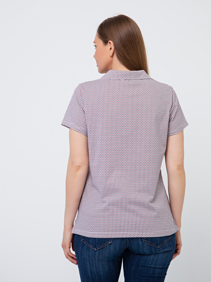 Женская трикотажная блузка полуприлегающего покроя. Воротник стояче-отложной и щель по переду. Рукав втачной короткий. По боковым швам небольшие разрезы.