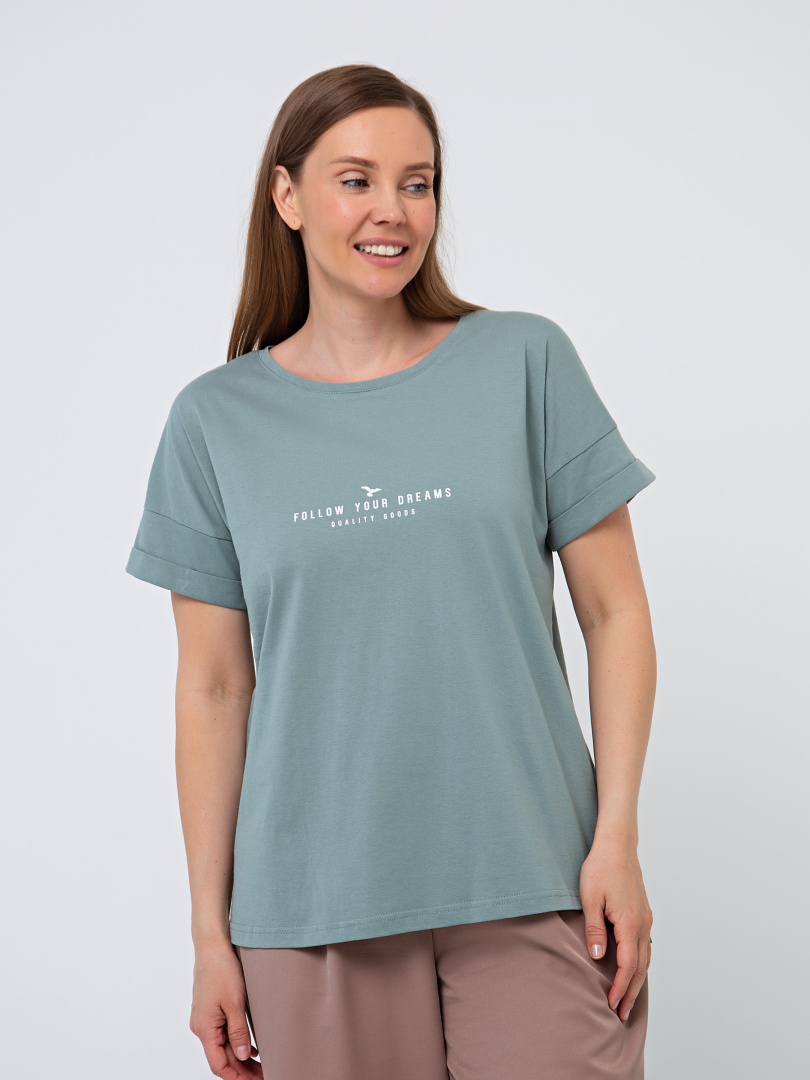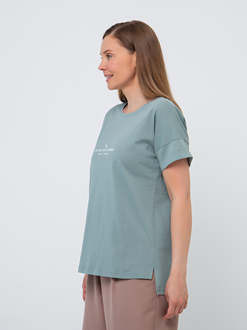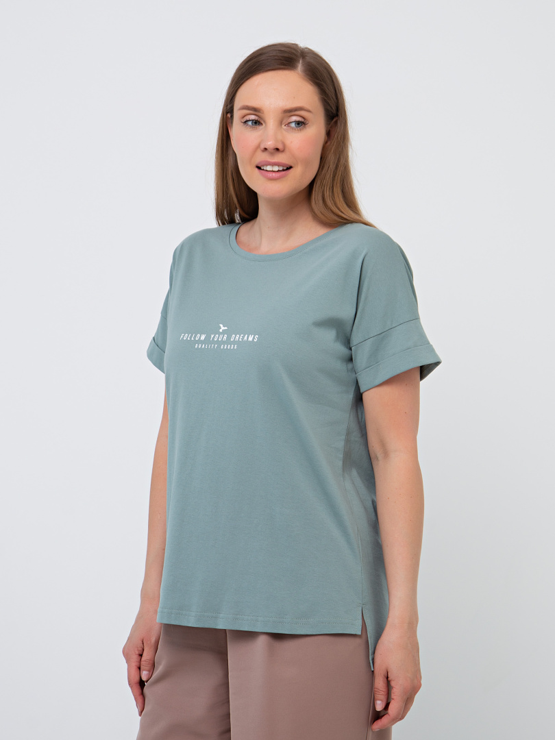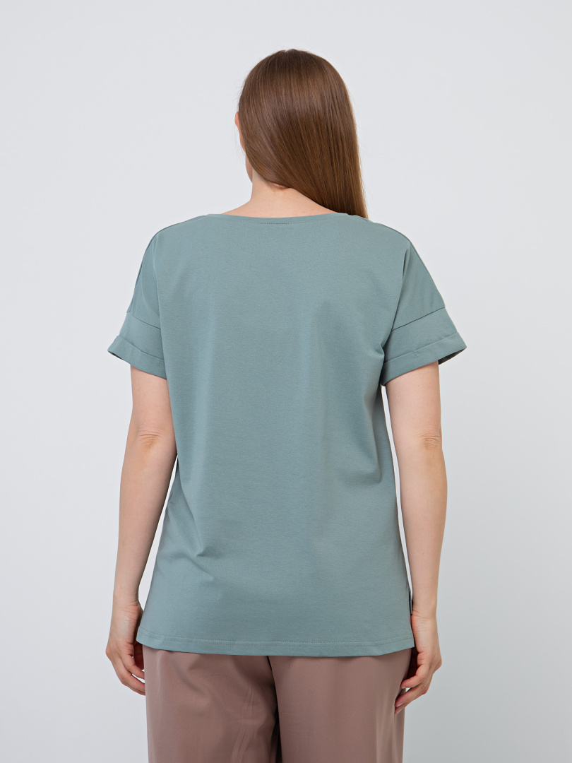 Блуза средней длины, выполнена из хлопкового трикотажа с декоративным принтом. Покрой свободный со спущенным рукавом. По низу рукава – отвороты. Вырез круглый. Особенность модели – удлинённая спинка.