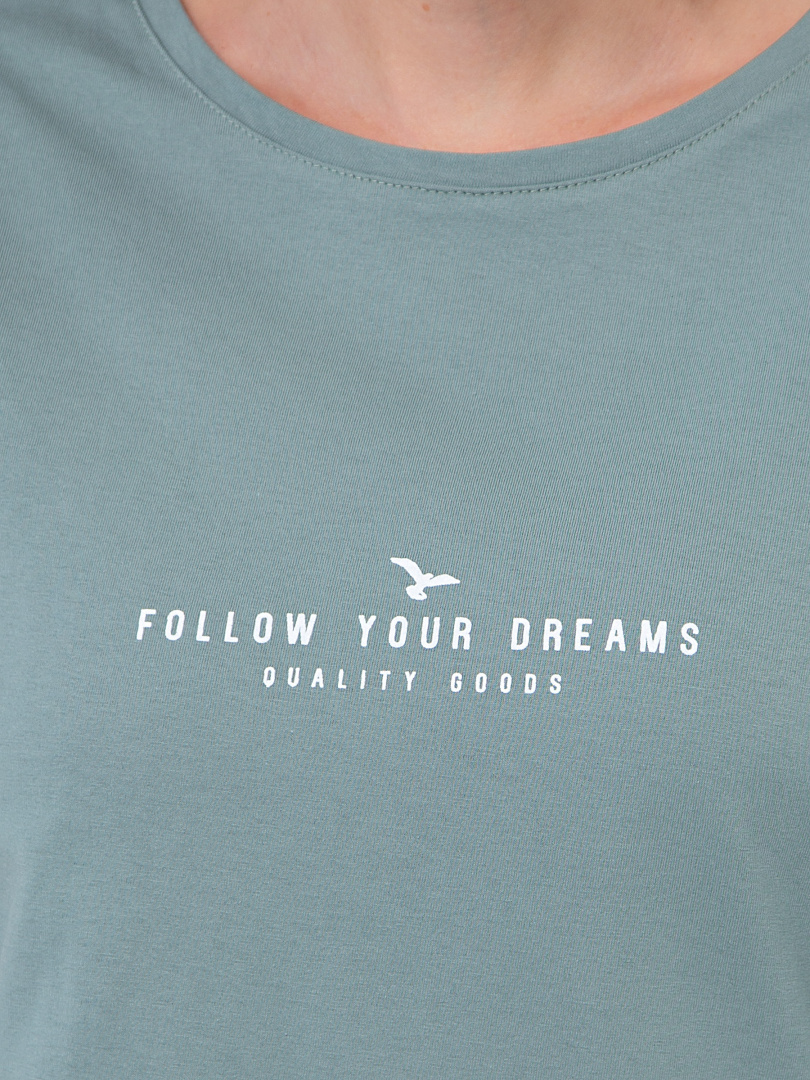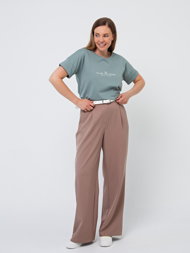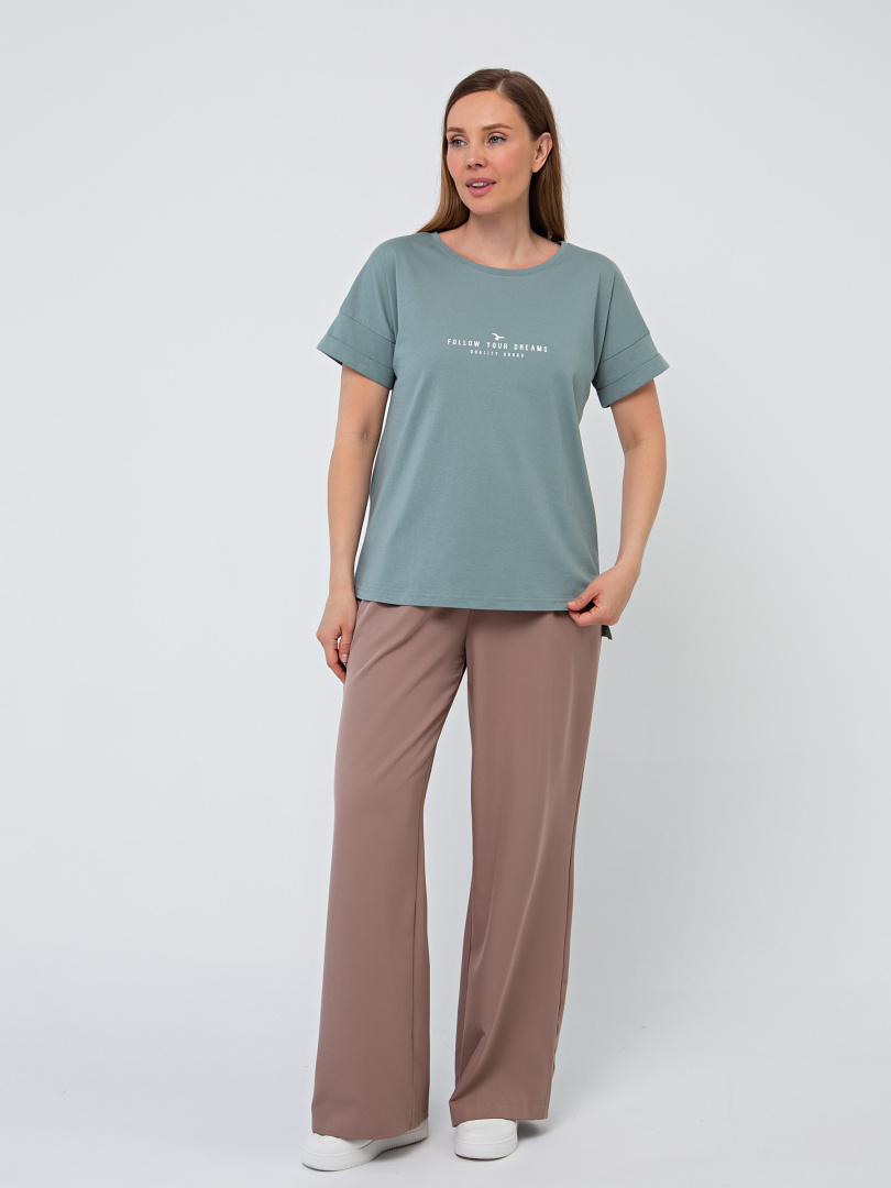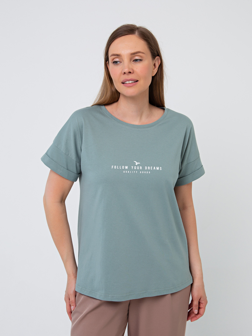 Блуза средней длины, выполнена из хлопкового трикотажа с декоративным принтом. Покрой свободный со спущенным рукавом. По низу рукава – отвороты. Вырез круглый. Особенность модели – удлинённая спинка.