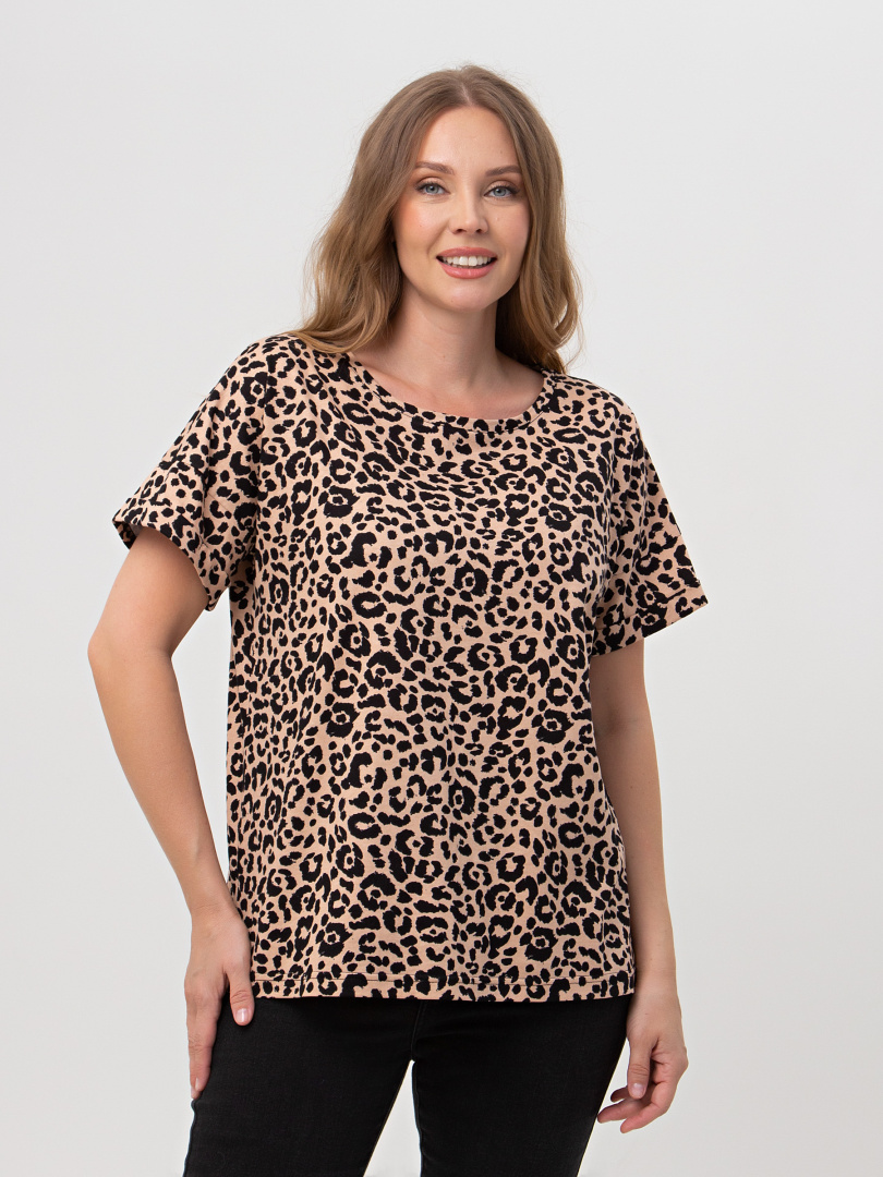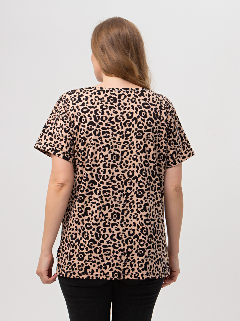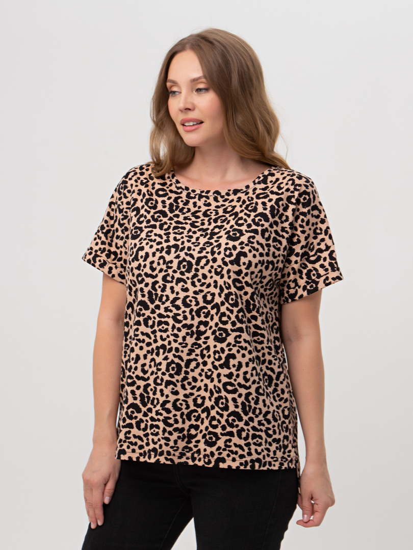 Блуза средней длины, выполнена из хлопкового трикотажа со стильным принтом. Покрой свободный со спущенным рукавом. По низу рукава – отвороты. Вырез круглый. Особенность модели – удлинённая спинка.