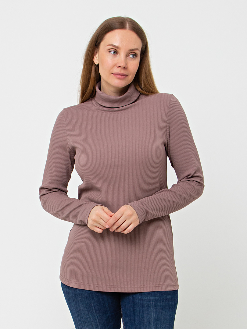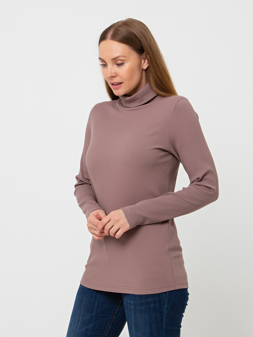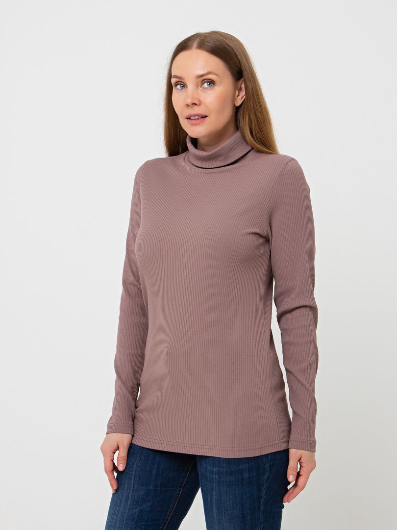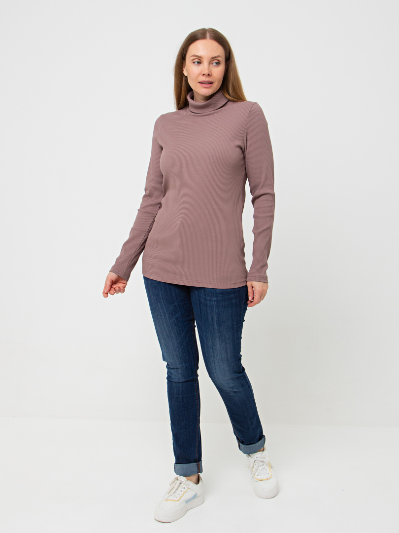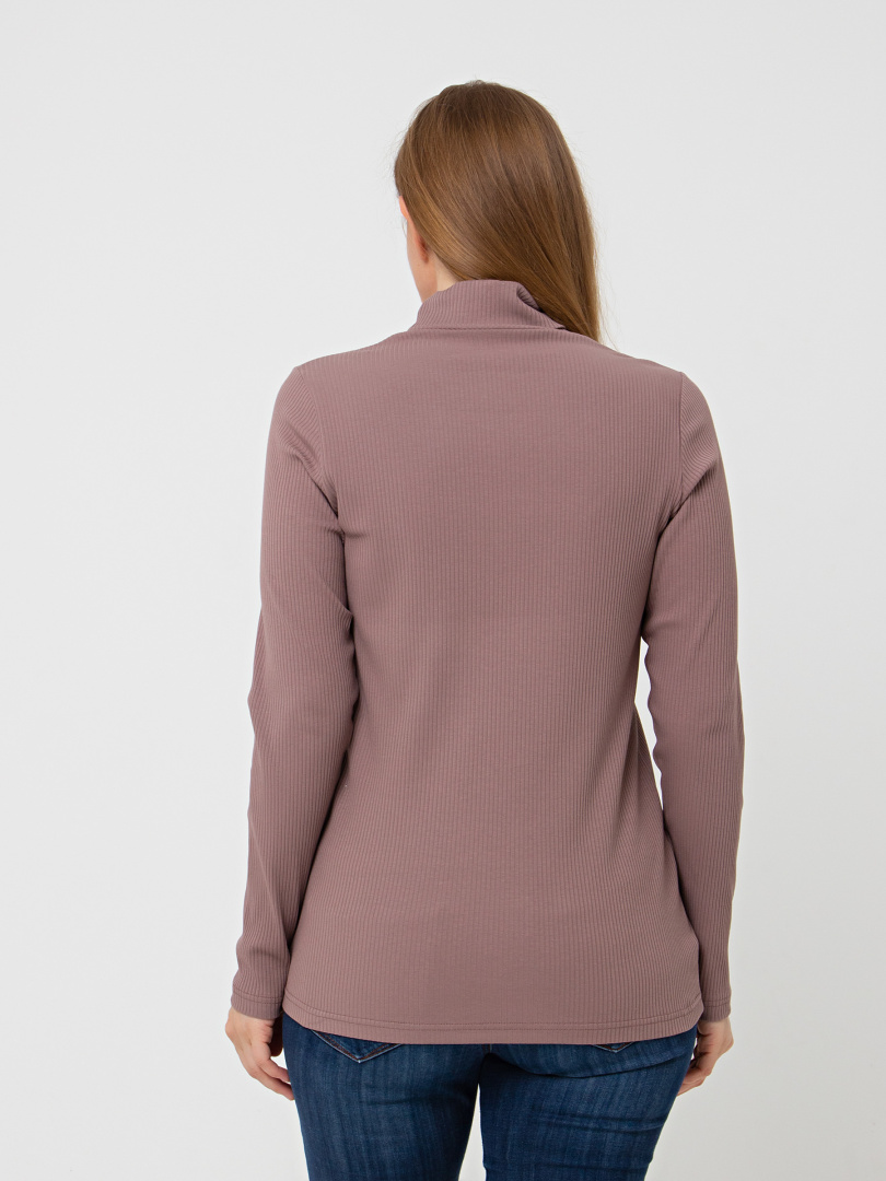 Фуфайка полуприлегающего силуэта из эластичного трикотажа в рубчик. Модель средней длины. Горловина имеет растяжимый воротник-стойку.