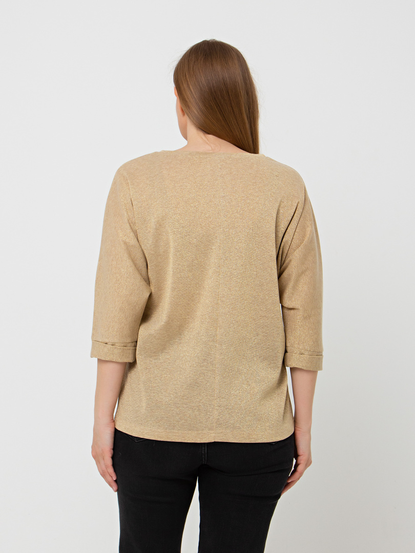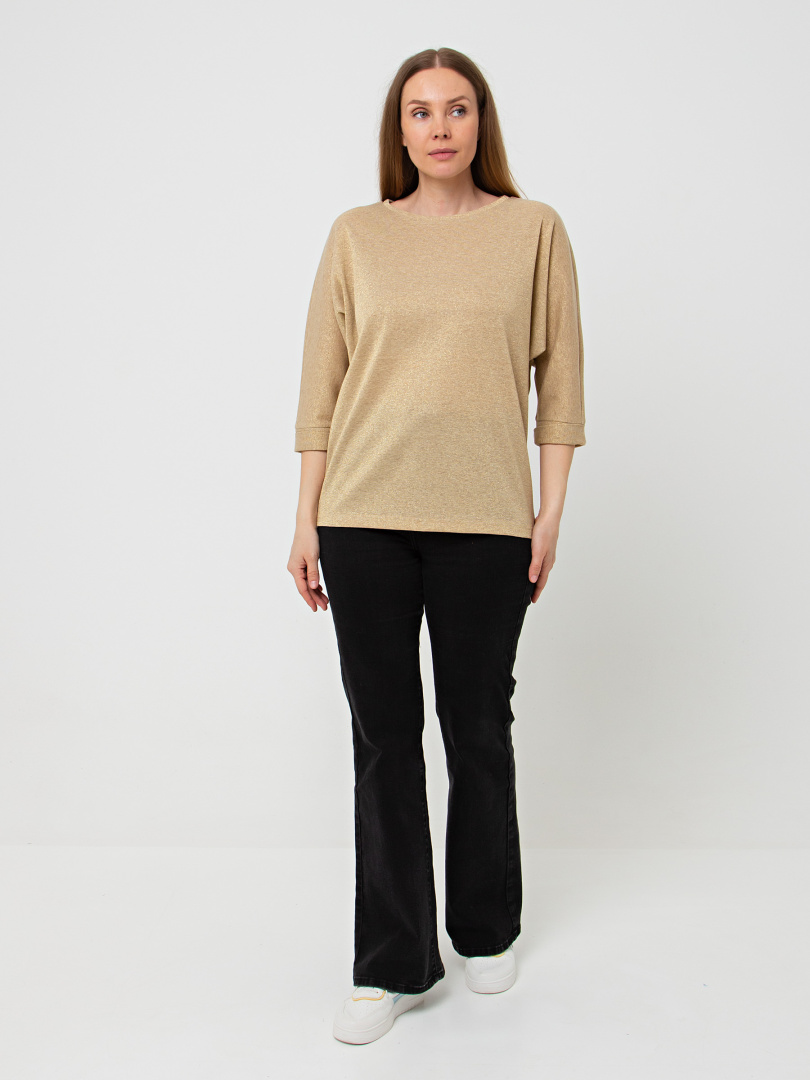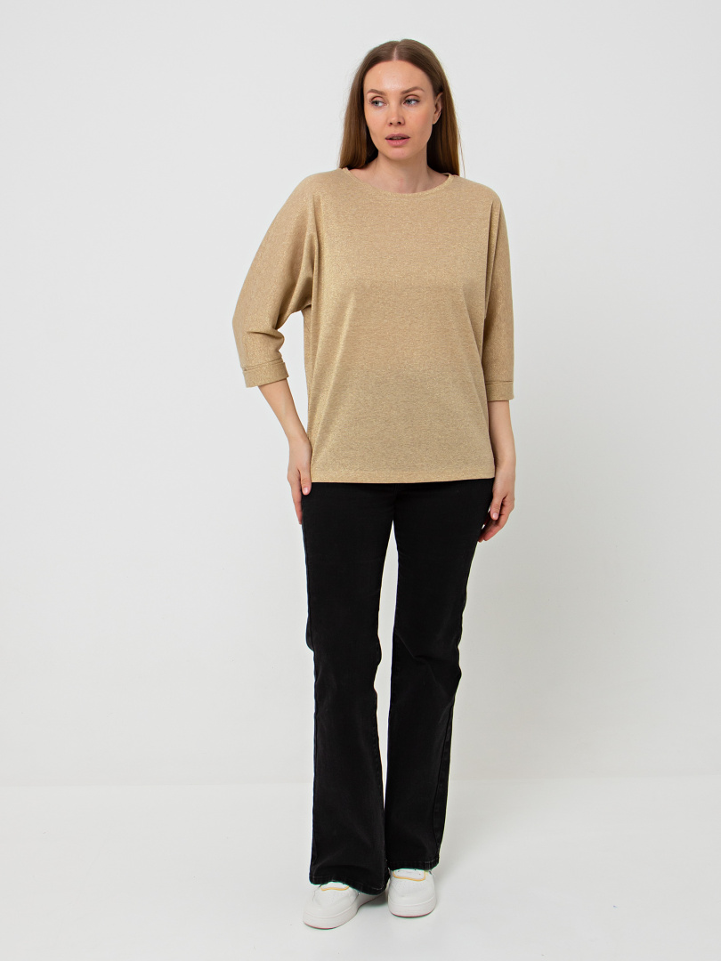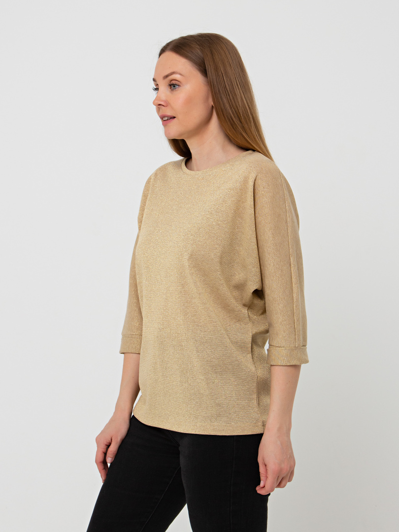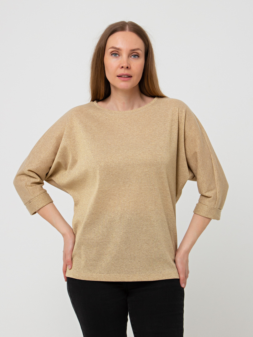 Фуфайка прямого силуэта из трикотажа с люрексом с рукавом «летучая мышь». Модель средней длины. Горловина - лодочка. По низу рукава – отложные манжеты.
