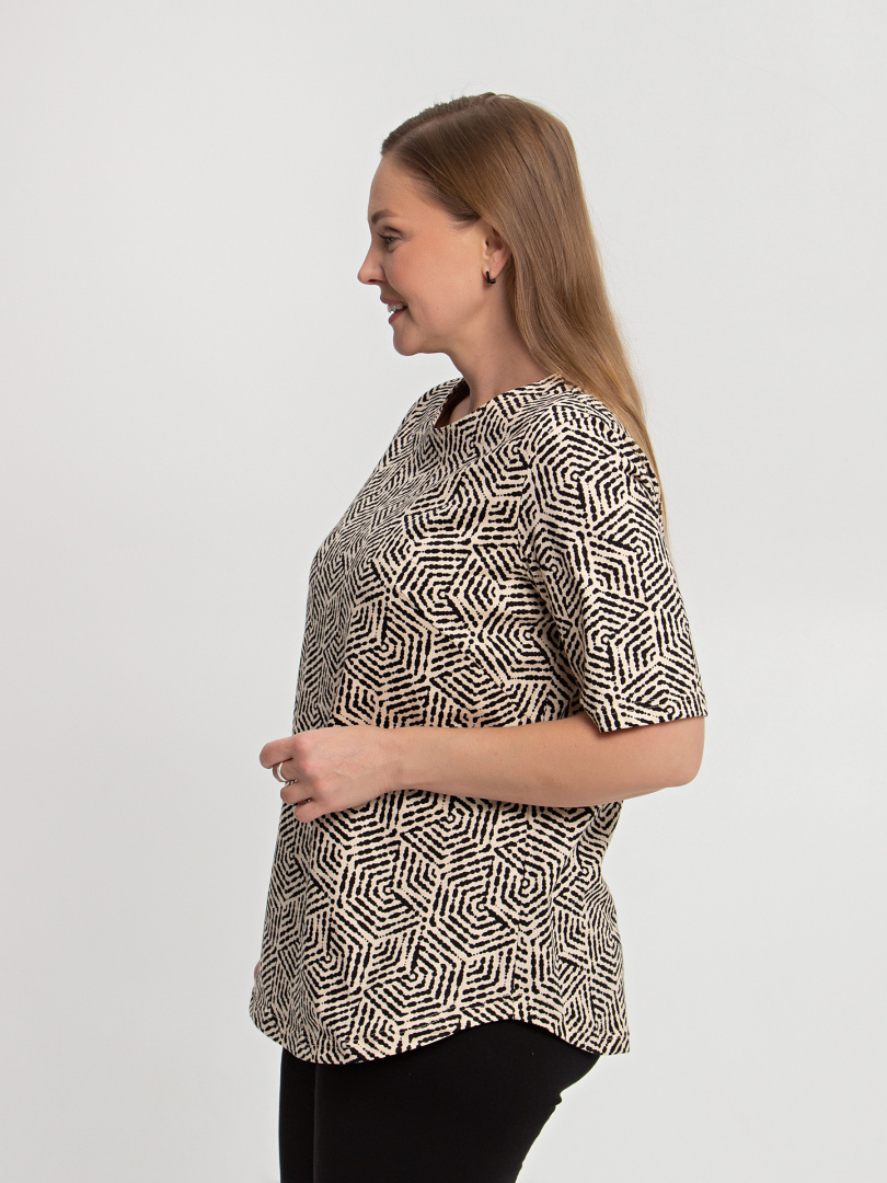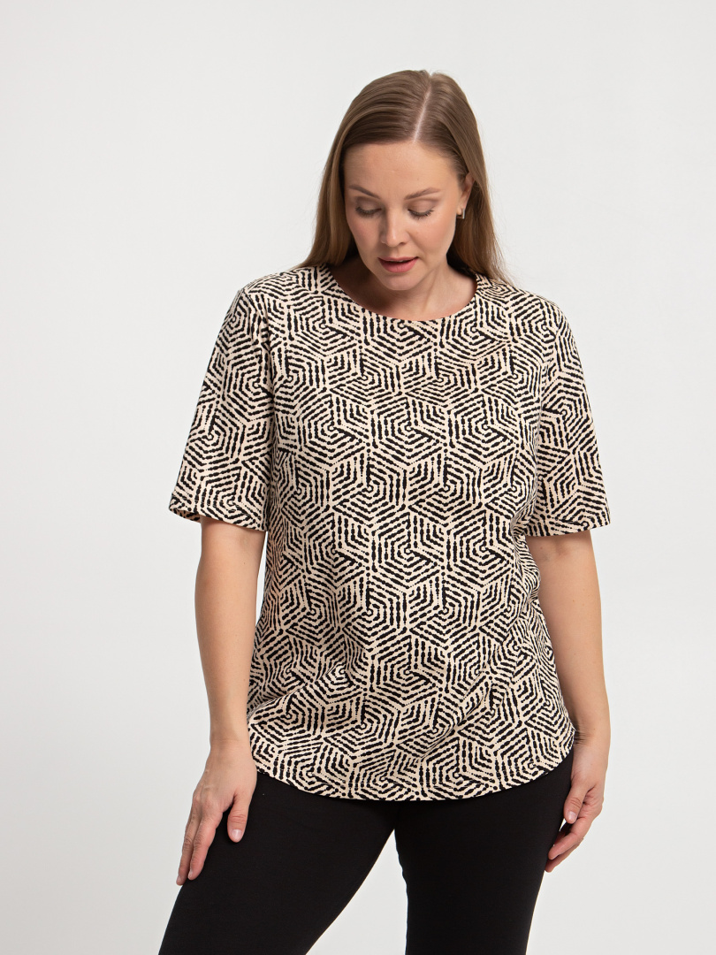Трикотажная блуза средней длины полуприлегающего силуэта. Модель имеет короткий втачной рукав и фигурную линию низу. Вырез горловины круглый.