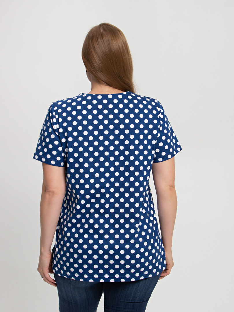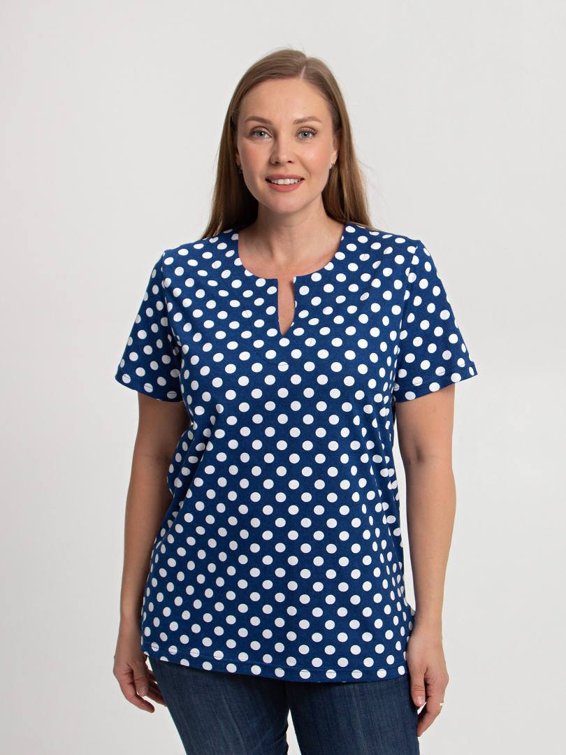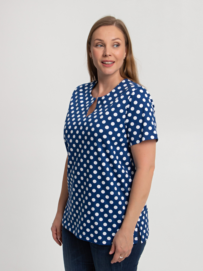 Трикотажная блуза средней длины прямого силуэта. Низ боковых швов оформлен разрезами. Модель имеет короткий втачной рукав и фигурный вырез горловины.