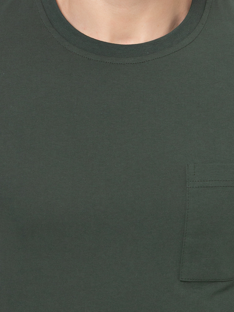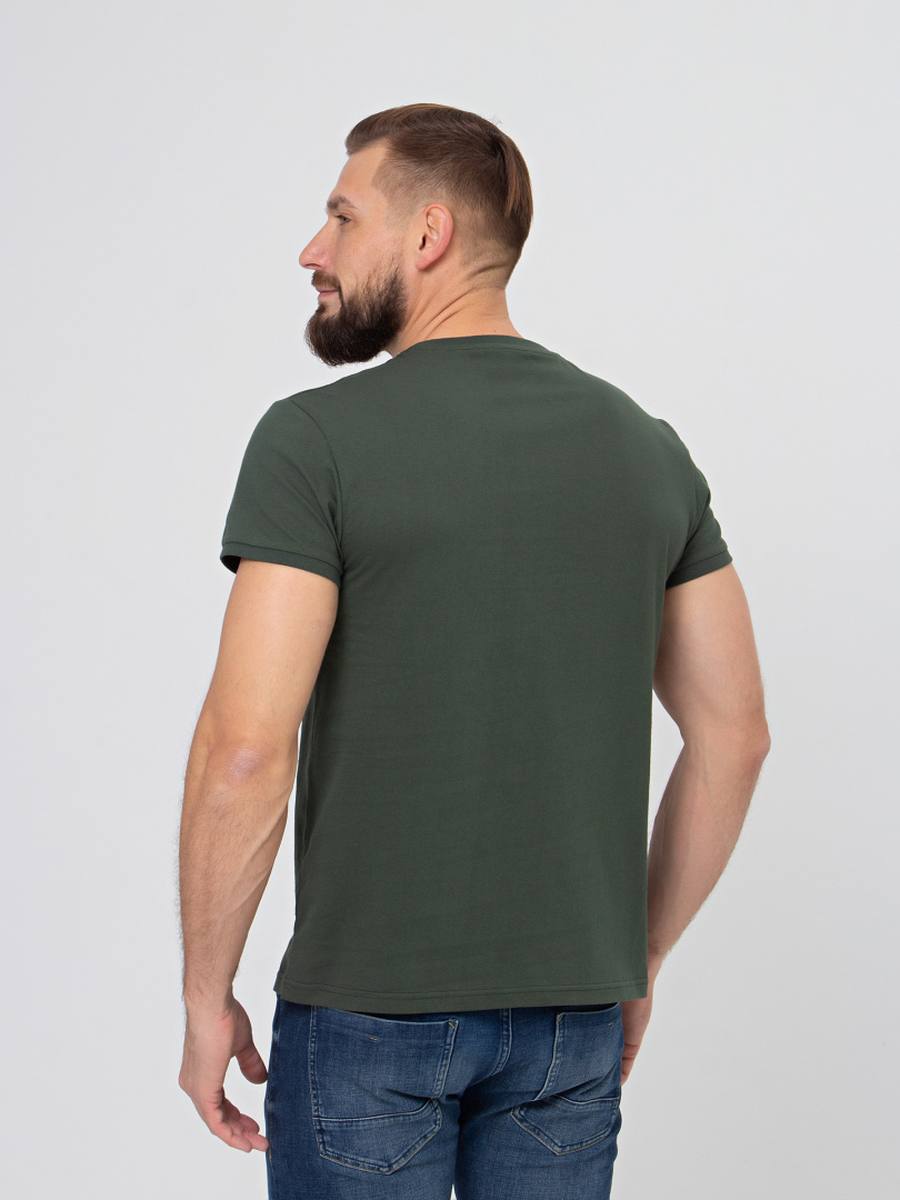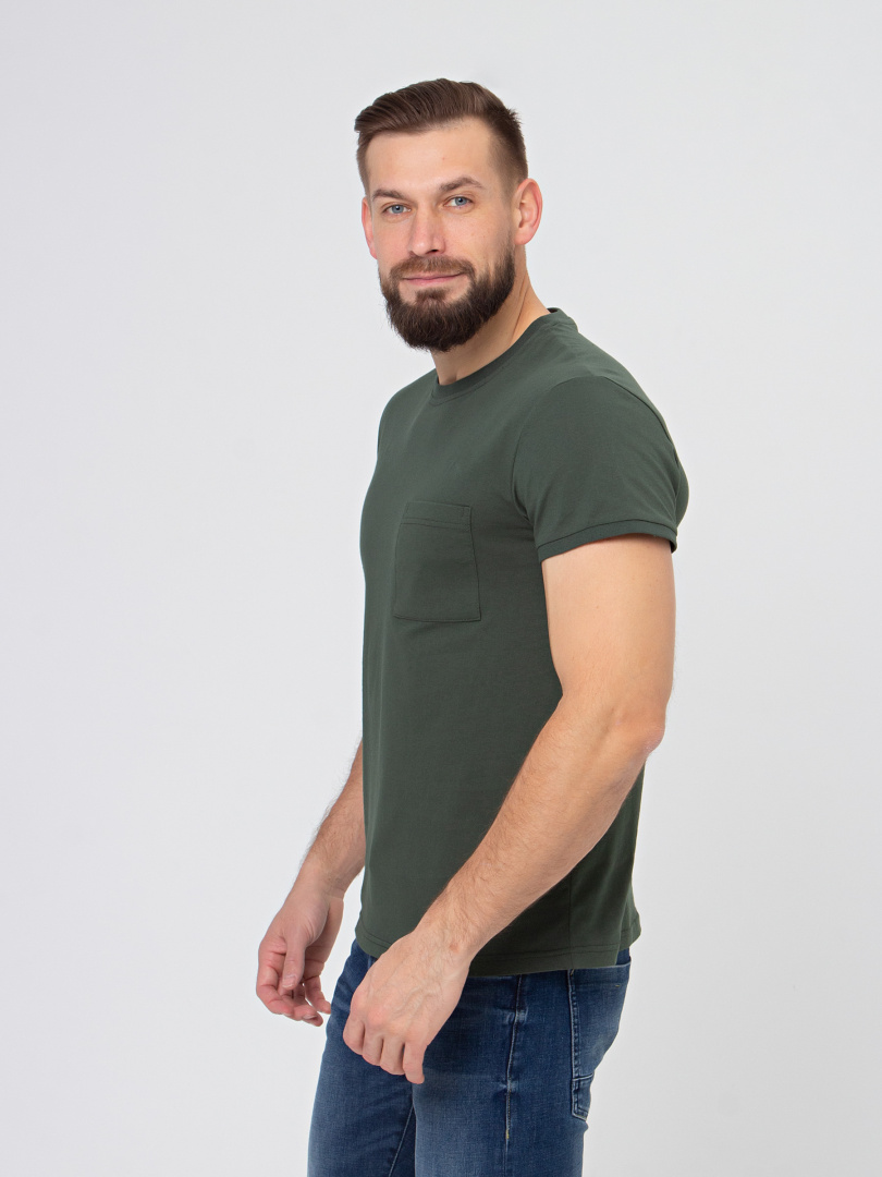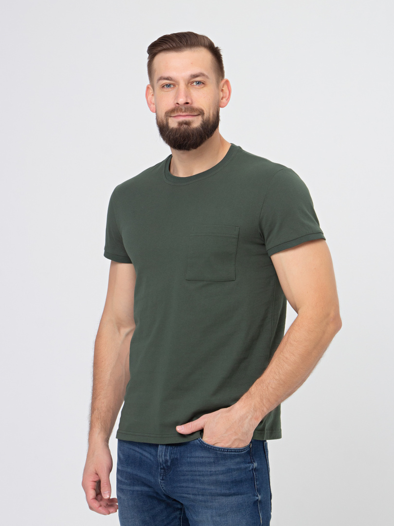 Футболка прямого покроя с круглым вырезом горловины. Базовая модель на каждый день. Модель дополнена нагрудным карманом. По низу рукава - манжеты.