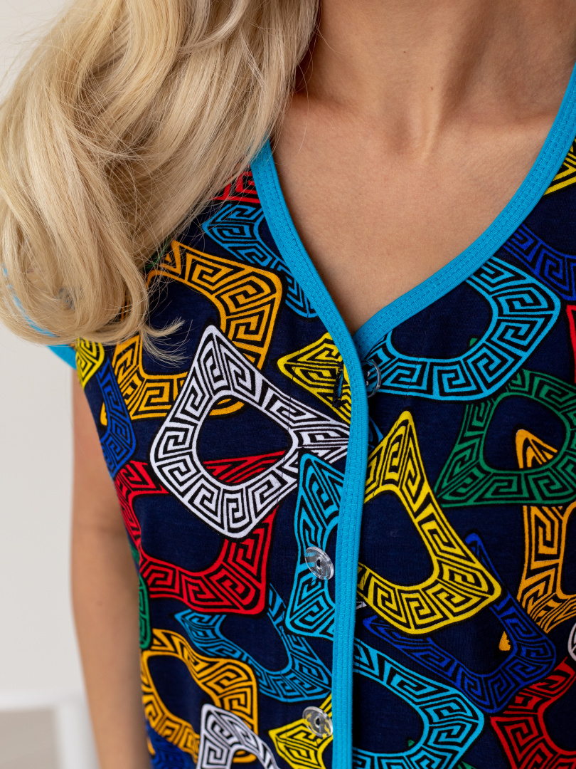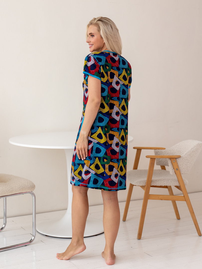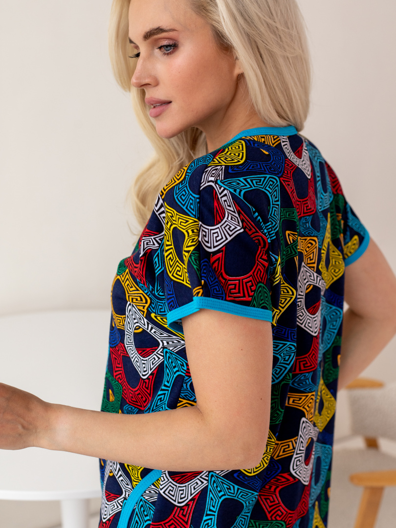 Женский трикотажный халат свободного А-образного силуэта.   Длина изделия -  мини, рукава – кимоно.  По переду - удобные боковые  карманы.  Горловина V-образная.  Застежка на 7 петель и пуговиц.  Модель декорирована окантовкой из отделочной ткани. Это отличный выбор для жарких летних месяцев.