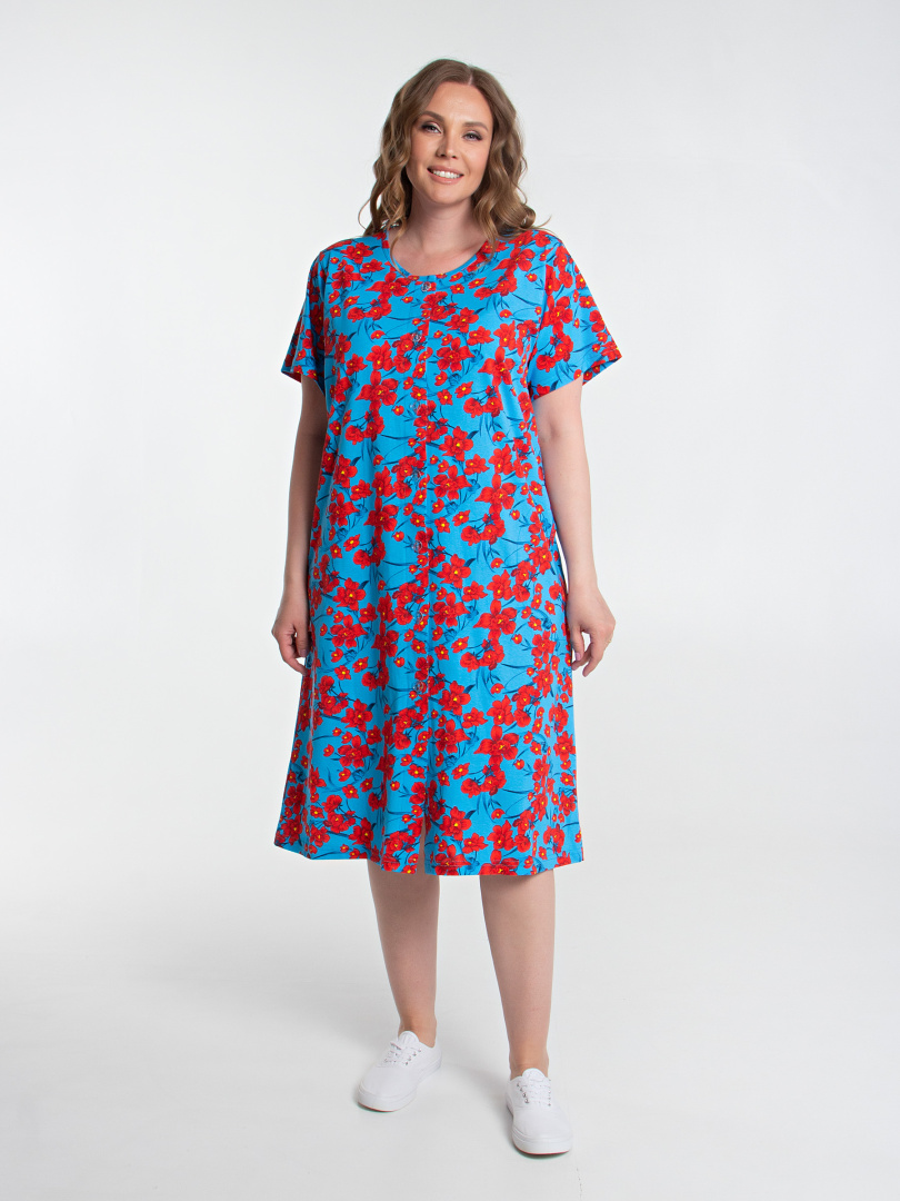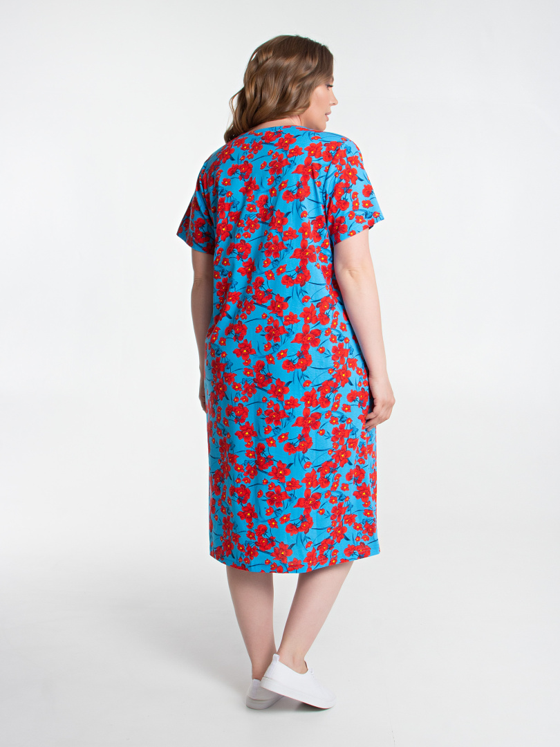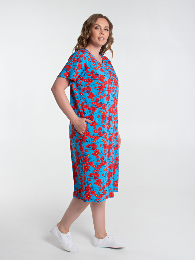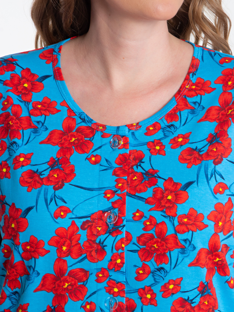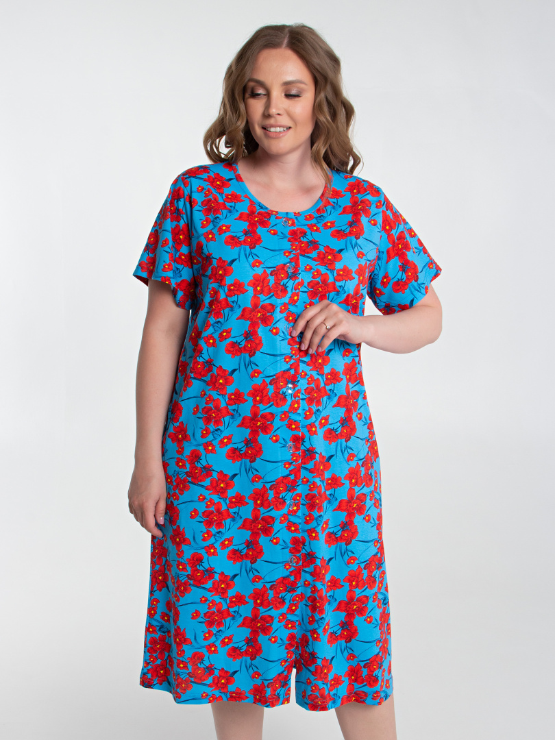 Женский трикотажный халат свободного покроя с втачным коротким рукавом. Длина изделия ниже колена. По переду - удобные боковые карманы. Горловина круглая. Застежка на 7 петель и пуговиц.