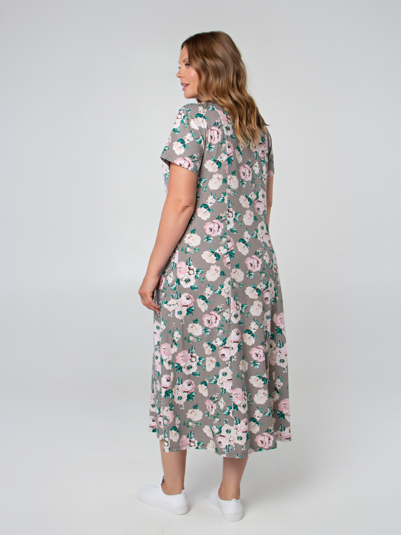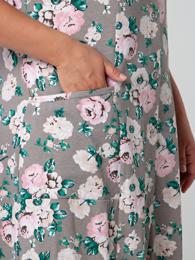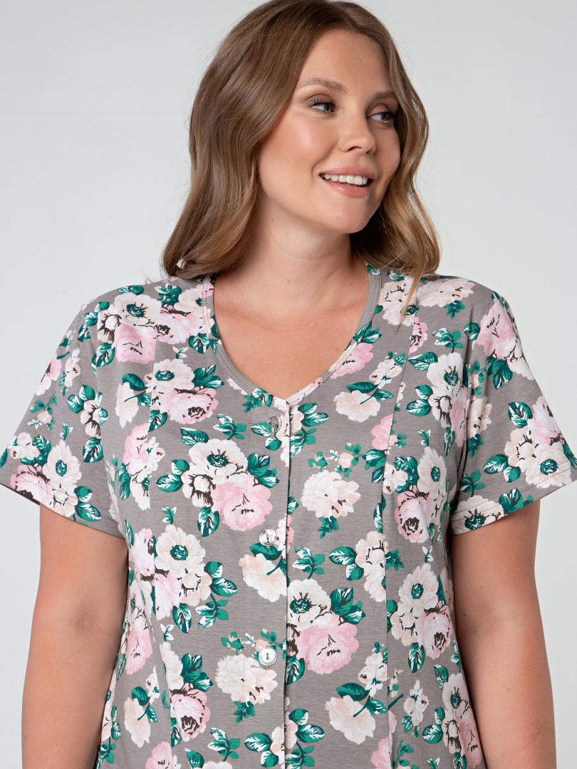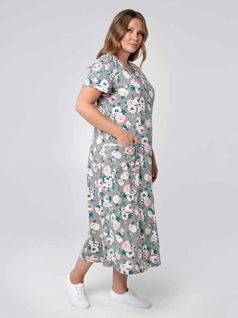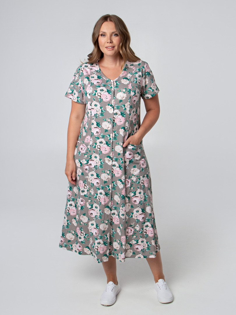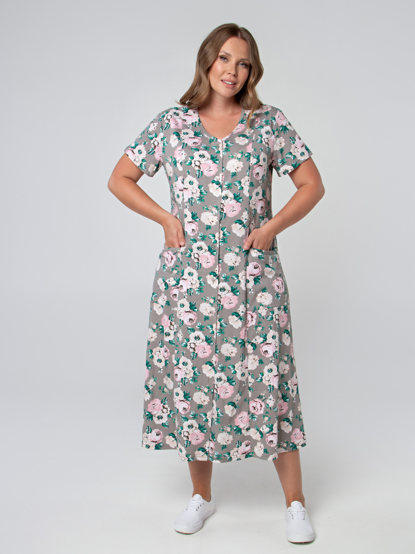 Женский трикотажный халат полуприлегающего силуэта, слегка расклешённый книзу Длина изделия - макси, втачной короткий рукав. На боковых частях переда - удобные боковые карманы. Небольшая V-образная горловина. Застежка на 8 петель и пуговиц. Отличный вариант для тех, кто любит длинные халаты.