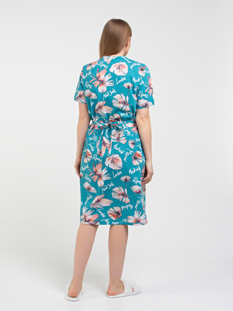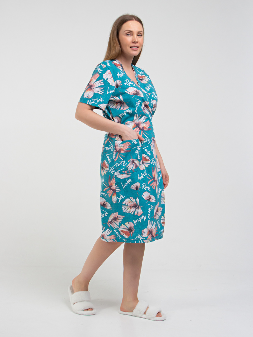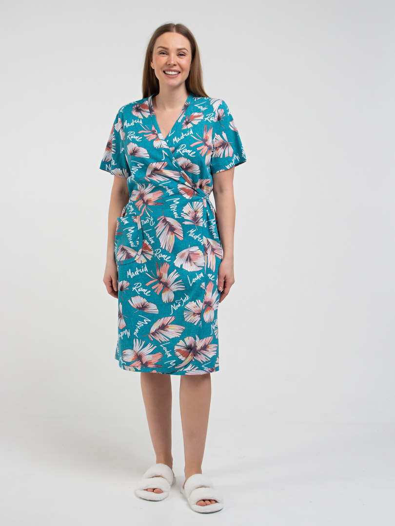 Женский хлопковый трикотажный халат прямого покроя с запахом. Модель с втачным коротким рукавом. Длина изделия - миди. По переду справа - накладной карман. Горловина V-образная. Модель декорирована окантовкой из отделочной ткани.
