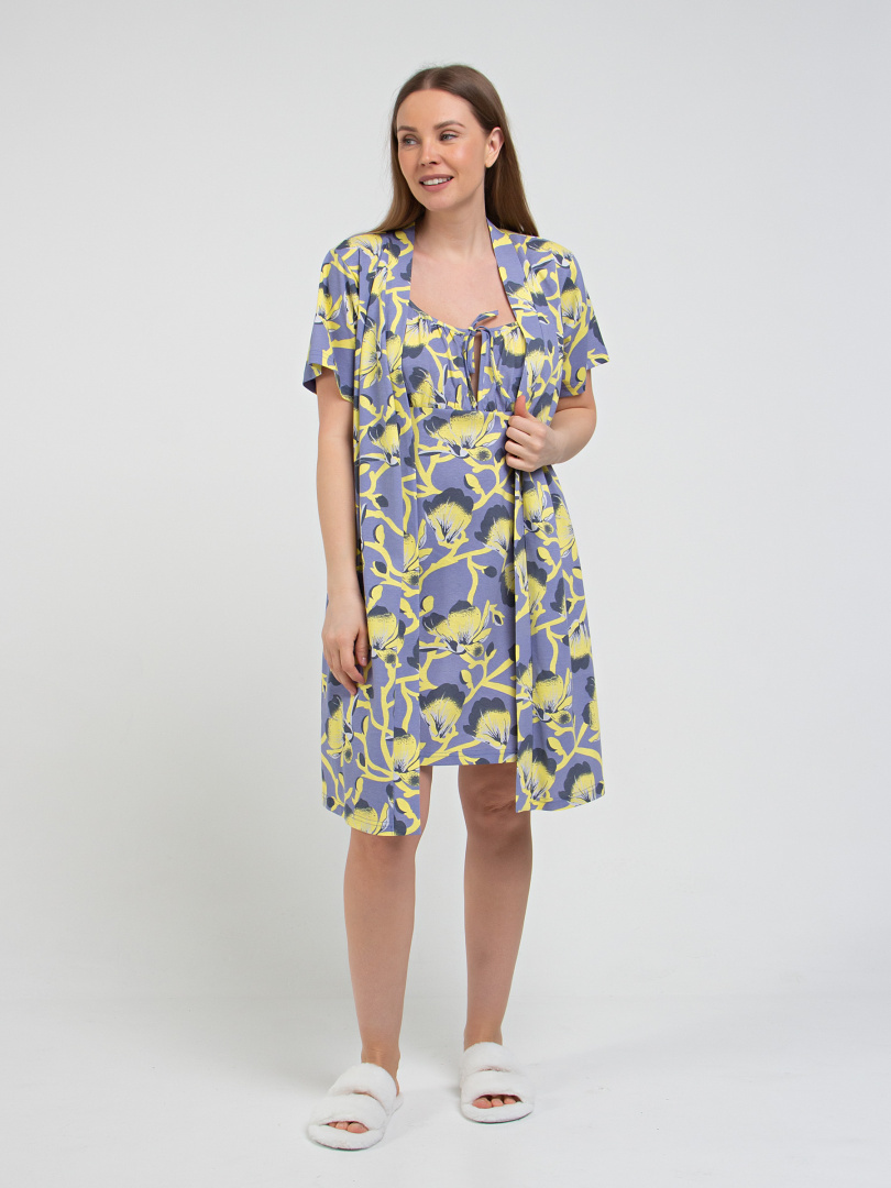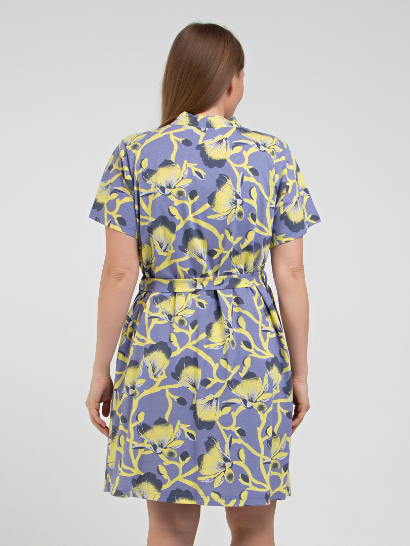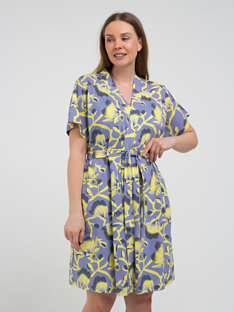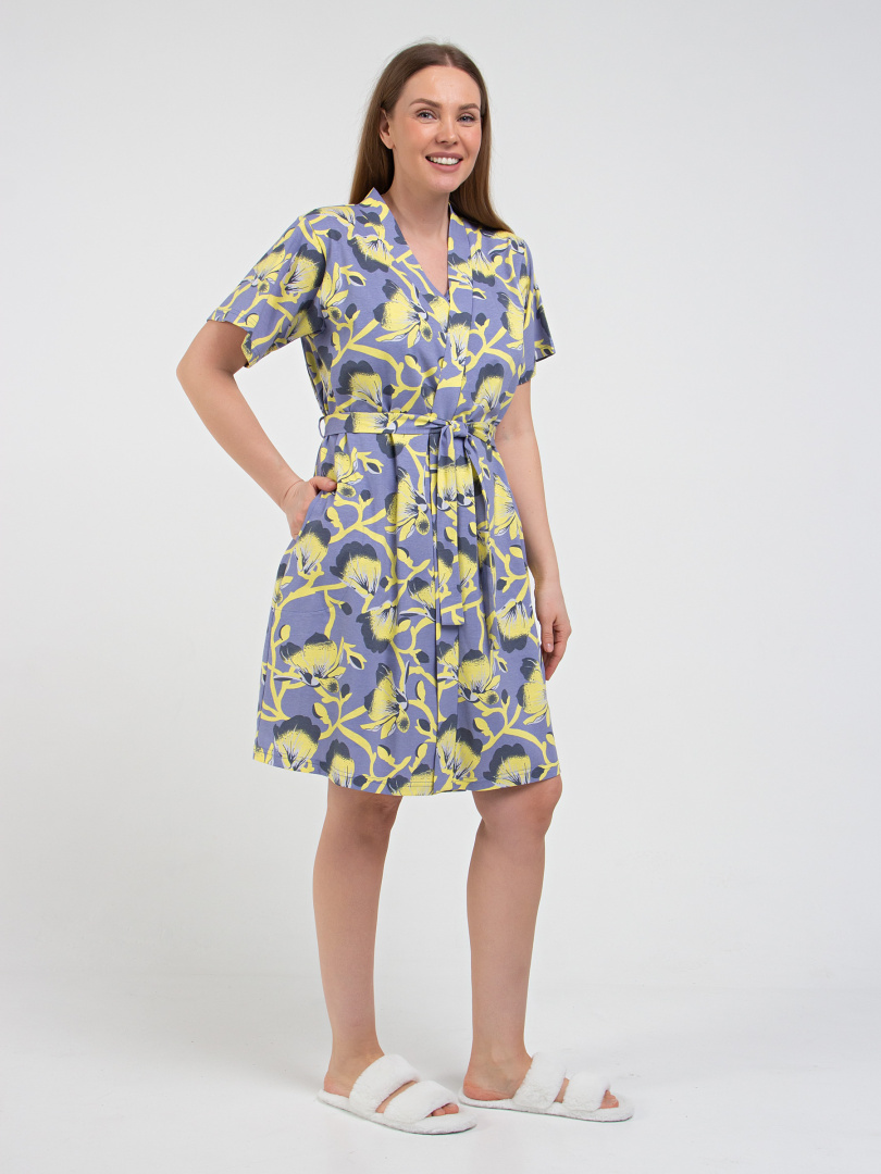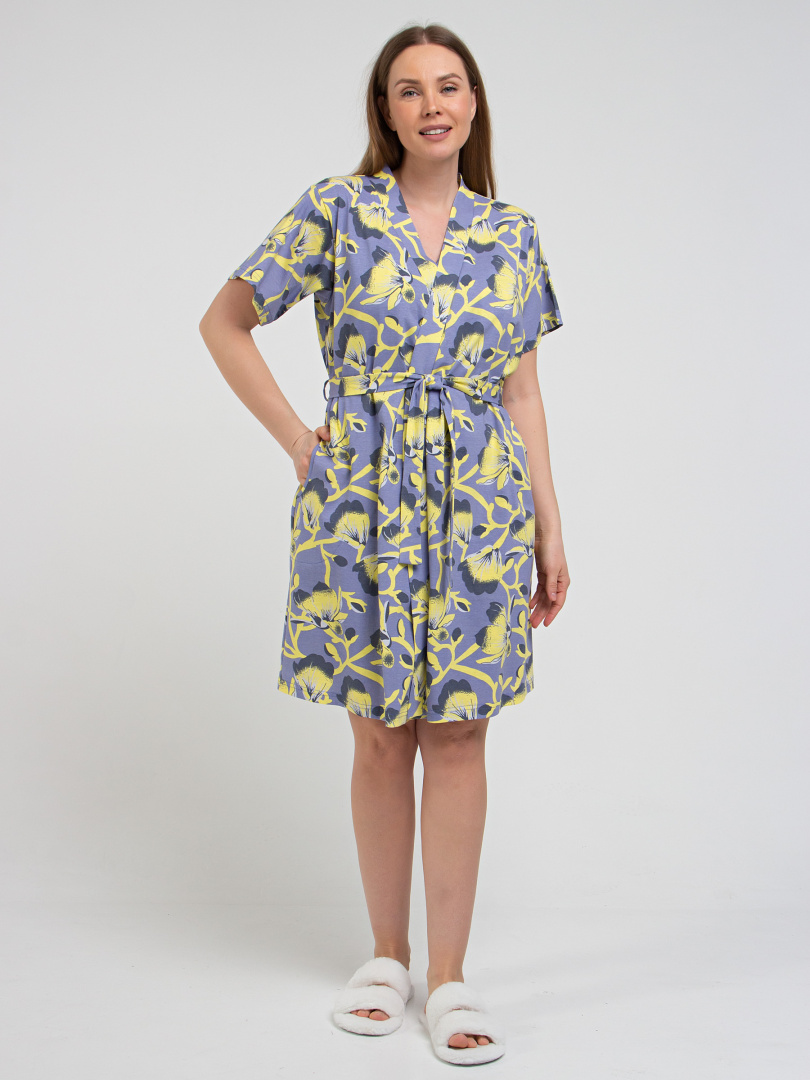 Женский трикотажный халат прямого покроя с запахом. Модель с втачным коротким рукавом. Длина изделия выше колена. По переду - удобные боковые карманы. Украшает модель фигурная планка без застежки. Модель дополнена поясом.