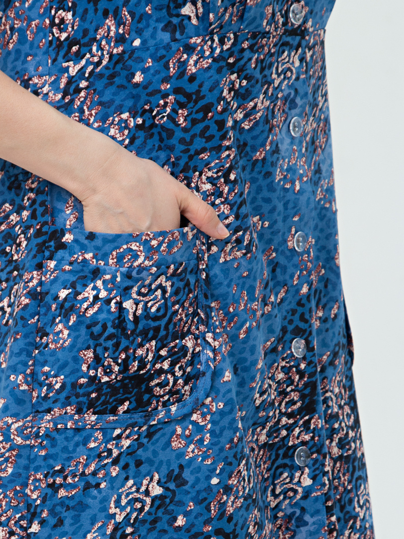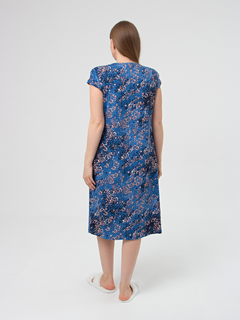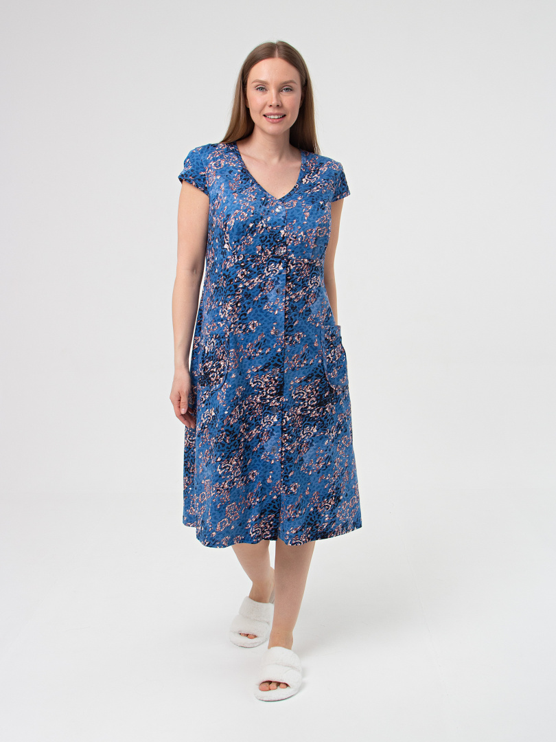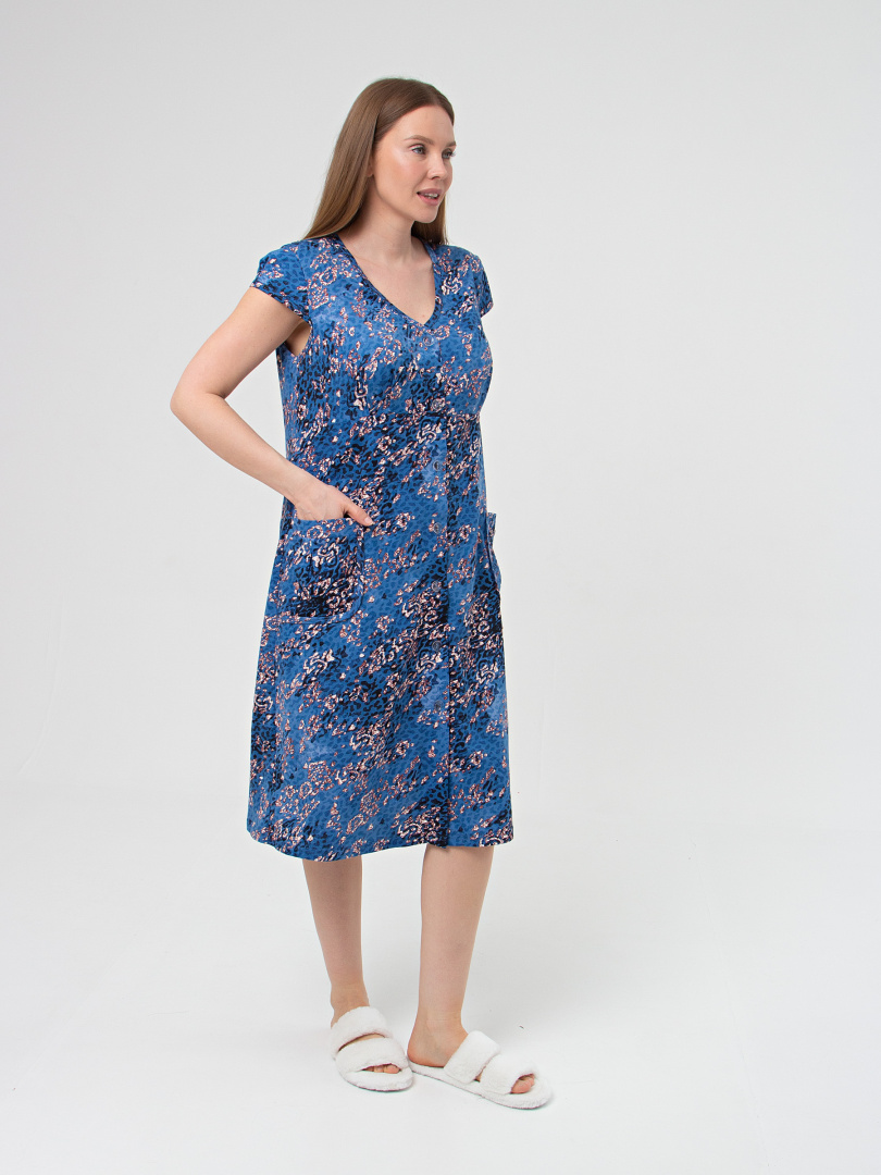 Женский трикотажный халат прилегающего силуэта с коротким рукавом. Длина изделия ниже колена. По переду – накладные карманы и кокетка. Рукава, кокетки переда и карманы имеют мягкие защипы. Горловина V- образная. Застежка на 7 петель и пуговиц. Это отличный выбор для жарких летних месяцев.