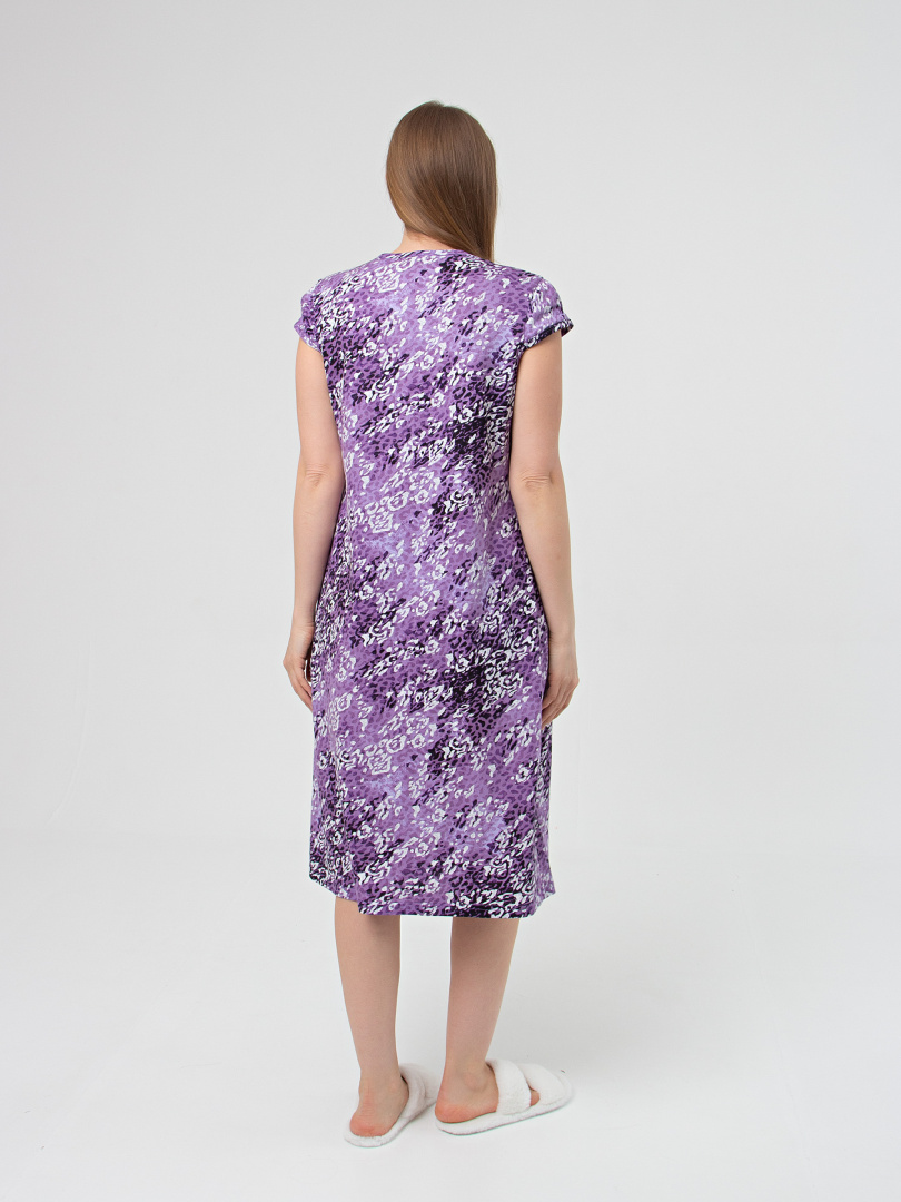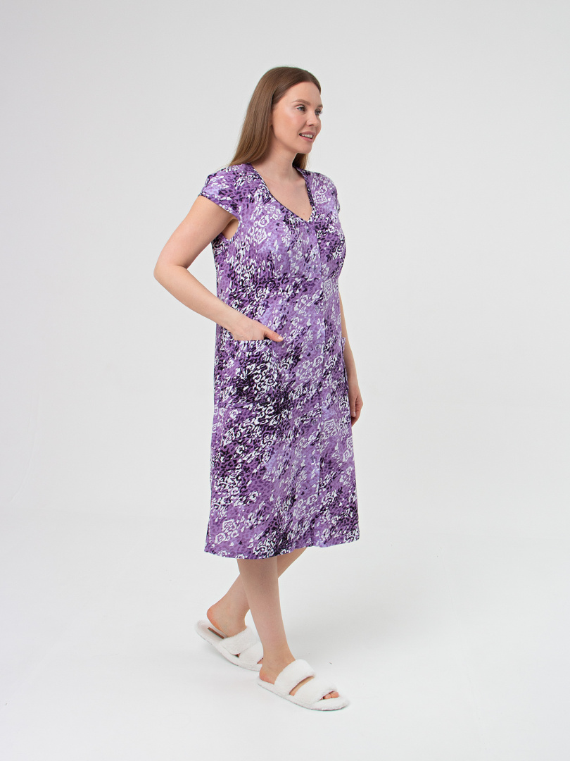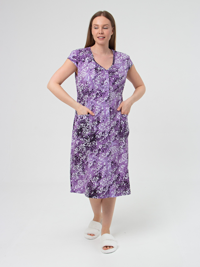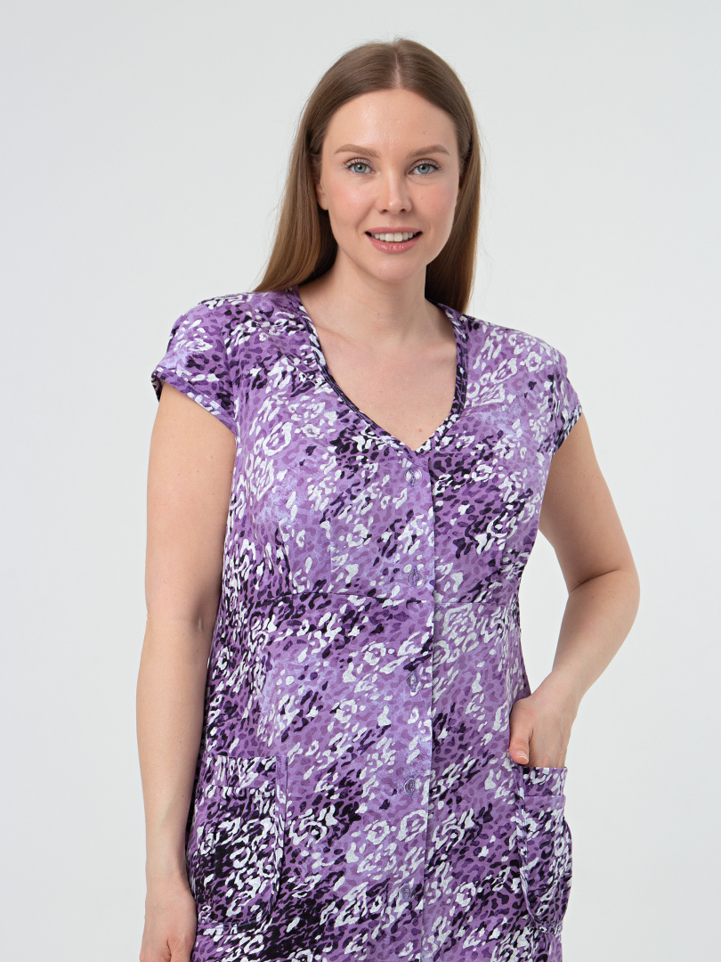 Женский трикотажный халат прилегающего силуэта  с коротким  рукавом. Длина изделия  ниже колена. По переду – накладные карманы и кокетка. Рукава, кокетки переда и карманы имеют мягкие защипы. Горловина V- образная. Застежка на 7 петель и пуговиц.  Это отличный выбор для жарких летних месяцев.