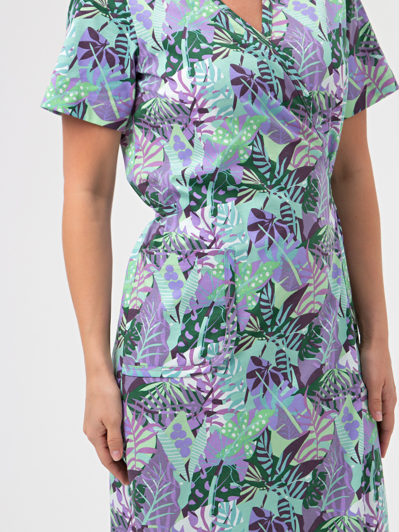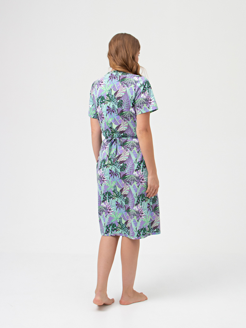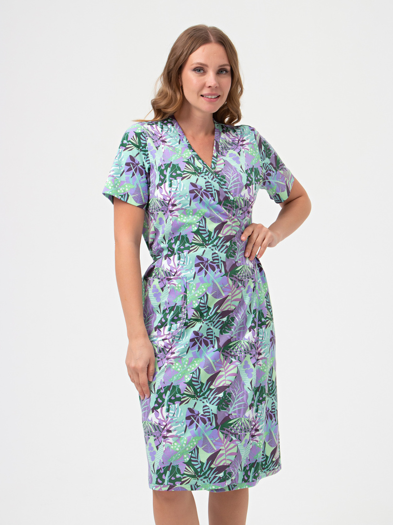 Женский хлопковый трикотажный халат прямого покроя с запахом. Модель с втачным коротким рукавом. Длина изделия - миди. По переду справа - накладной карман. Горловина V-образная. Модель декорирована окантовкой из отделочной ткани.