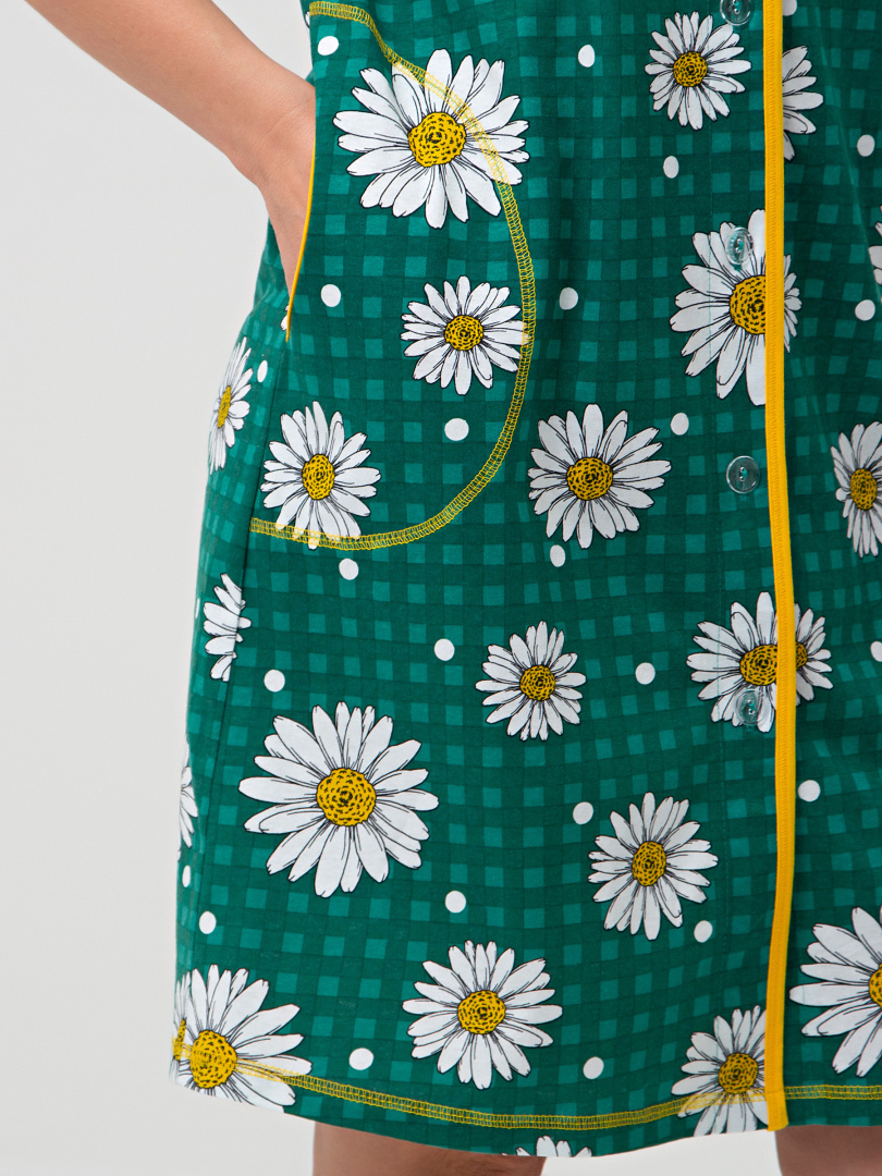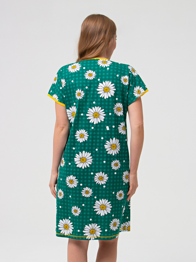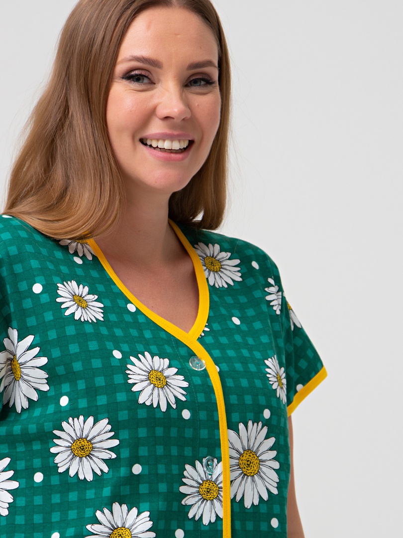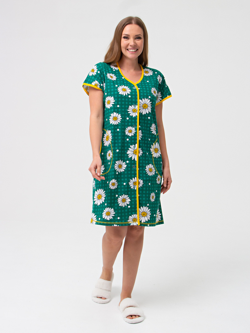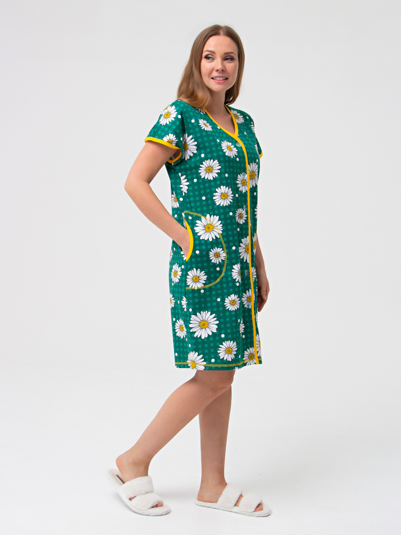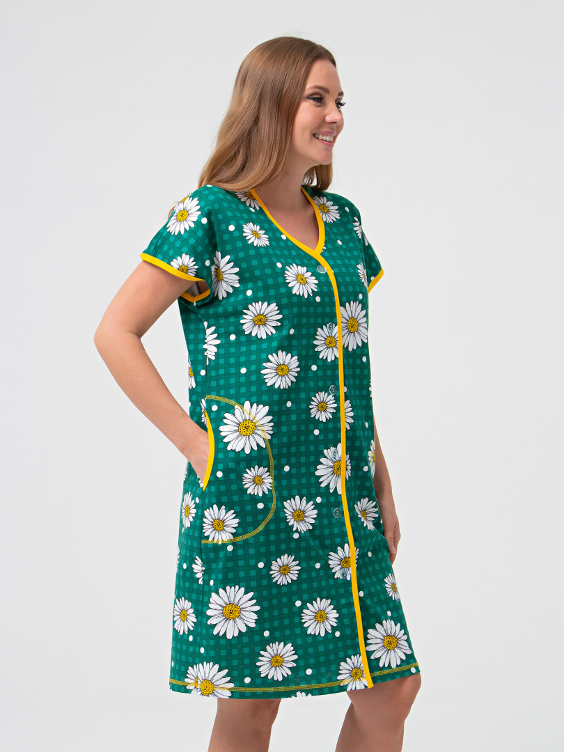 Женский трикотажный халат свободного А-образного силуэта.   Длина изделия -  мини, рукава – кимоно.  По переду - удобные боковые  карманы.  Горловина V-образная.  Застежка на 7 петель и пуговиц.  Модель декорирована окантовкой из отделочной ткани. Это отличный выбор для жарких летних месяцев.