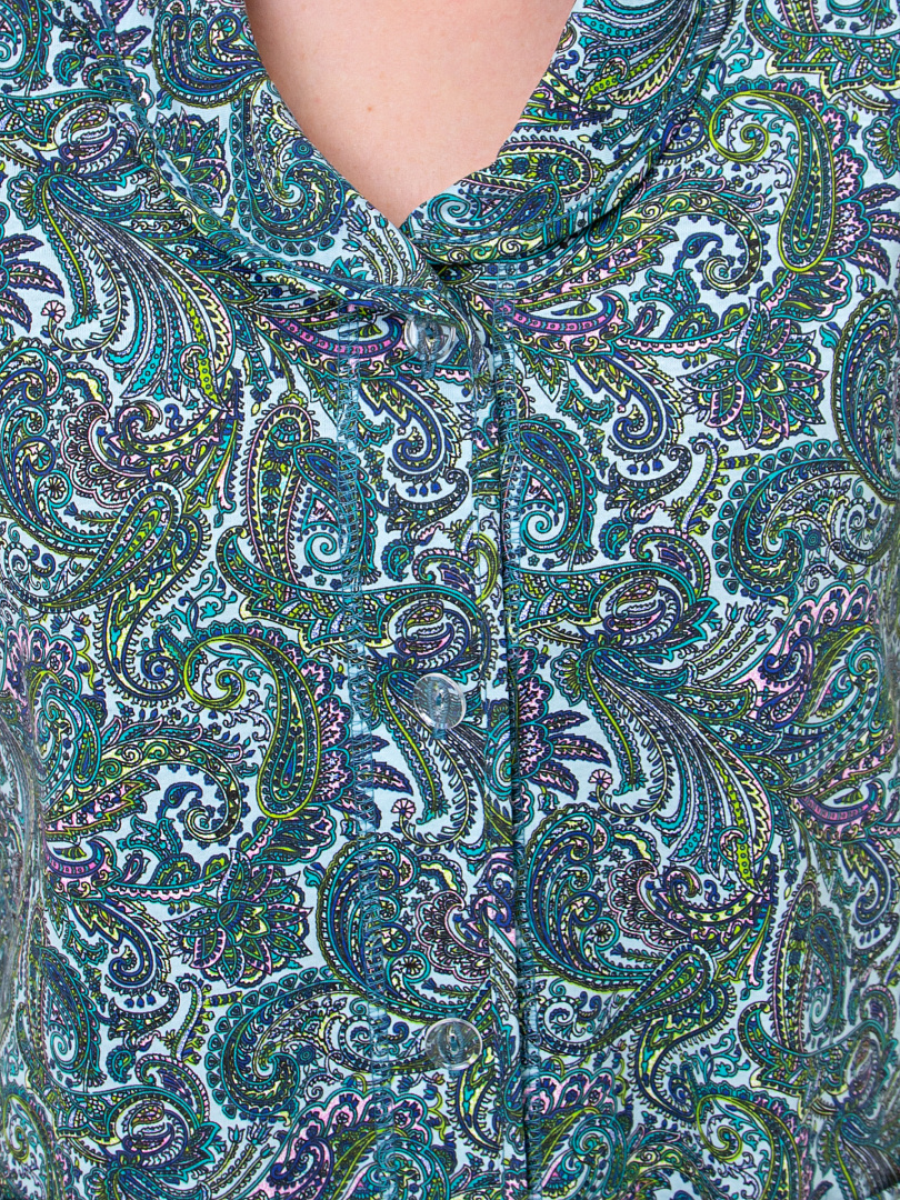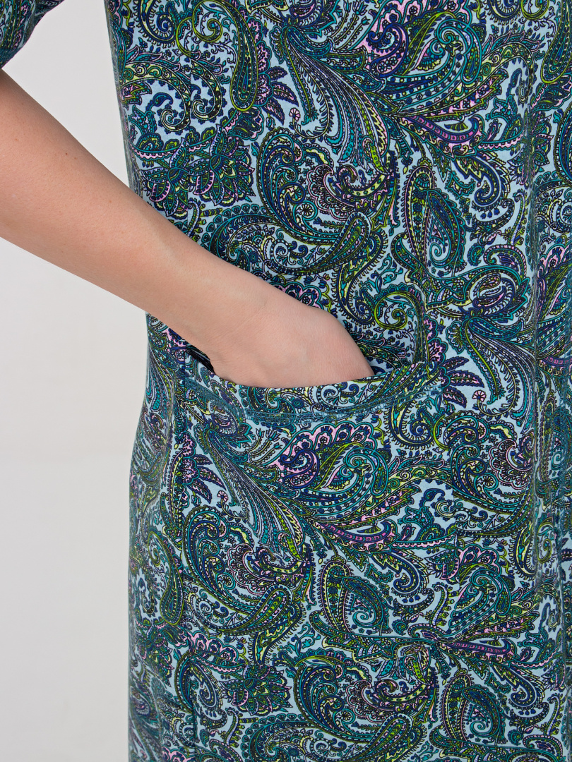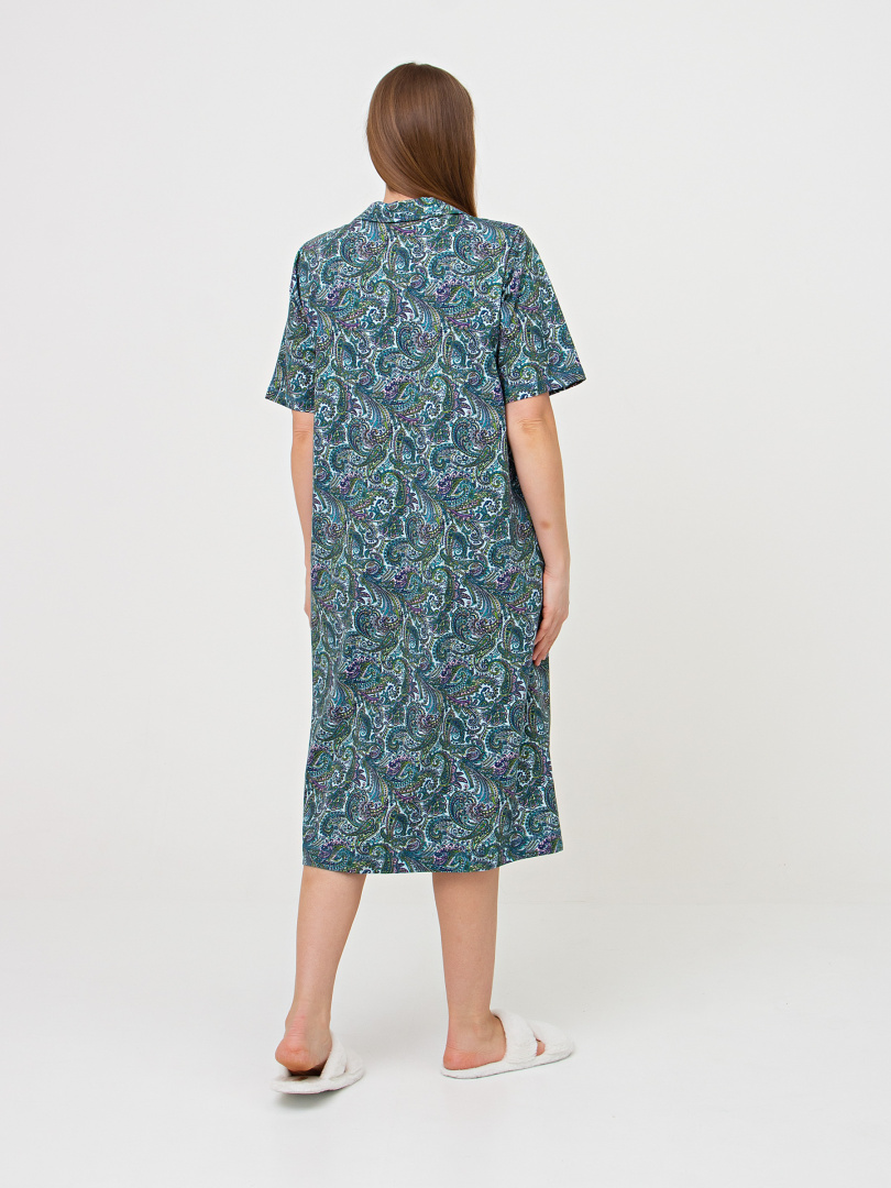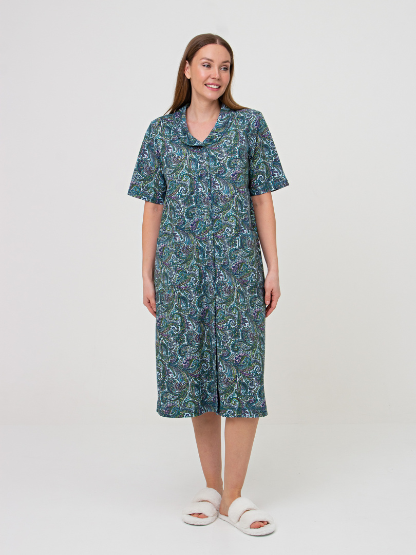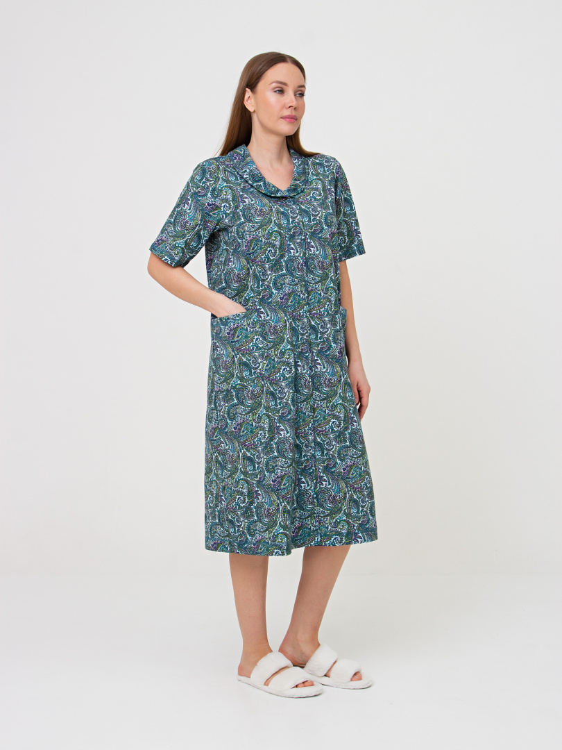 Женский трикотажный халат свободного покроя с втачным коротким рукавом. Длина изделия ниже колена. На переде - накладные карманы. По горловине небольшой шалевый воротник. Застежка на 7 петель и пуговиц. Модель декорирована окантовкой из отделочной ткани.