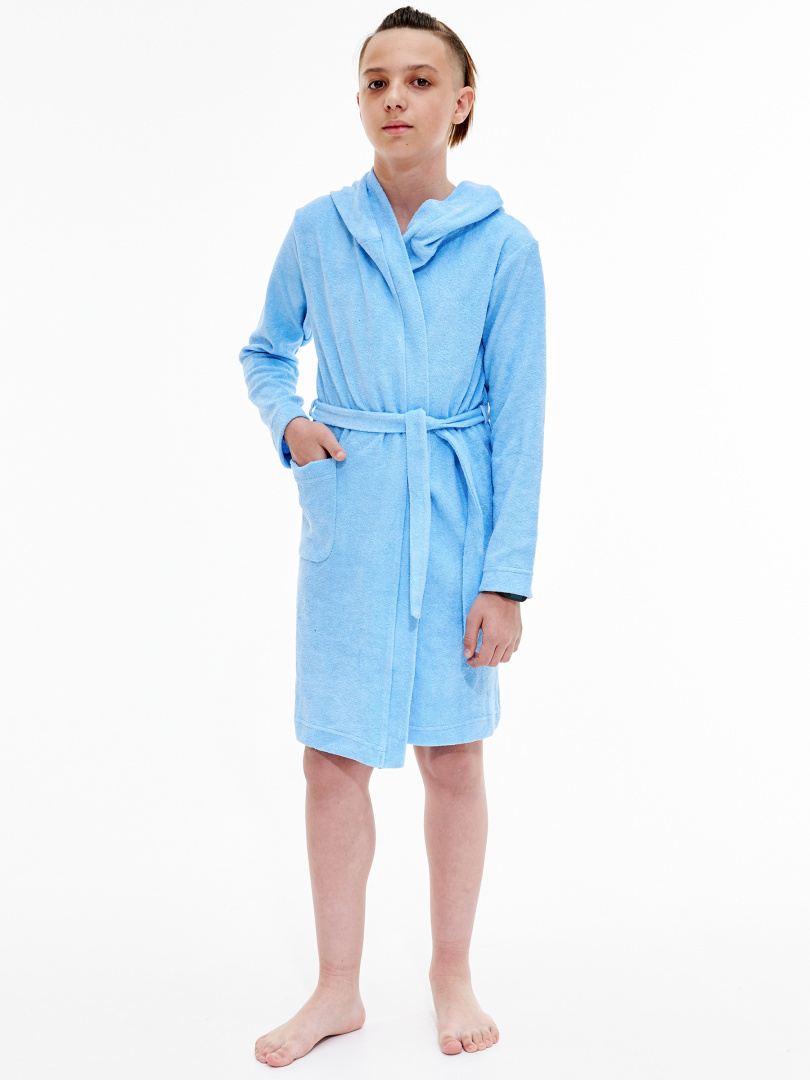 Детский трикотажный халат прямого покроя с запахом. Модель с длинным втачным рукавом и капюшоном. Длина изделия - миди. По переду - один накладной карман. Модель дополнена поясом.
