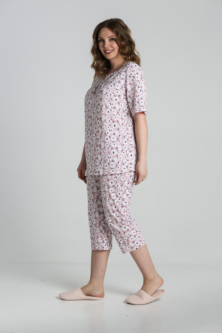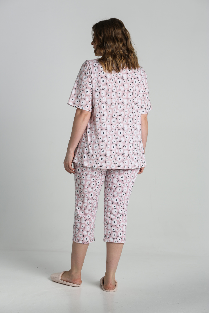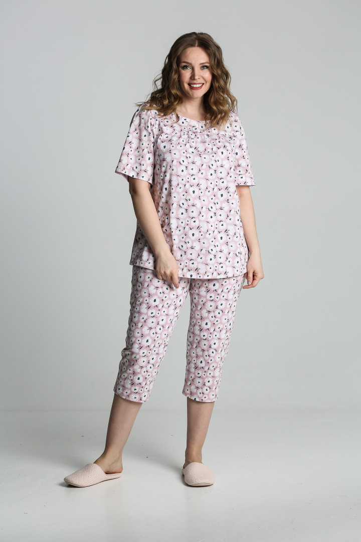 Хлопковая женская трикотажная пижама, состоящая из блузки и бриджей.  Блузка А-образного  свободного силуэта. Короткий втачной рукав.  Круглый вырез горловины. По переду – кокетка с планкой и двумя пуговицами, под ней – небольшая сборка.  Бриджи классические прямые. На талии – резинка.