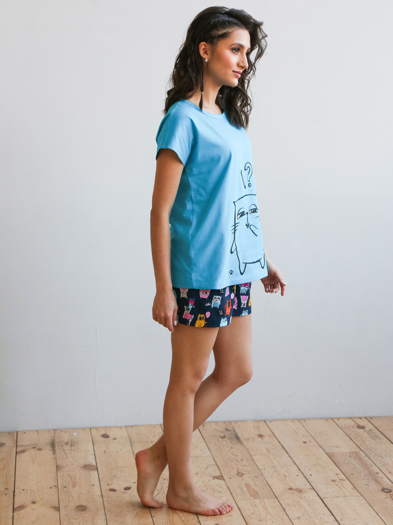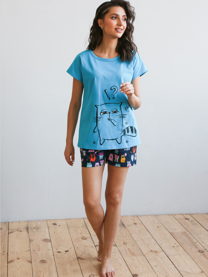 Женский комплект из футболки и шорт. Прямая футболка свободного силуэта. Изделие с рукавом кимоно. Небольшой круглый вырез горловины. По переду выполнен декоративный принт. Шорты свободного силуэта с защипами по линии талии. По переду – боковые карманы. Пояс с широкой резиной.