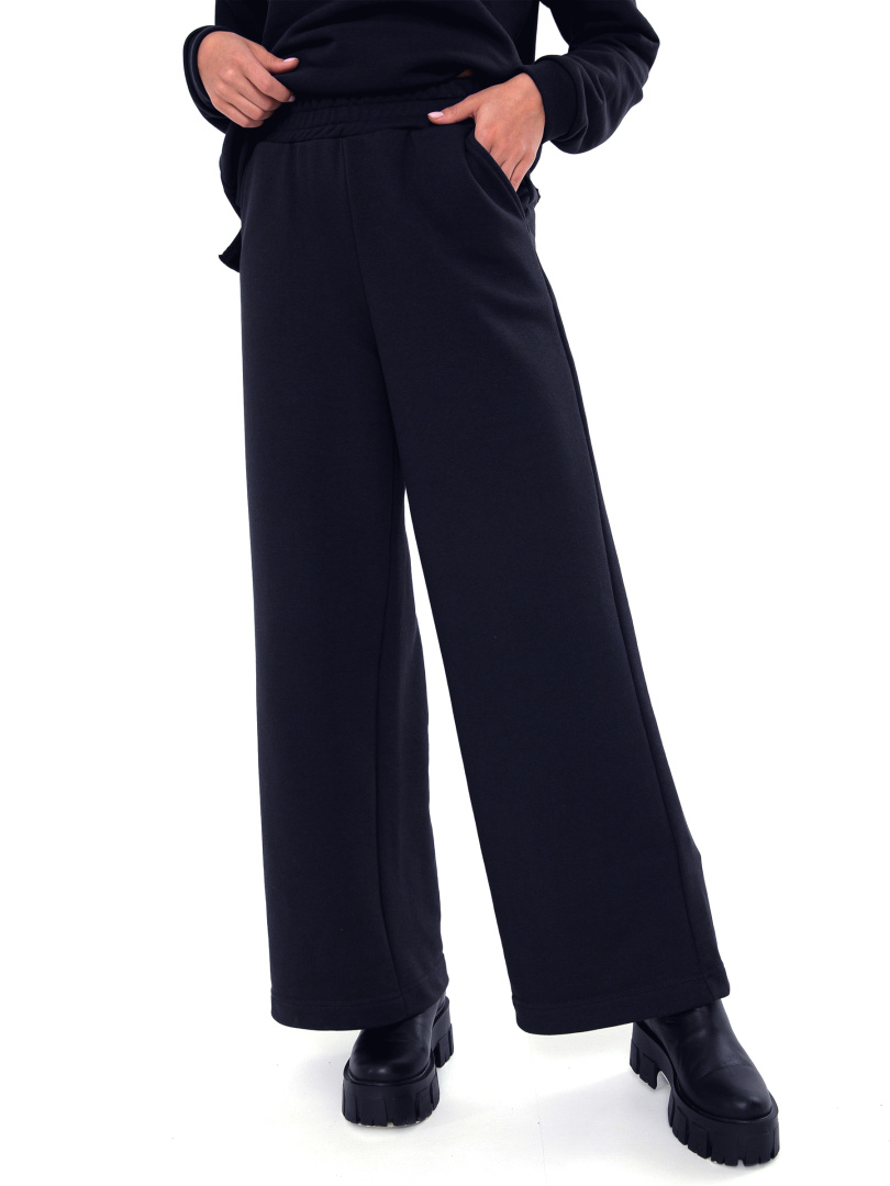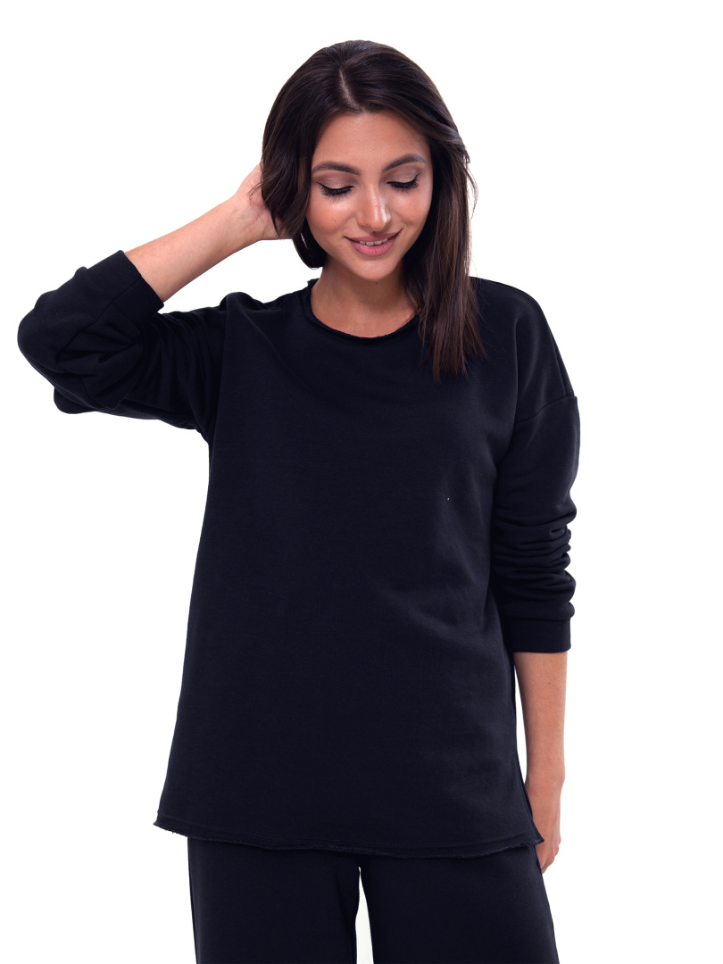 Уютный  женский трикотажный комплект из джемпера и брюк.  Джемпер современного свободного покроя со спущенным плечом. Рукав на манжете, зауженный к низу.  Изделие выполнено из однотонного футера-петля. Модель имеет круглый вырез горловины и разрезы по боковым швам. Низ джемпера – стильный необработанный край. Длинные брюки современного прямого покроя.  Притачной пояс с широкой резинкой.  На передних половинках боковые  карманы с наклонным входом.  Комплект идеален для повседневной носки.