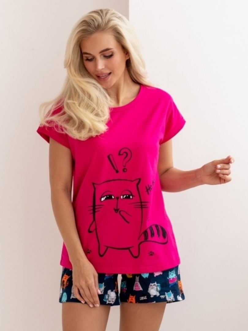 Женский комплект из футболки и шорт. Прямая футболка свободного силуэта.  Изделие с рукавом кимоно.  Небольшой круглый вырез горловины. По переду выполнен декоративный принт. Шорты свободного силуэта с защипами по линии талии.  По переду – боковые карманы. Пояс с широкой резиной.
