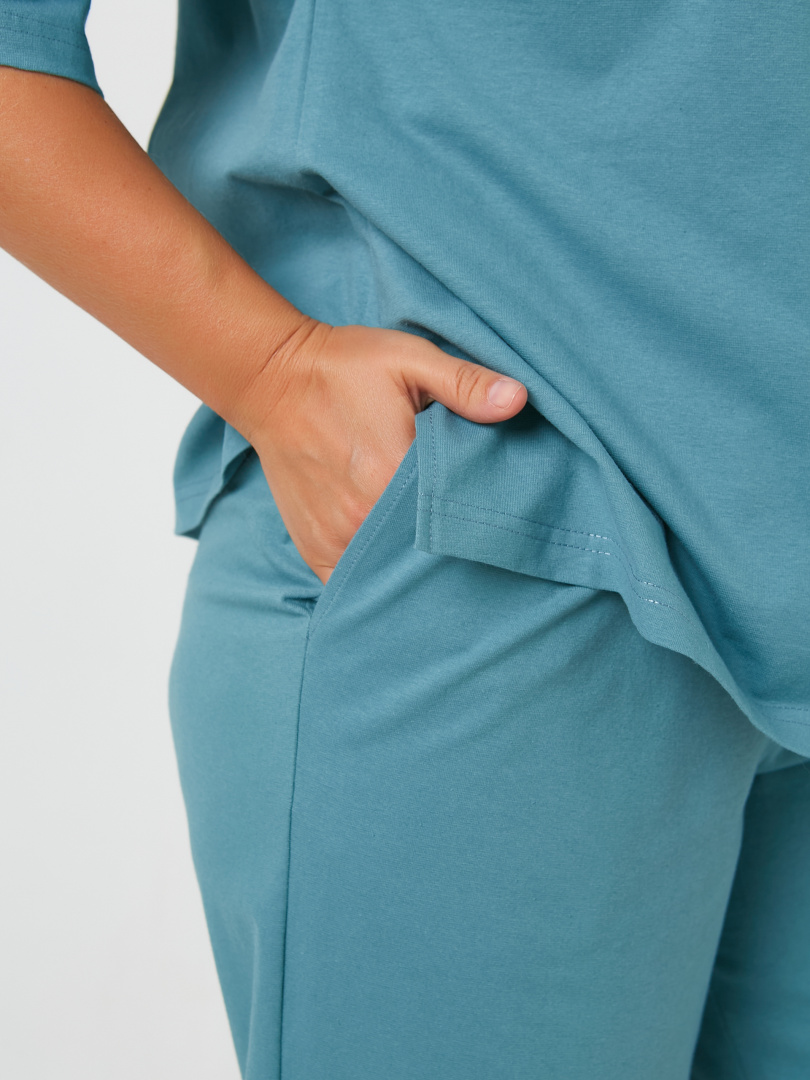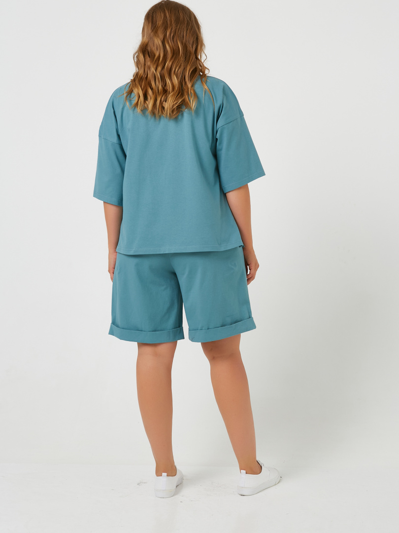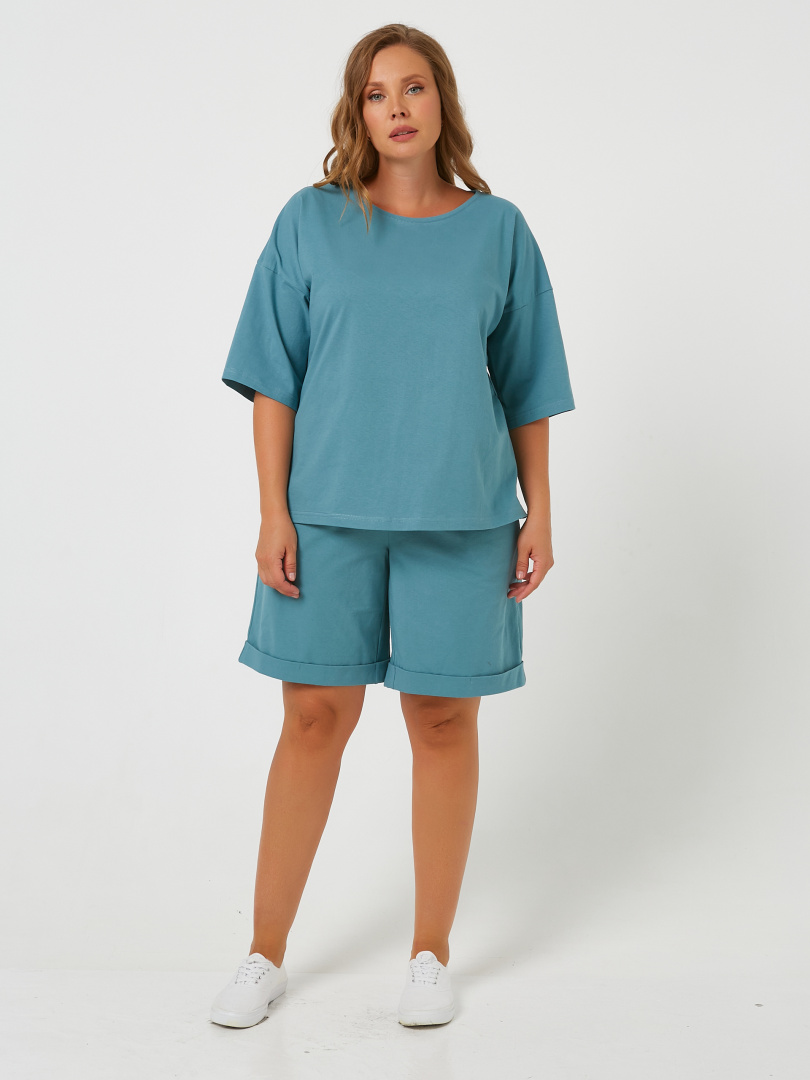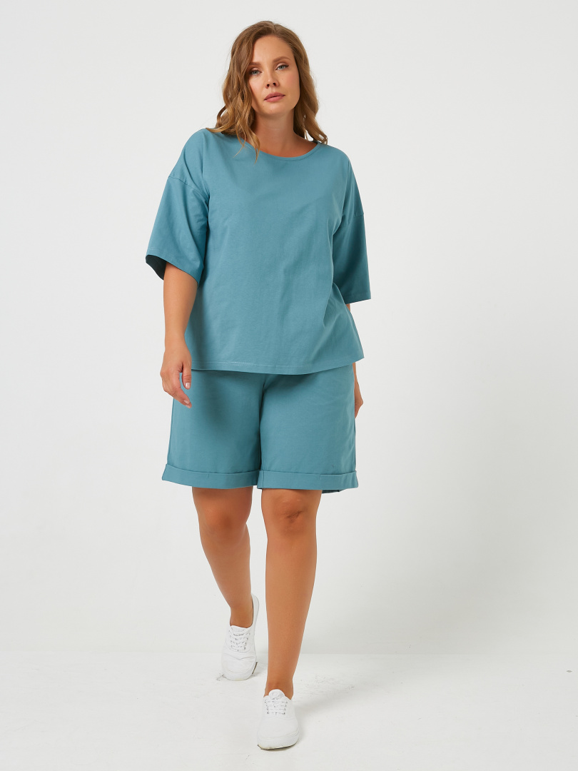 Женский комплект из мягкого трикотажа. Футболка средней длины. Покрой свободный со спущенным рукавом до локтя. Вырез круглый. В боковых швах разрезы. Шорты средней длины. Модель с высокой посадкой. Пояс на широкой резине со шнуром.  На передних половинках боковые карманы с наклонным входом. По низу – отвороты.