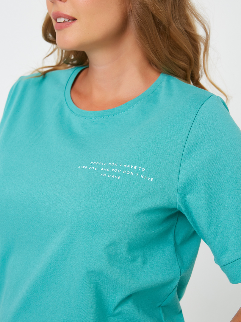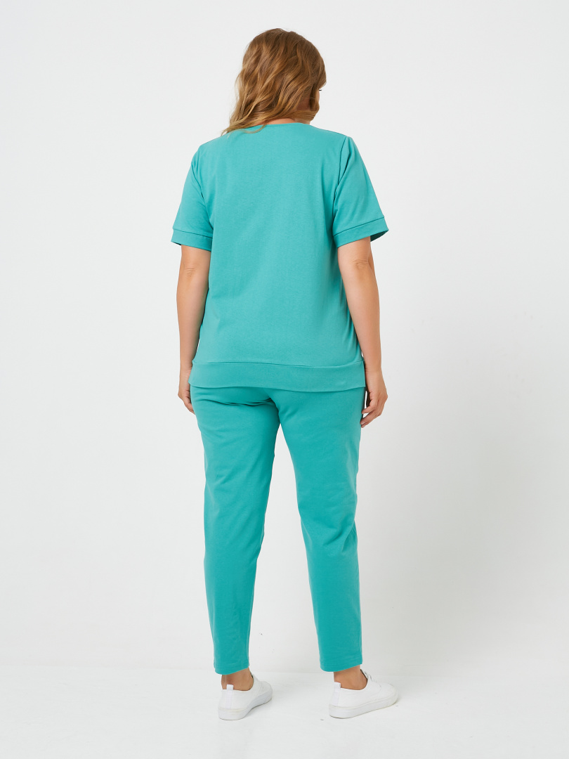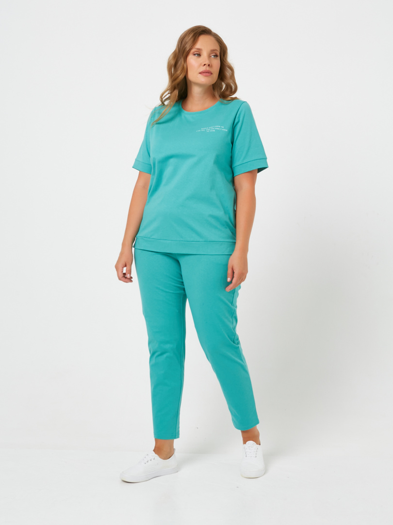 Женский комплект из мягкого трикотажа. Футболка средней длины. Модель прямого покроя на поясе по низу. Короткий втачной рукав с притачной манжетой. Небольшой круглый вырез горловины. Длинные брюки прямого покроя слегка зауженные к низу. Притачной пояс с широкой резинкой. На передних половинках боковые карманы с наклонным входом. Комплект идеален для повседневной носки.