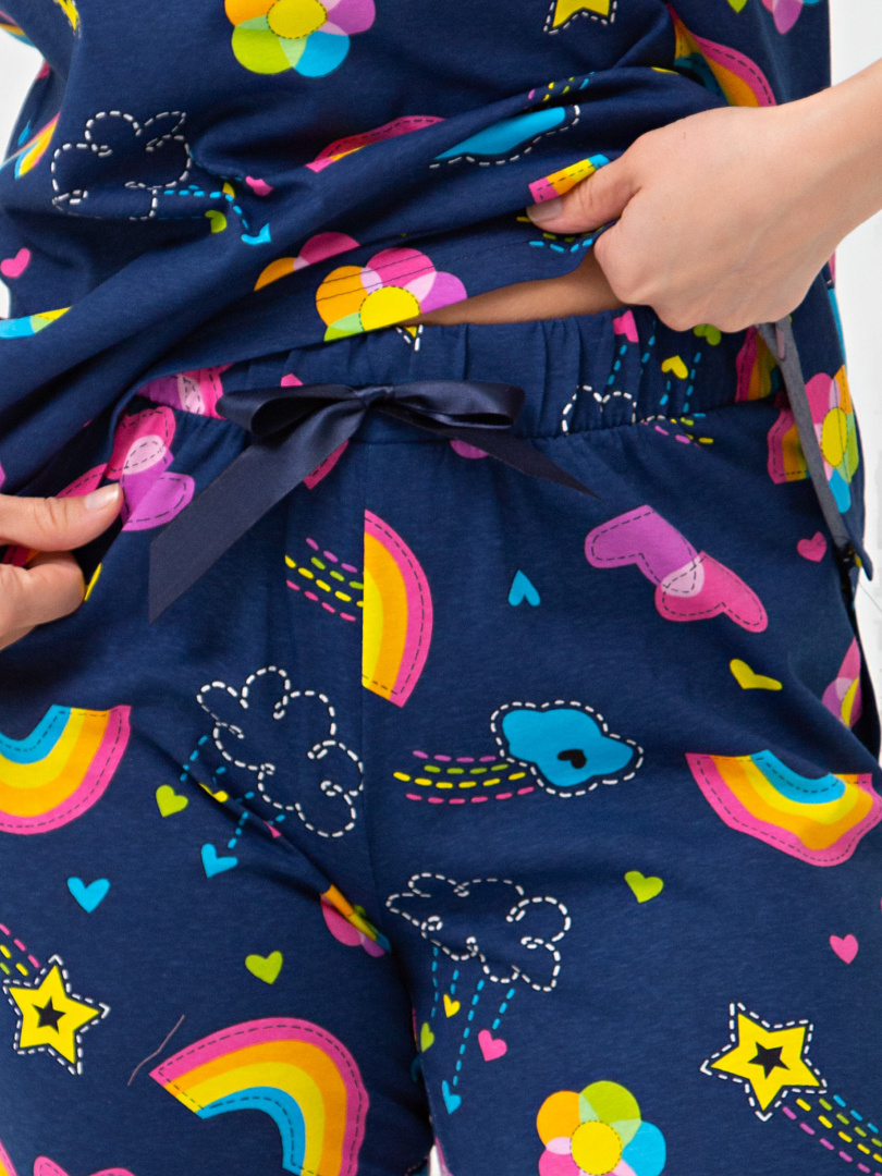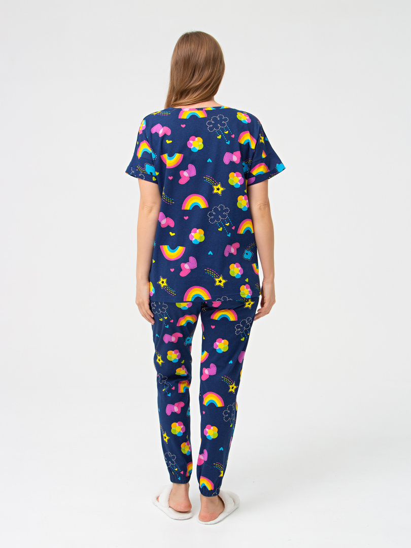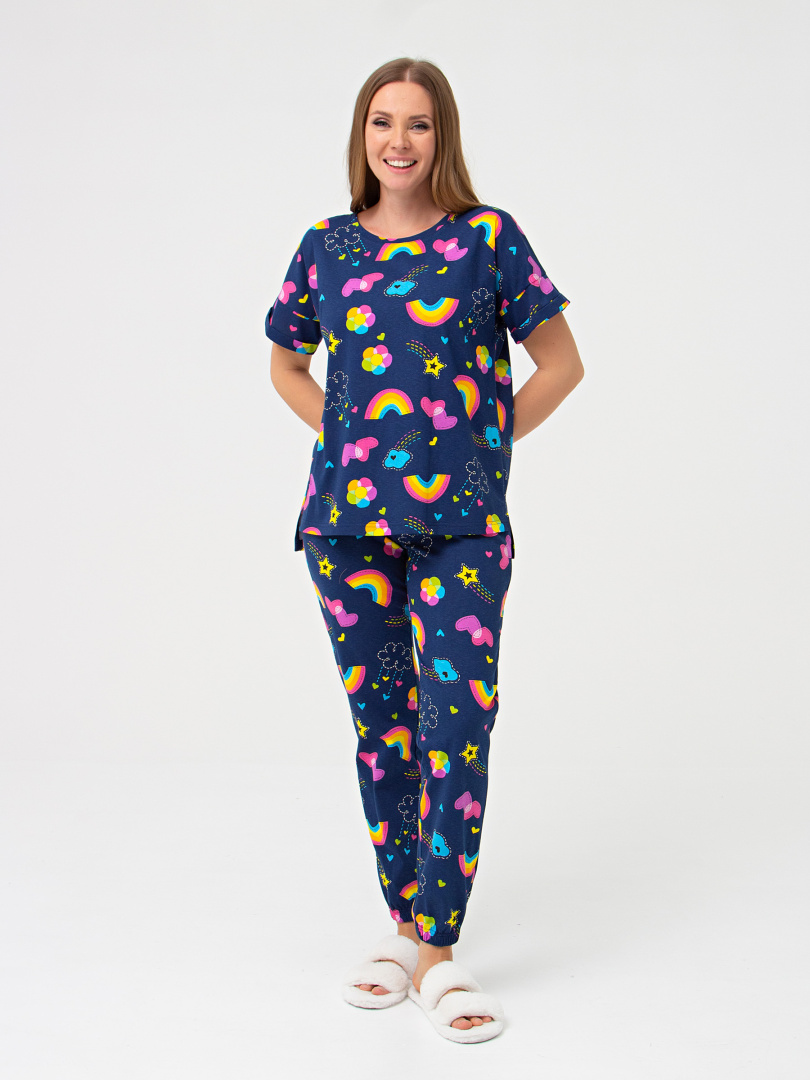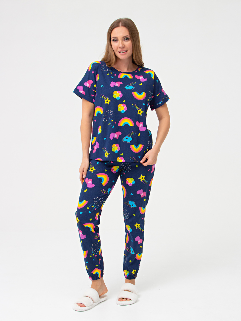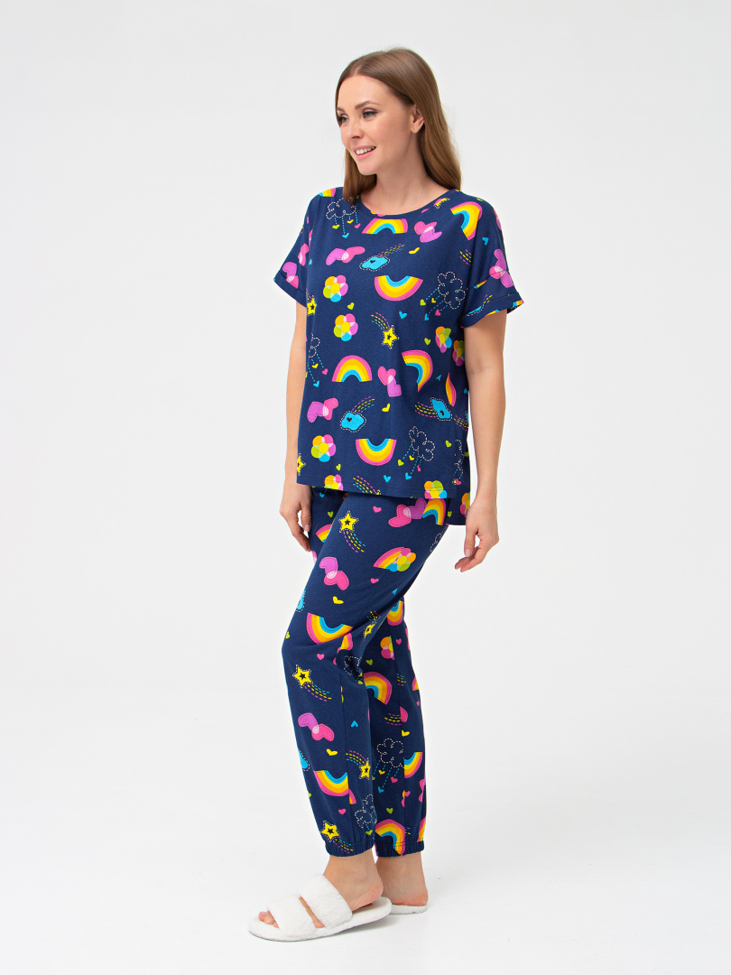 Женский комплект, состоящий из блузки и брюк. Блузка прямого свободного силуэта со спущенным рукавом. Вырез круглый. Брюки прямого покроя, слегка заужены, на широкой резине внизу. Притачной пояс с широкой резинкой.