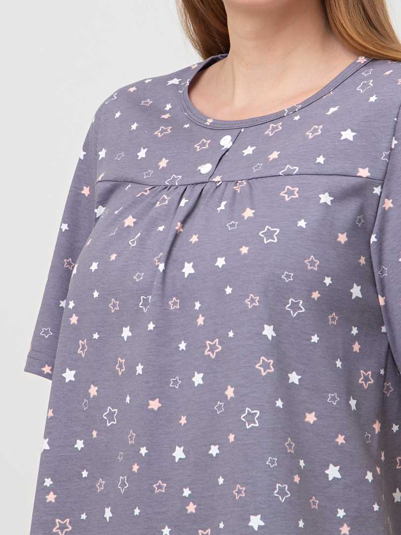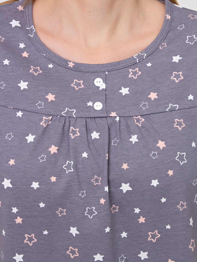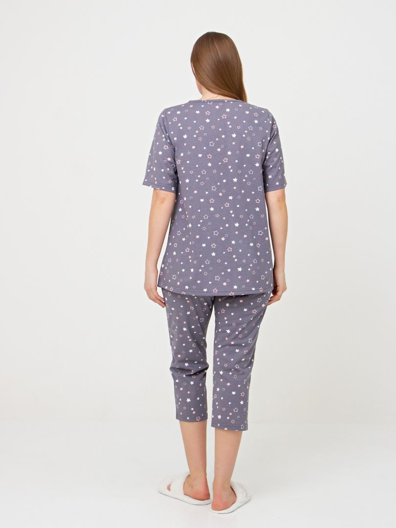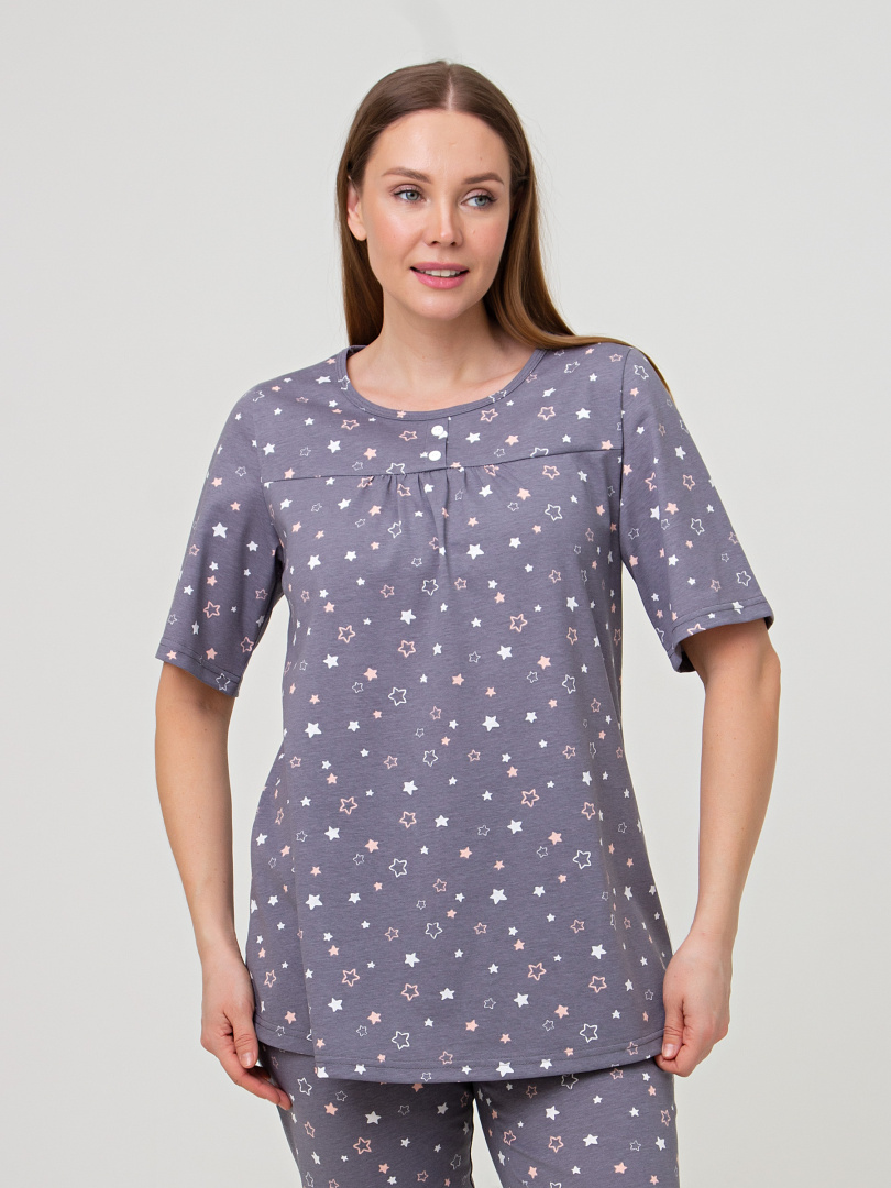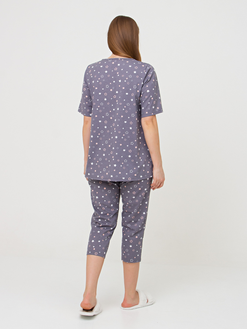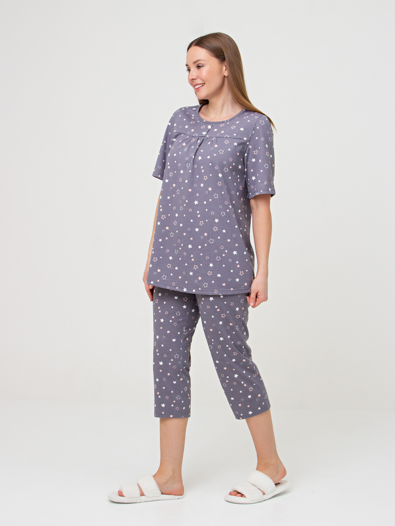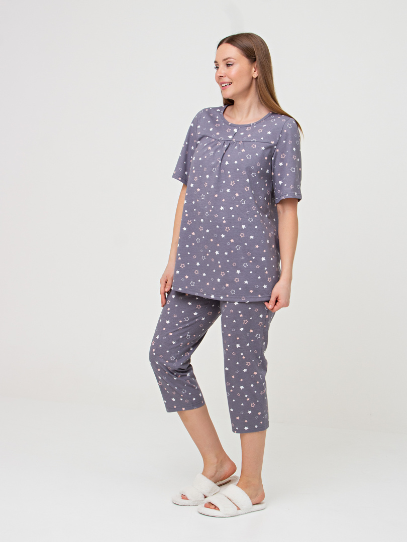 Хлопковая женская трикотажная пижама, состоящая из блузки и бриджей.  Блузка А-образного  свободного силуэта. Короткий втачной рукав.  Круглый вырез горловины. По переду – кокетка с планкой и двумя пуговицами, под ней – небольшая сборка.  Бриджи классические прямые. На талии – резинка.