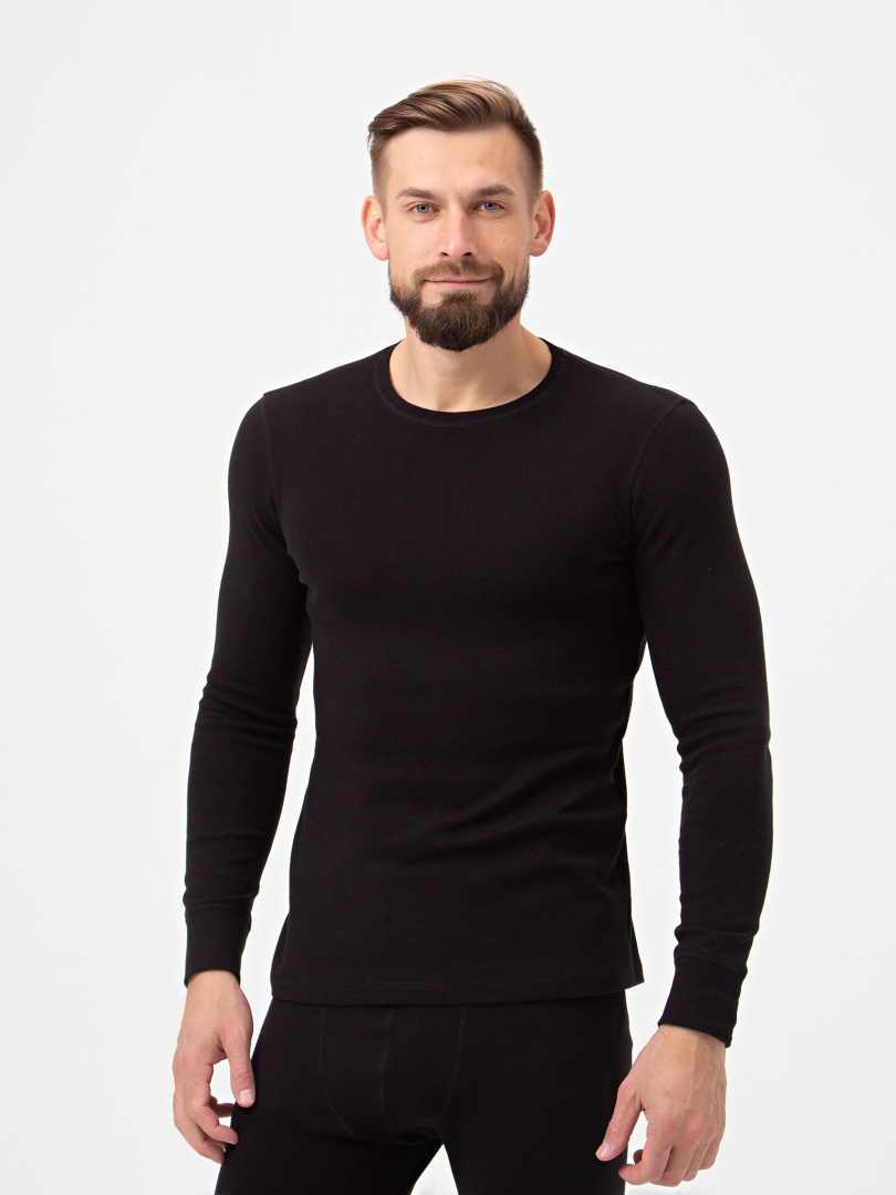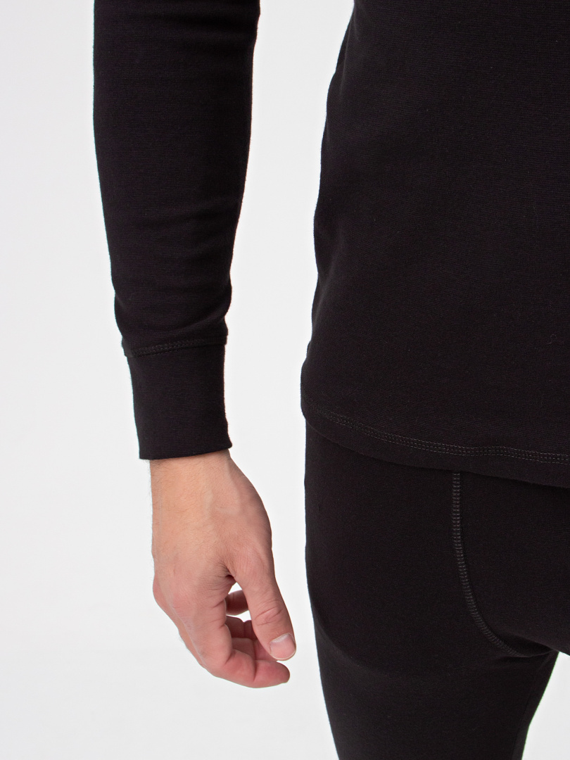 Мужской комплект термобелья состоит из джемпера и кальсон. Джемпер средней длины прилегающего силуэта с удлиненной спинкой. Рукав втачной длинный на манжете. Небольшой круглый вырез горловины. Кальсоны прилегающего покроя на манжете внизу.