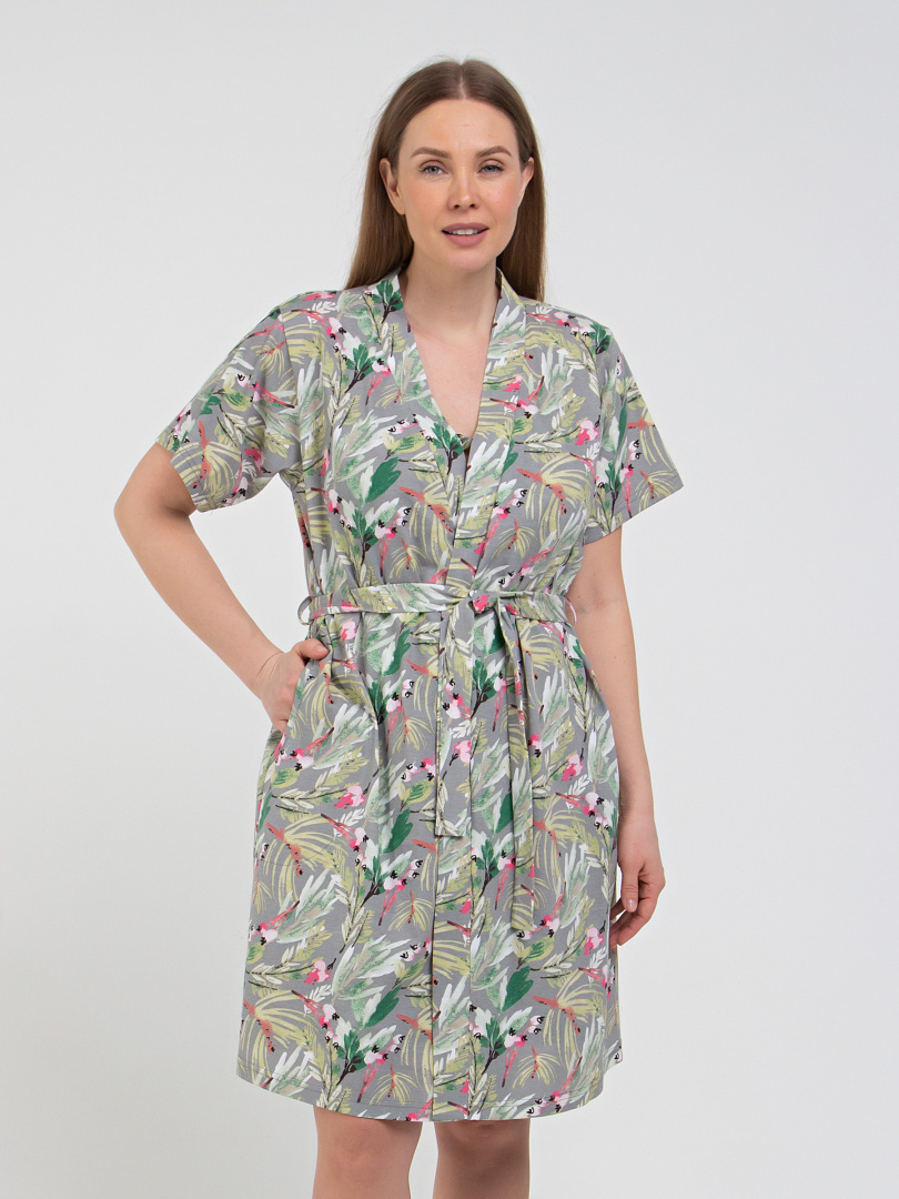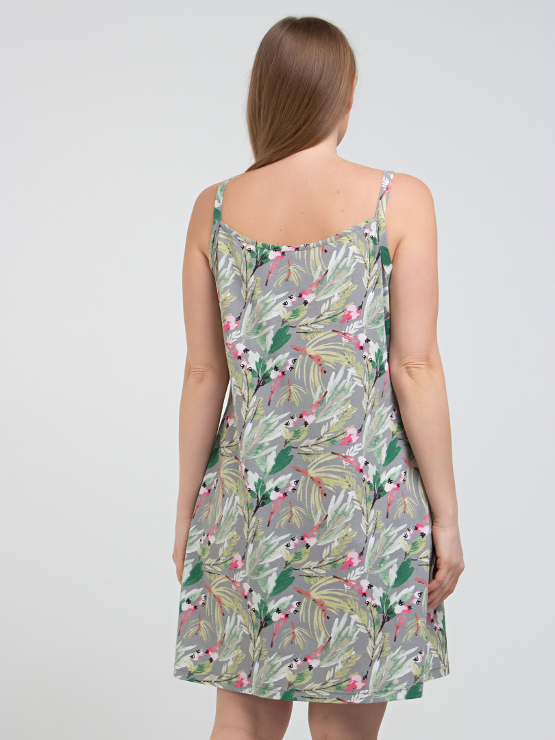 Миниатюрная женская сорочка из хлопкового набивного трикотажа на бретелях. Длина мини и полуприлегающий силуэт. Вырез горловины фигурный. Лиф с кокеткой, присборенной под грудью и по горловине. Горловина и щель на кокетке окантованы отделочной тканью.